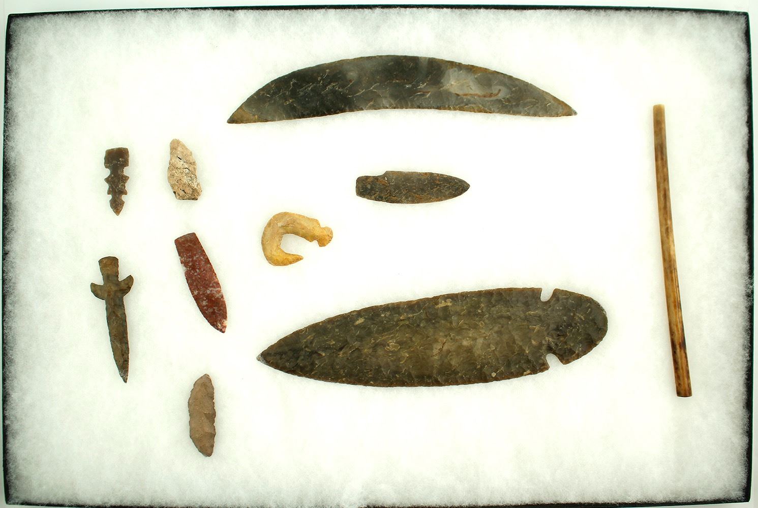 Projectiles, blade, shaft, hooked scraper, scraper, set 5, includes: obsidian, jasper, chert, bone projectile shaft. Ten amazing pieces. The two large pieces could possibly be original chert; they are weathered pieces. Date: Location: Northern Plains HWAC # 52768