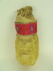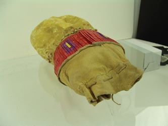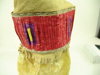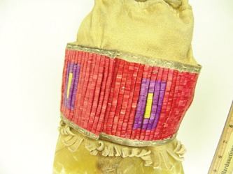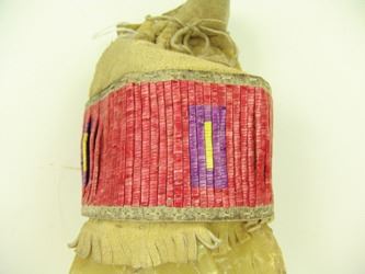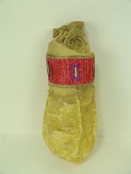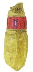 Rare, drawstring bag made from a large buffalo bladder, with a buckskin upper, and with a slatted rawhide band around the top that is covered with beautiful, traditional red quillwork. Very good condition. Early/Mid 1900s. 21"