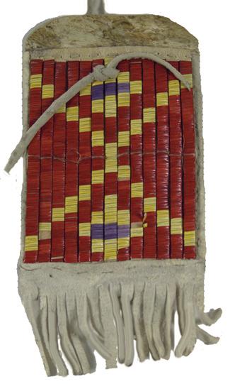 Striking red quilled slat pouch done on parfleche and with buckskin fringe.