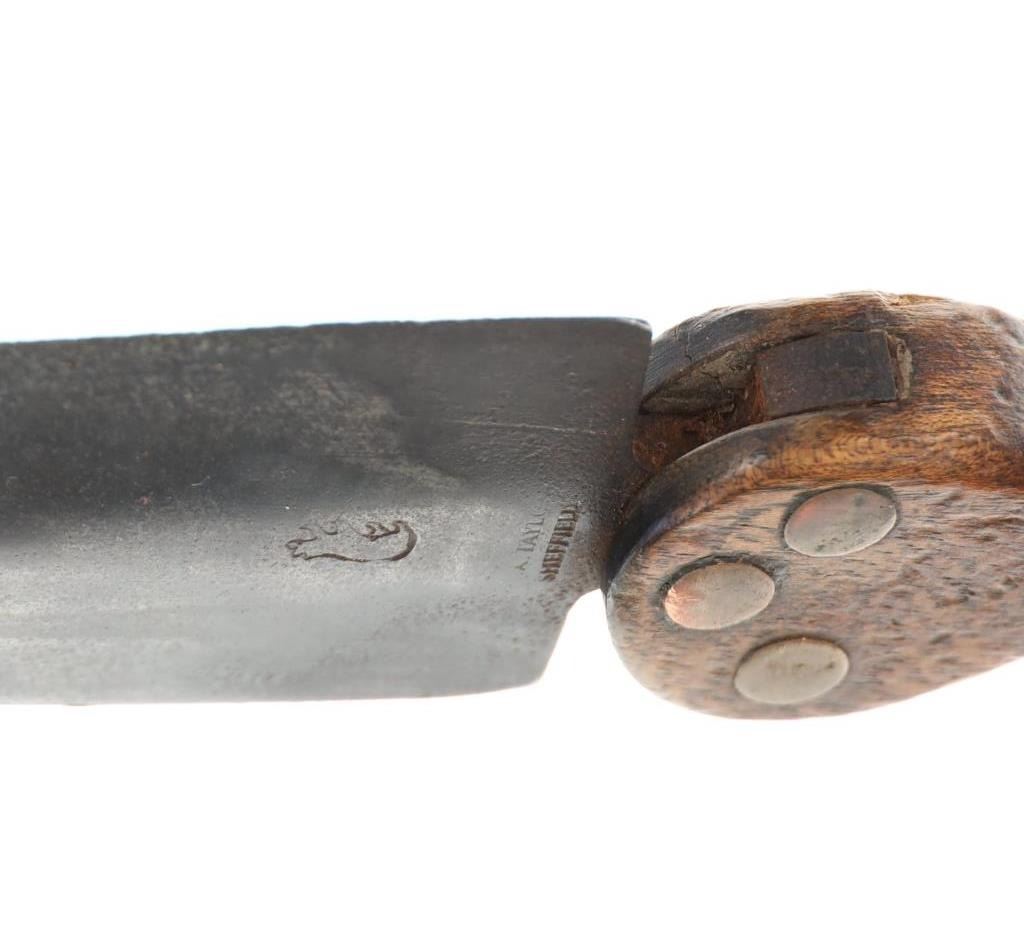 This is an outstanding, second-to-third quarter of the 19th Century presentation dag knife from the Plains Native American Indians from the ex-Arnold Marcus Chernoff and Sherwoods Spirit of America collections. The piece exhibits an A. Taylor Sheffield, England blacksmith forged dag knife with double edge blade having a median ridge running down both sides with a single notch cut. The dag fighting knife has a solid Oak hardwood single piece handle secured with brass pins that are penned over showing a beautiful inlaid brass spot design along the round hand guard area. The round hand guard curves into the gripping area which slightly tapers out to the round pommel end which is inlaid with a round brass inlay. The knife blade is nicely stamped, “A. TAYLOR SHEFFIELD” with a walking bear on all fours touch mark. The knife is paired with an original harness saddle leather sheath with double cut top edge and along the top a graduated row of solid brass old brass trade concho tacks.