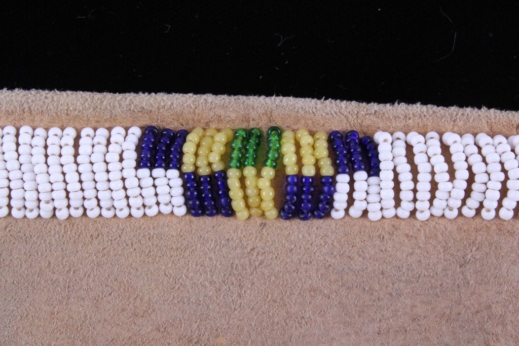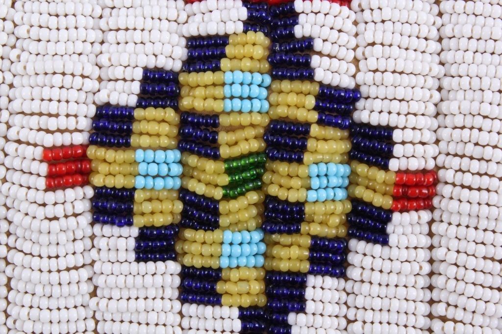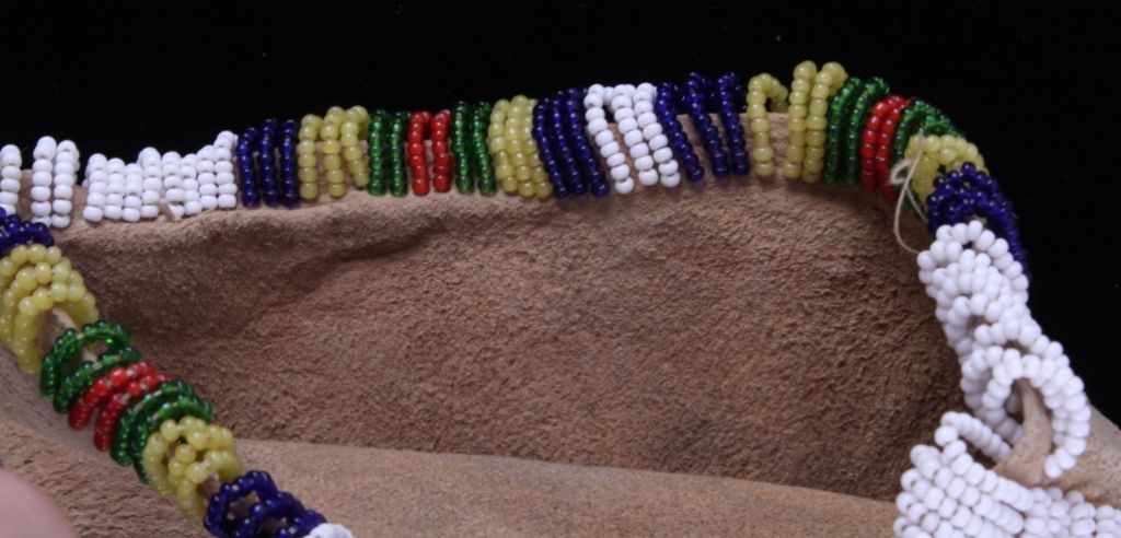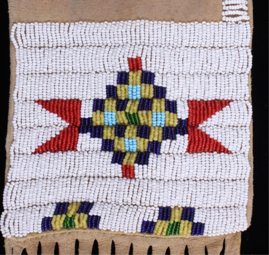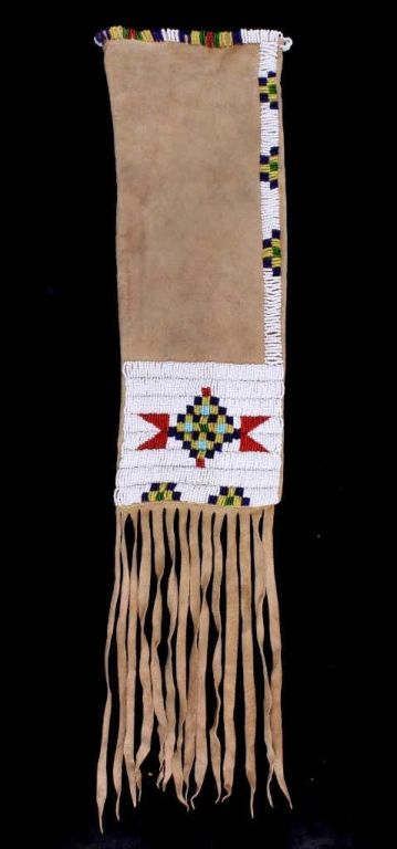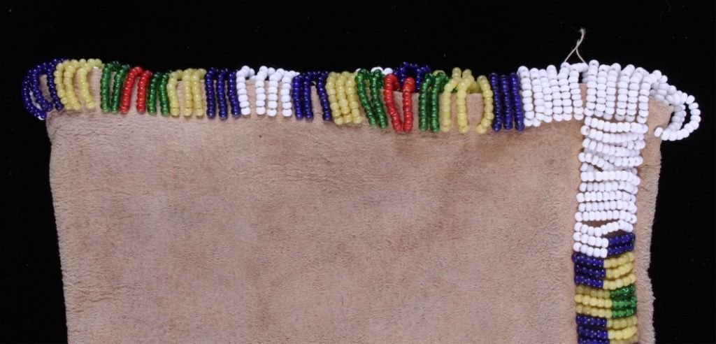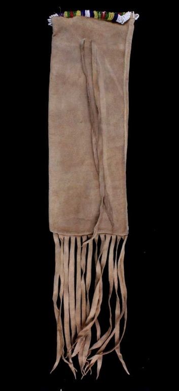 This piece shows a wonderful trade seed beaded design from the Plains Sioux Native American Indians. The piece shows excellent quality and condition from circa 1930. The bag is done on Indian tanned hide with hand cut long fringe. The rare piece measures 14.5"x6.25" with an additional 9.5" fringe.