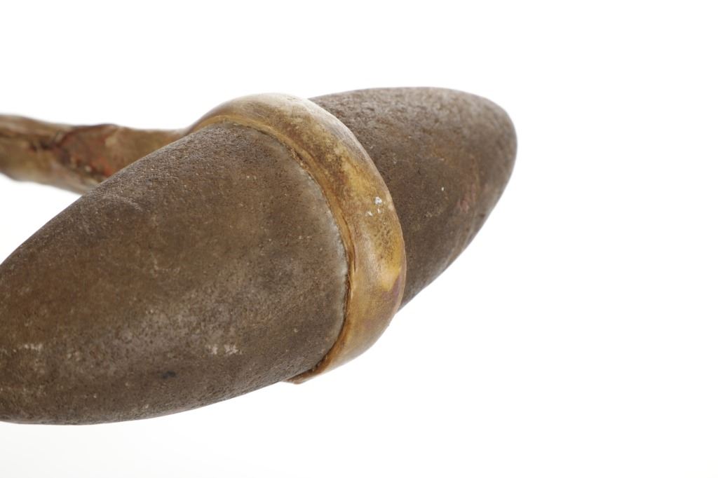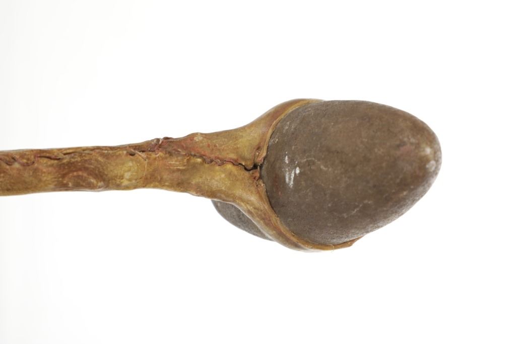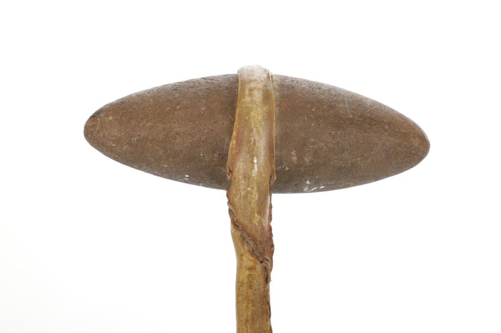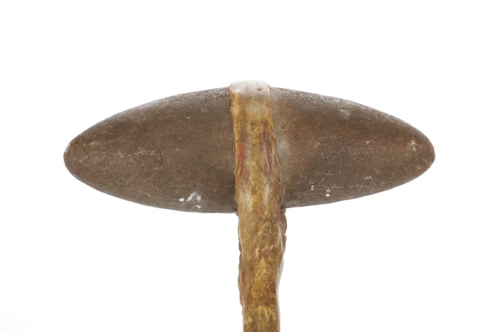 This is an exceedingly rare quartz stone head skullcracker war club for use by horseback from the Plains Native American Indians dating to circa 1870 and from the Bruce VanLandingham Sundog collection. The Indian Wars era piece shows a hand carved bi-point quartz stone war club head which is held onto the haft handle with a wrapping of parfleche rawhide. The wood haft handle is comletely covered in parfleche rawhide which is sewn with rawhide parfleche lacing and the surface has remnants of old red ocher mineral pigment paint. The head has a darkened color from age and use but when a light is held up to the stone it illuminates the quartz. Quartz heads such as this were thought to hold mystical power, other quartz heads have been documented as being used by the Northern Plains and Sioux. The large size with long haft lend to use on horseback creating immense force. Provenance: From the renowned Sundog Fine Art Bozeman, Montana collection by Bruce VanLandingham. Bruce VanLandingham was a pillar in the American Indian collecting community and a respected expert. Along with being an avid collector, Bruce was also the sole owner of Sundog Fine Art Gallery in Bozeman, which was both part museum and gallery, this piece is directly from the collection. Shows good condition with no major breaks and a nice even honest patina throughout. Measures 27.25"L by 6 1/8"W by 2 5/8"D. Museum collection number E1068.