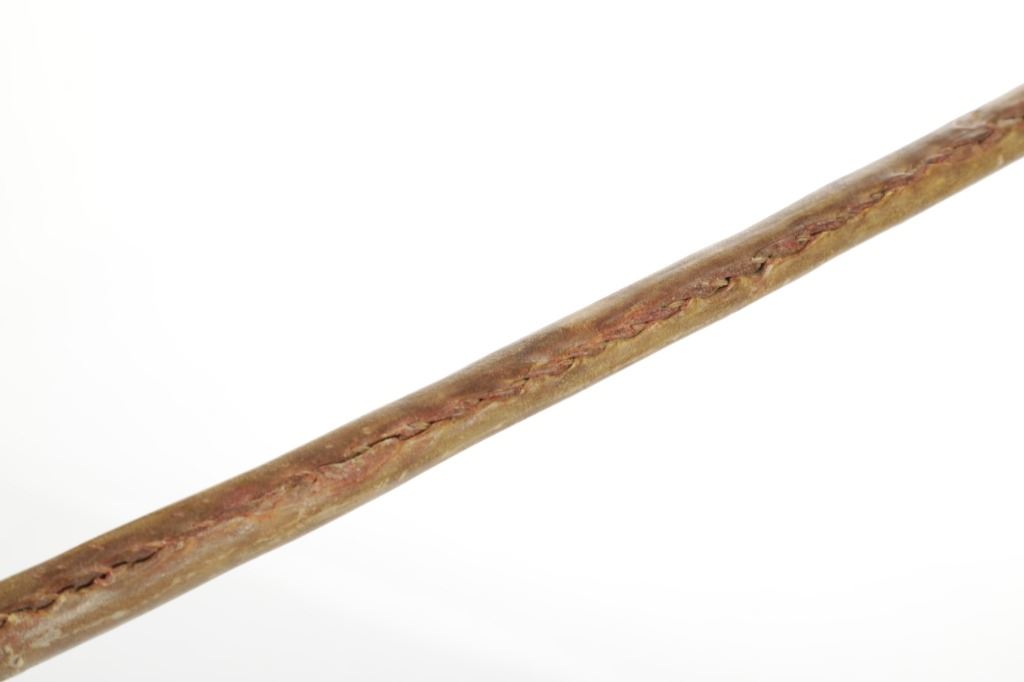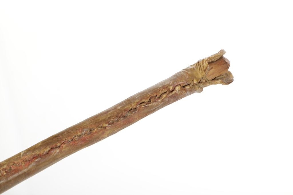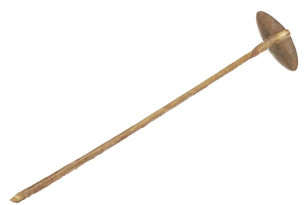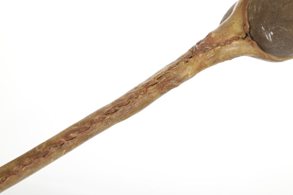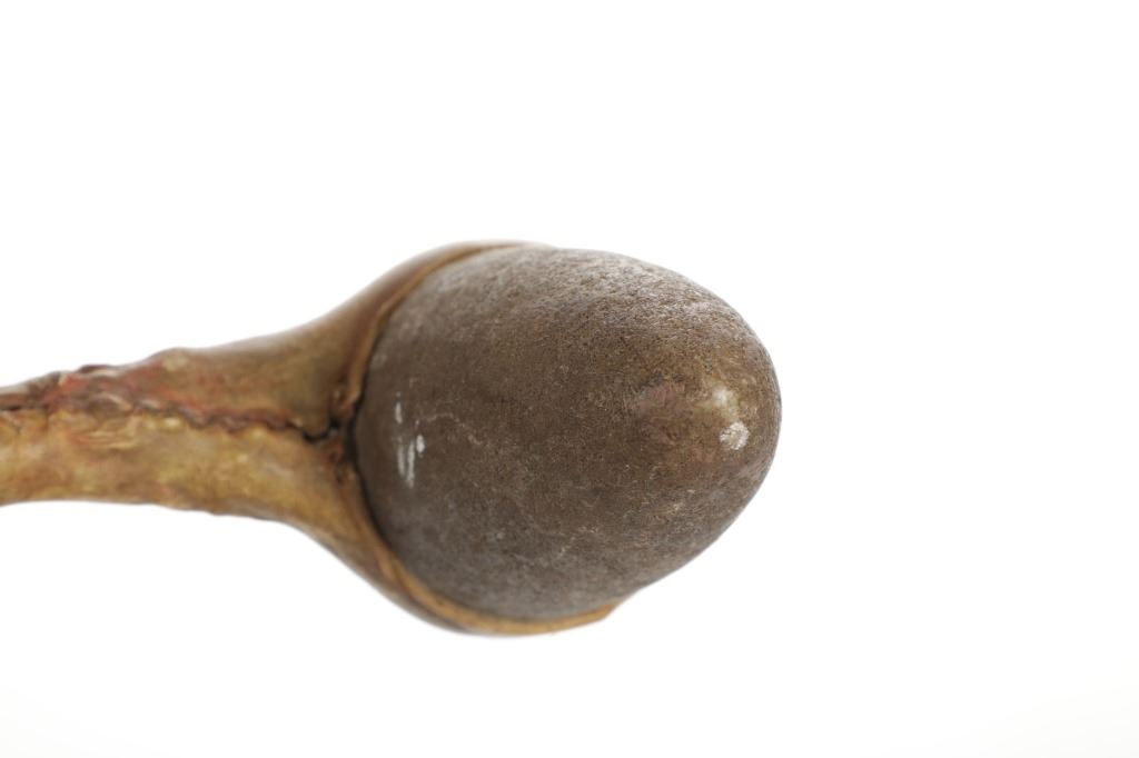 This is an exceedingly rare quartz stone head skullcracker war club for use by horseback from the Plains Native American Indians dating to circa 1870 and from the Bruce VanLandingham Sundog collection. The Indian Wars era piece shows a hand carved bi-point quartz stone war club head which is held onto the haft handle with a wrapping of parfleche rawhide. The wood haft handle is comletely covered in parfleche rawhide which is sewn with rawhide parfleche lacing and the surface has remnants of old red ocher mineral pigment paint. The head has a darkened color from age and use but when a light is held up to the stone it illuminates the quartz. Quartz heads such as this were thought to hold mystical power, other quartz heads have been documented as being used by the Northern Plains and Sioux. The large size with long haft lend to use on horseback creating immense force. Provenance: From the renowned Sundog Fine Art Bozeman, Montana collection by Bruce VanLandingham. Bruce VanLandingham was a pillar in the American Indian collecting community and a respected expert. Along with being an avid collector, Bruce was also the sole owner of Sundog Fine Art Gallery in Bozeman, which was both part museum and gallery, this piece is directly from the collection. Shows good condition with no major breaks and a nice even honest patina throughout. Measures 27.25"L by 6 1/8"W by 2 5/8"D. Museum collection number E1068.