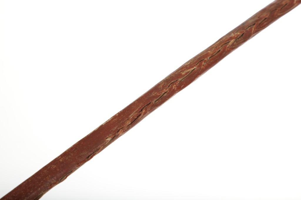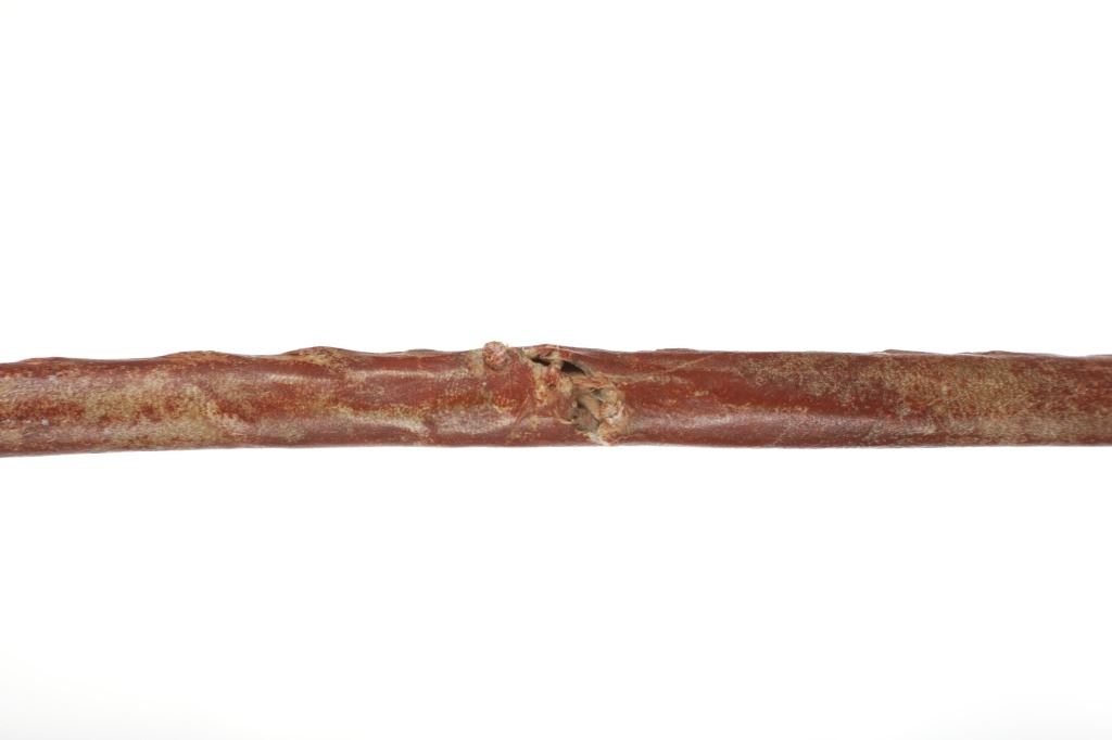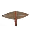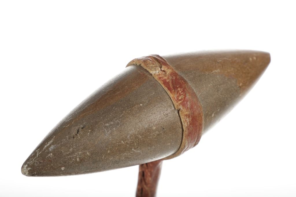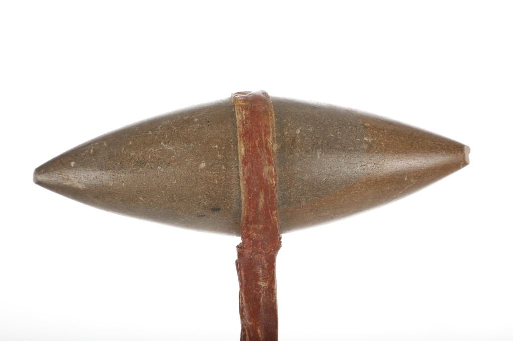 The lot features a bi-point stone war club / dance club from the Plains Native American Indians and dating to circa 1880. The piece shows a bi-point stone carved head secured with a wrapping of parfleche into the grooved ridge and hole holding the wood haft. The wood haft is completely covered in parfleche rawhide which has a red ocher mineral pigment coloring and is sewn with parfleche rawhide lacing. The piece has a solid condition and is thought to be a dance club due to the shiny surface and clean pointed head, unlike war club examples which have more rounded points and rough surface from excessive use. Provenance: From the renowned Sundog Fine Art Bozeman, Montana collection by Bruce VanLandingham. Bruce VanLandingham was a pillar in the American Indian collecting community and a respected expert. Along with being an avid collector, Bruce was also the sole owner of Sundog Fine Art Gallery in Bozeman, which was both part museum and gallery, this piece is directly from the collection. Measures overall 24 3/8"L by 6.25"W by 2.25"D. Museum collection number E1068.