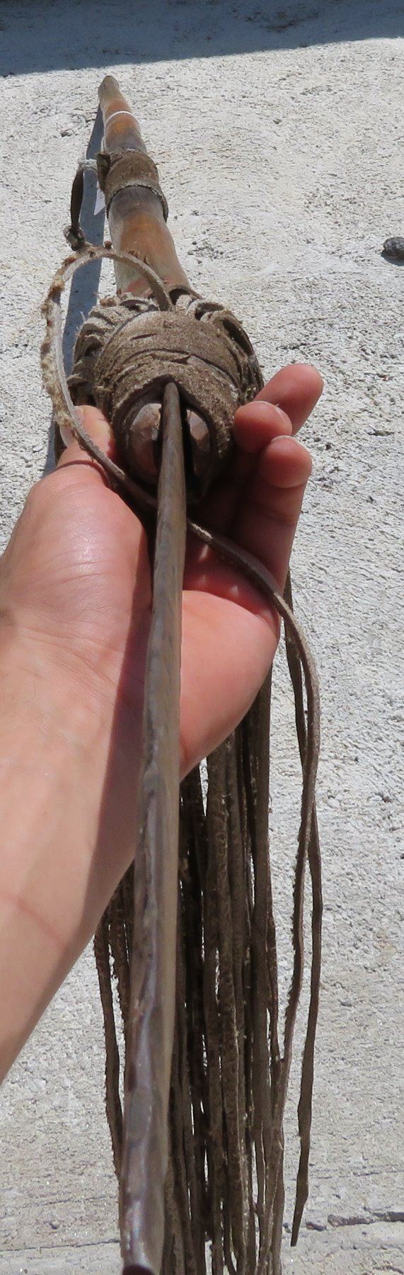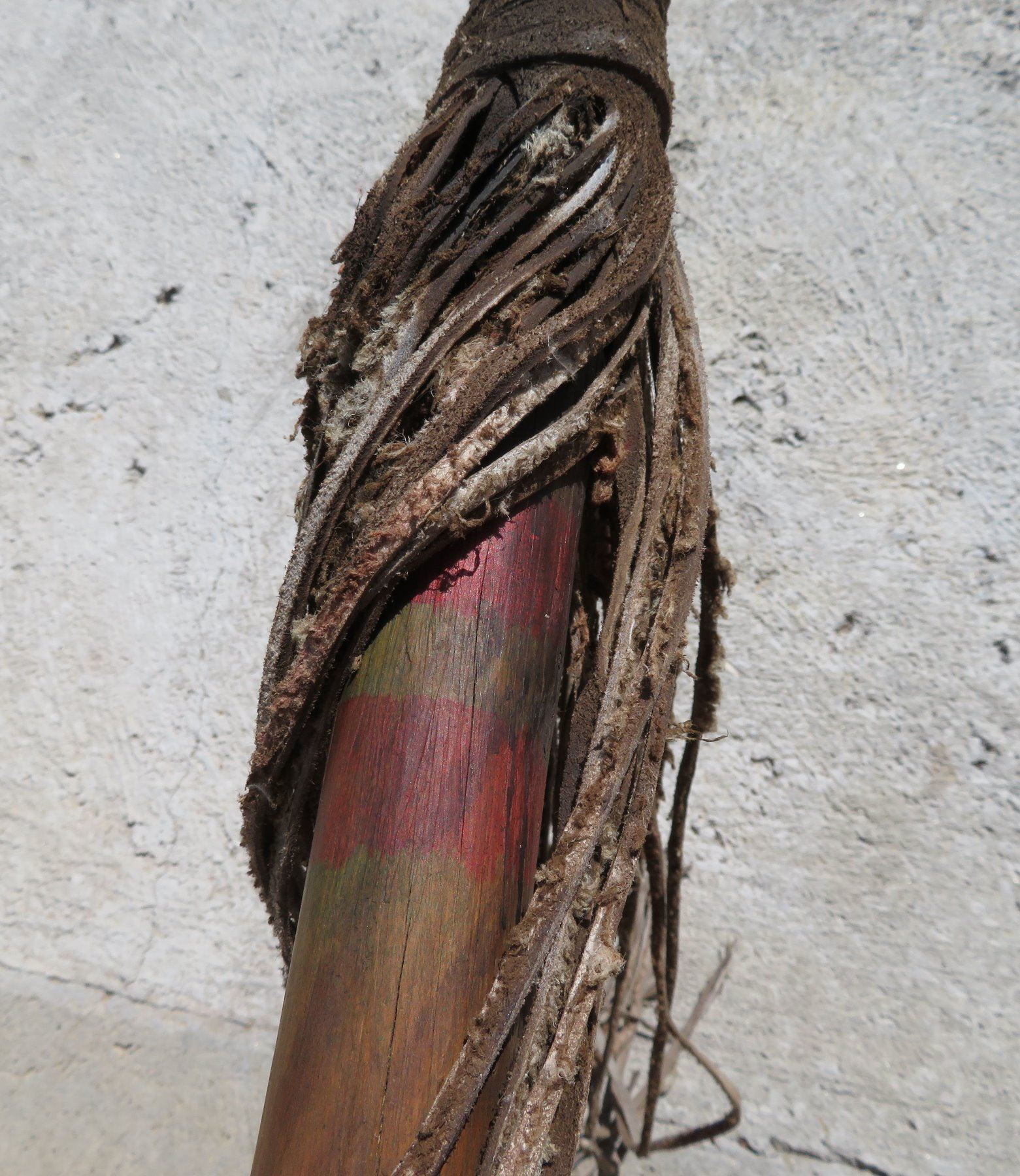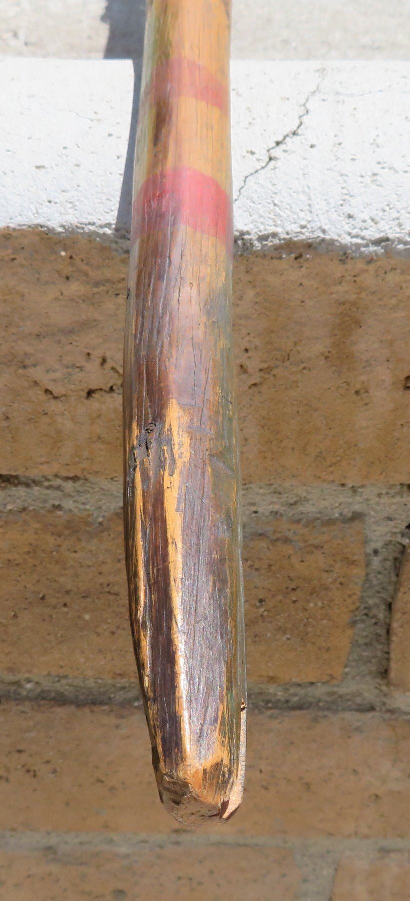 Plains Spear, 20th century item. Made of wood, paint, buckskin, heavy fringe, the item measures 6 feet overall, with a 1 foot spearpoint. Southern Plains, Comanche, Kiowa. Older plains lance with 12" iron spearpoint and banded paint design. Condition: Good, nice patina and some wear, see images. Shipping: $72.50 USA estimate only, w/insurance and signature, due to size and weight.