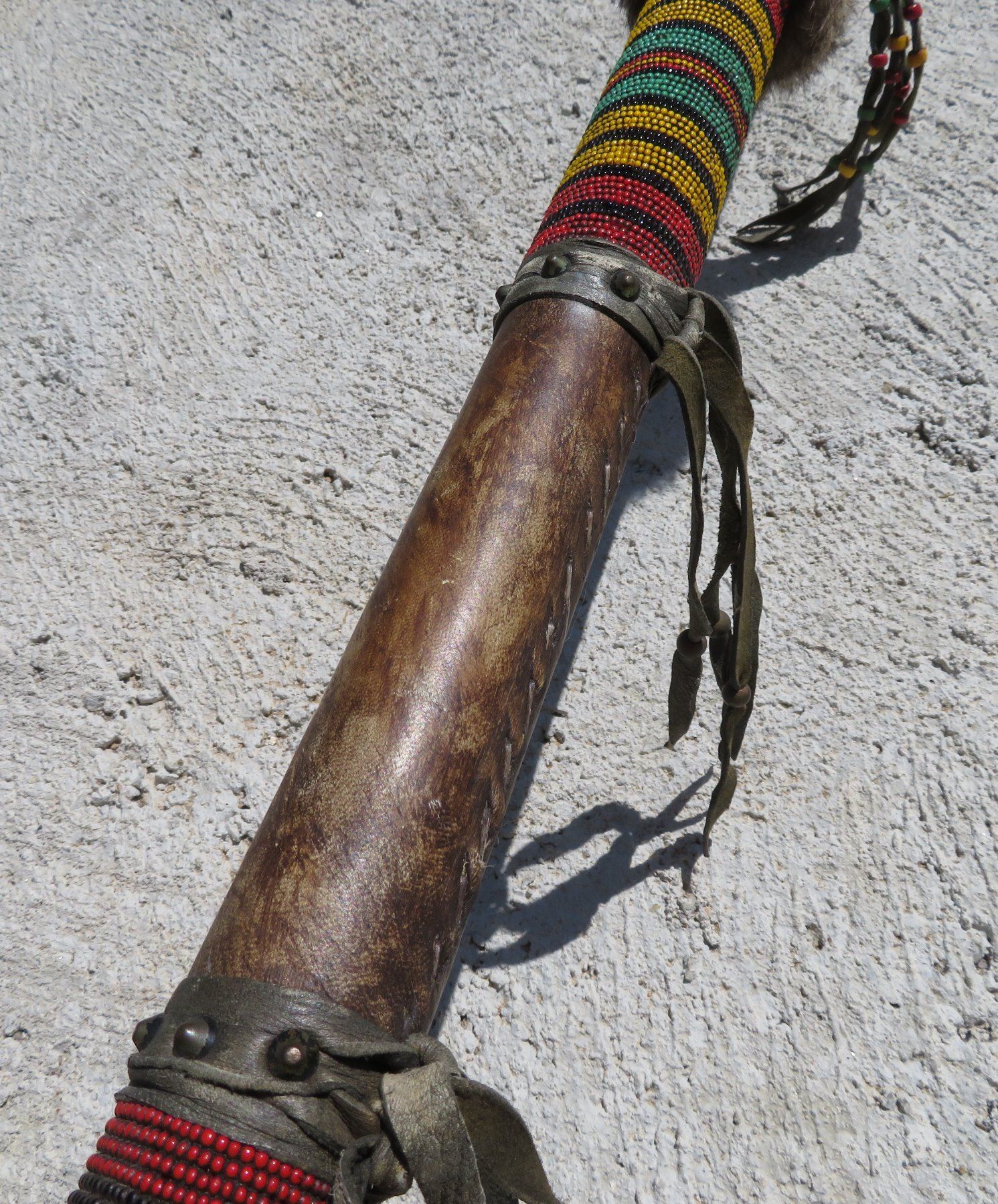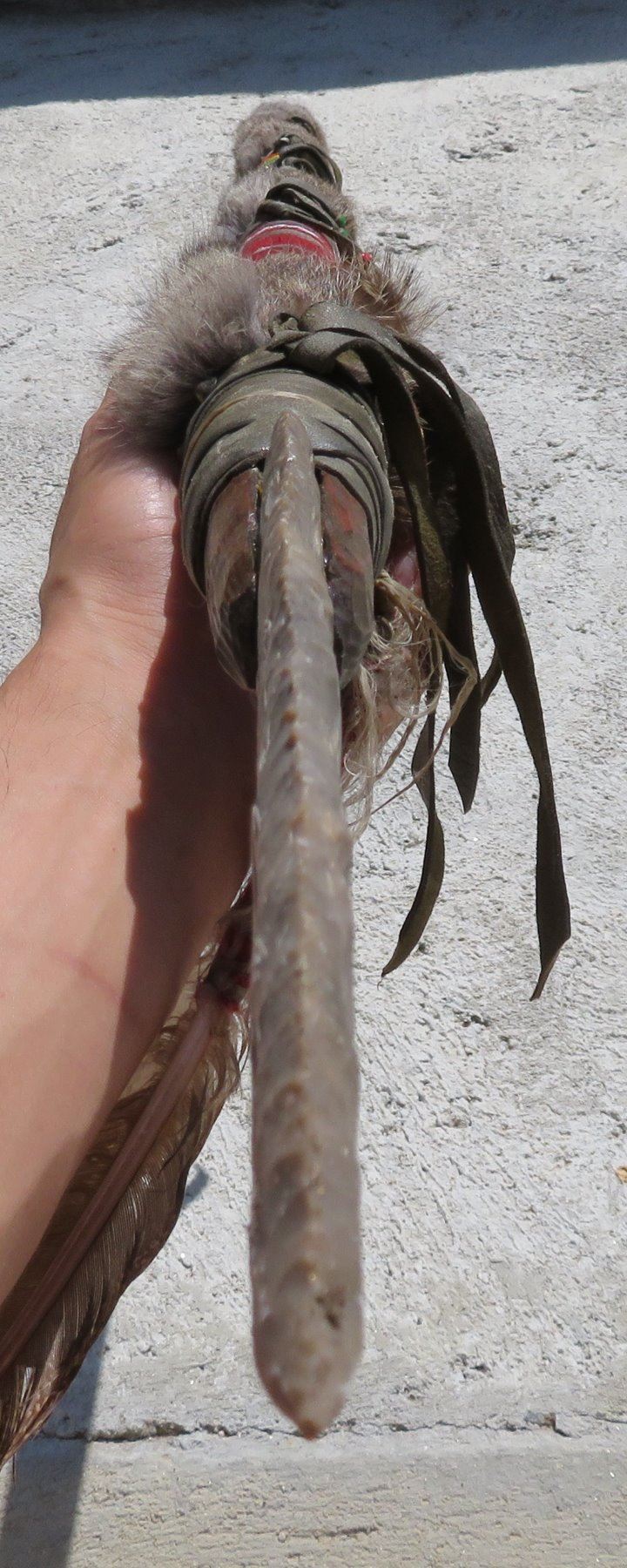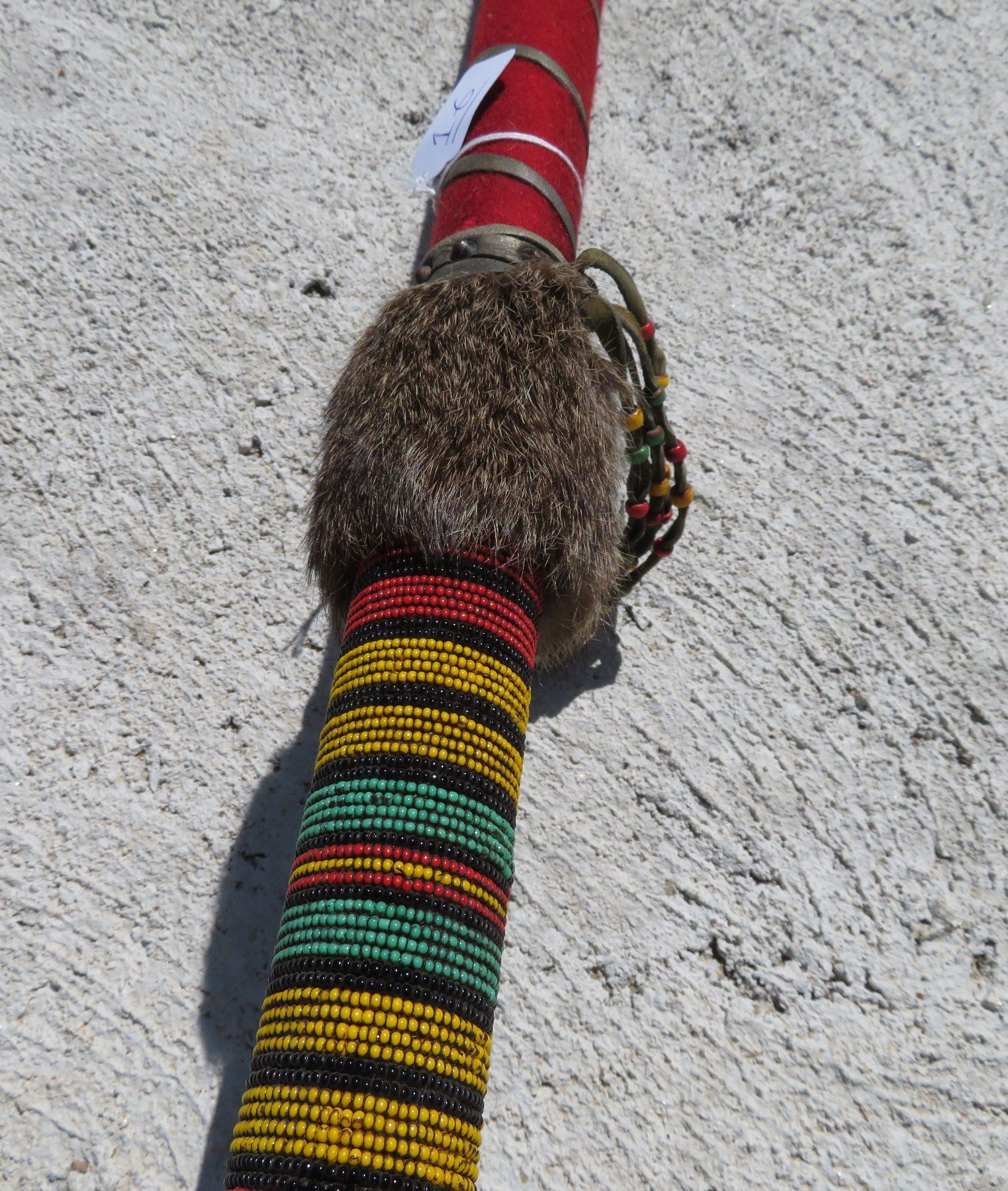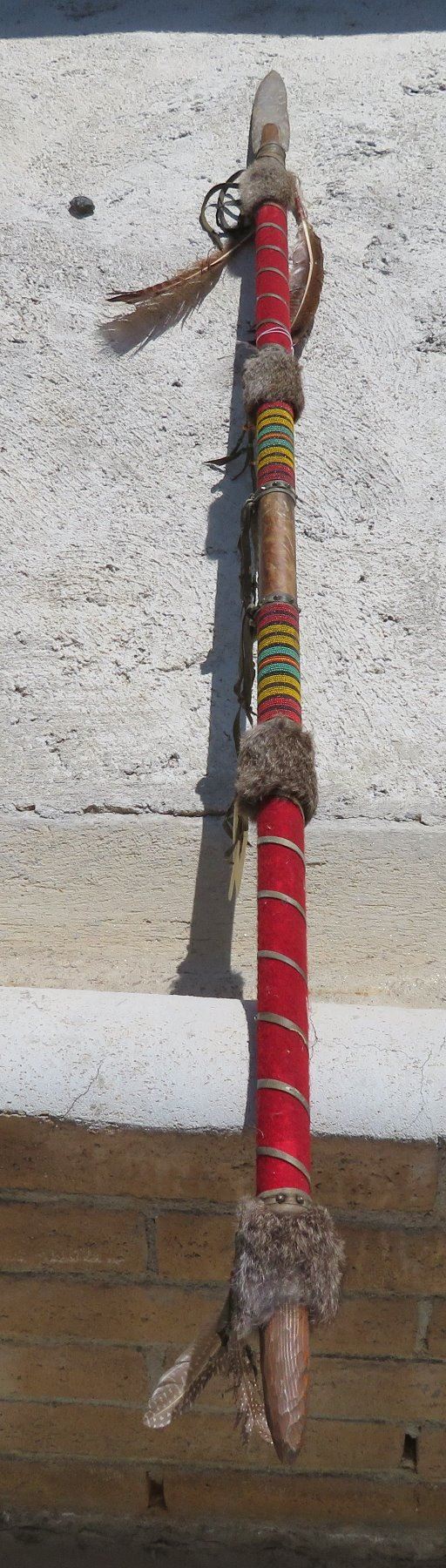Plains Spear, c. 1950s. Made of wood wrapped with red selvedge cloth, tacks, buckskin, fur, seed beads and feathers, flint blade, the item is 75" overall with a 9 1/4" spearpoint. Central Plains, Sioux. Hunting-war spear. Condition: Good, some signs of wear, see images. Shipping: $75.00 USA estimate only, due to length, weight, and value, w/insurance and signature.