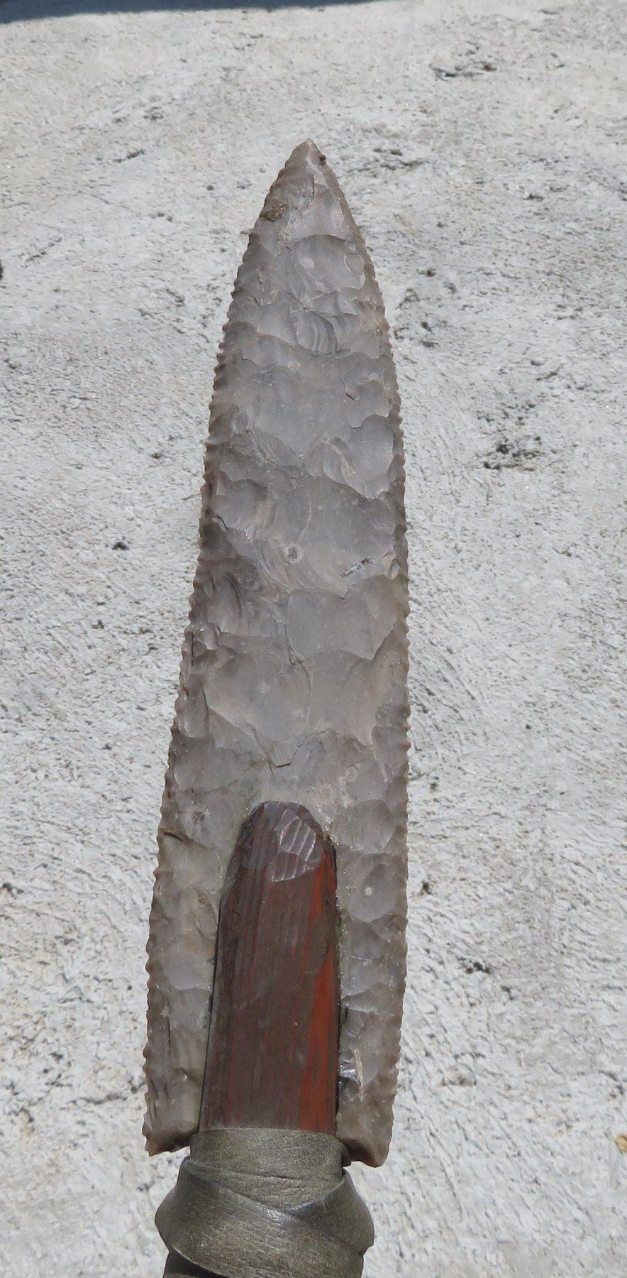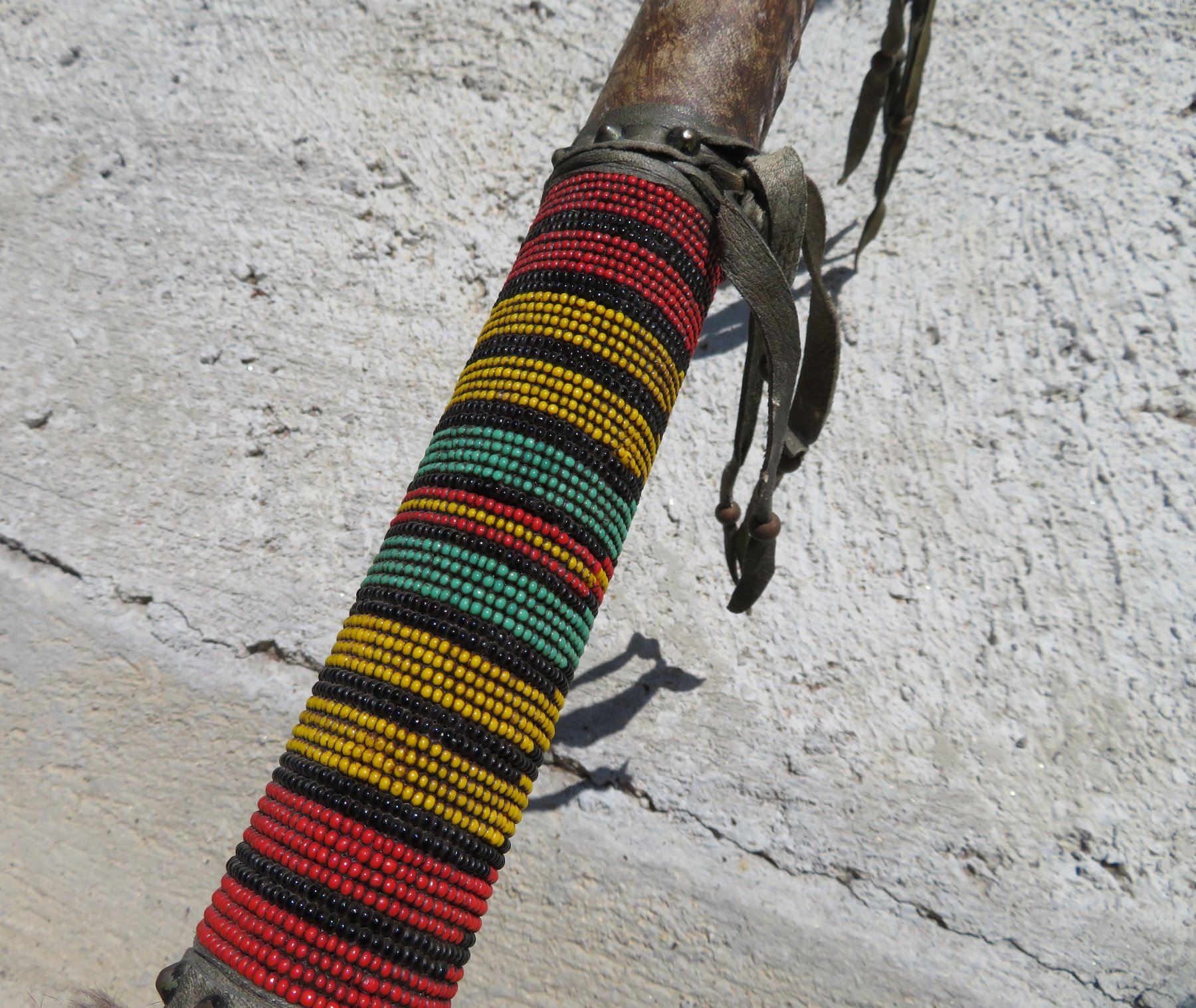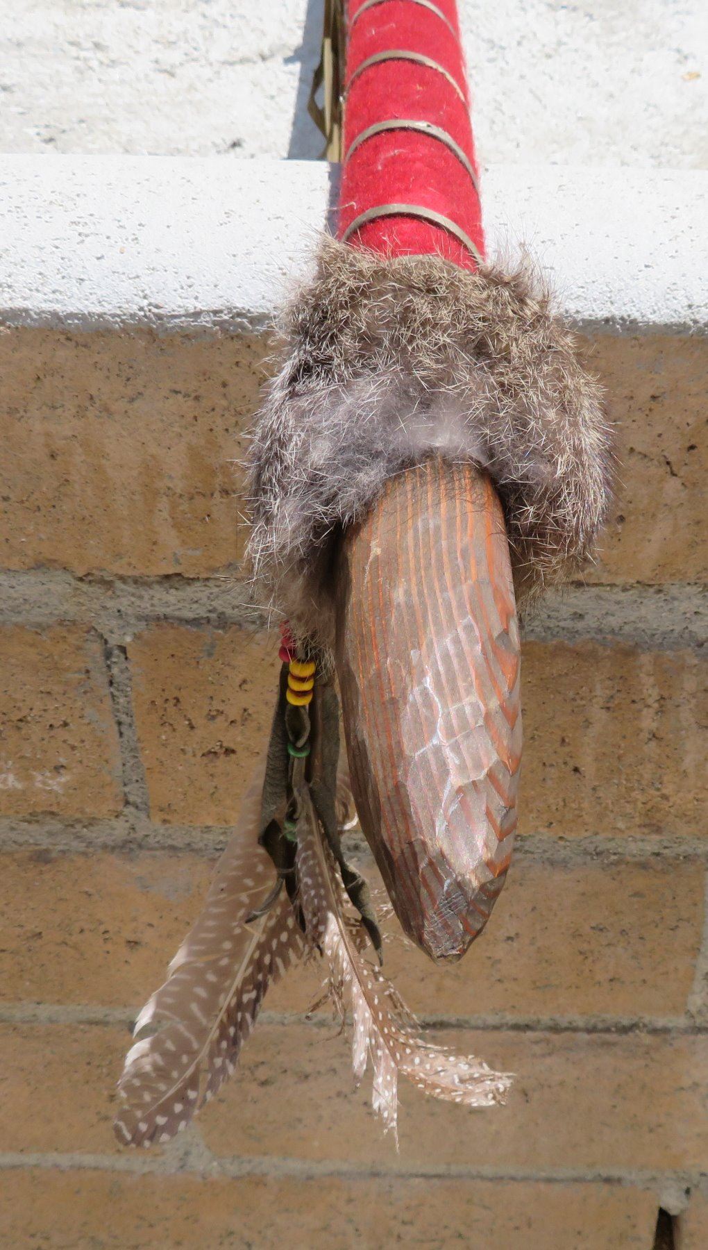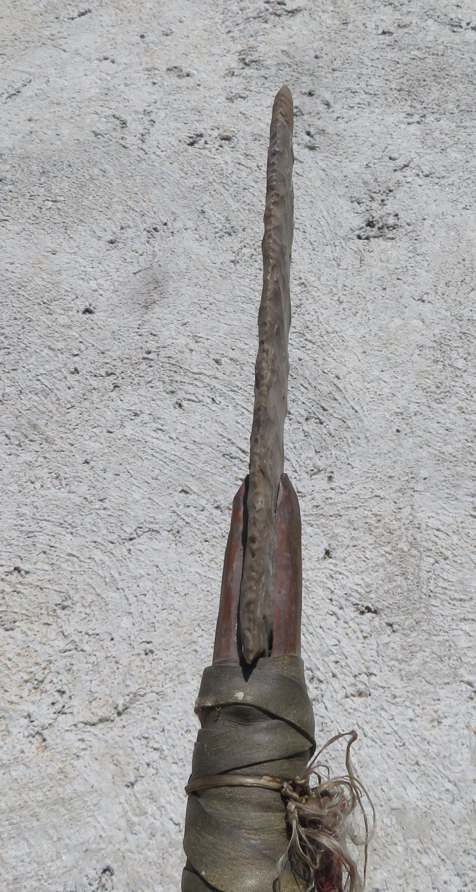 Plains Spear, c. 1950s. Made of wood wrapped with red selvedge cloth, tacks, buckskin, fur, seed beads and feathers, flint blade, the item is 75" overall with a 9 1/4" spearpoint. Central Plains, Sioux. Hunting-war spear. Condition: Good, some signs of wear, see images. Shipping: $75.00 USA estimate only, due to length, weight, and value, w/insurance and signature.