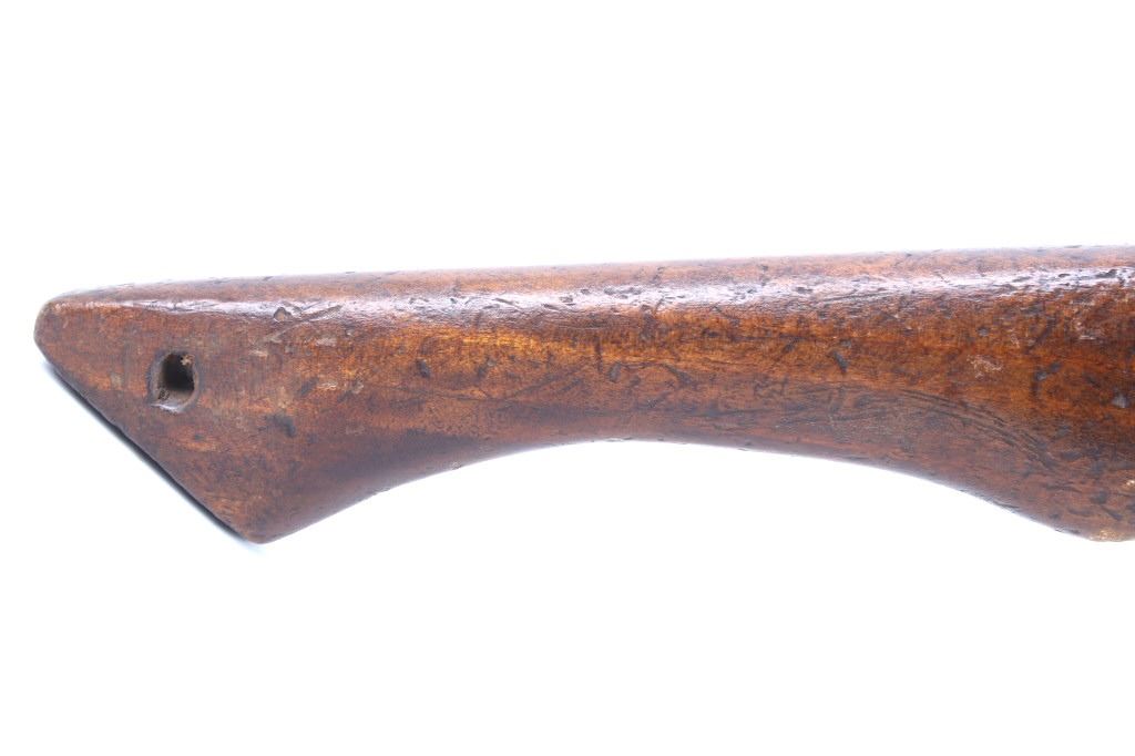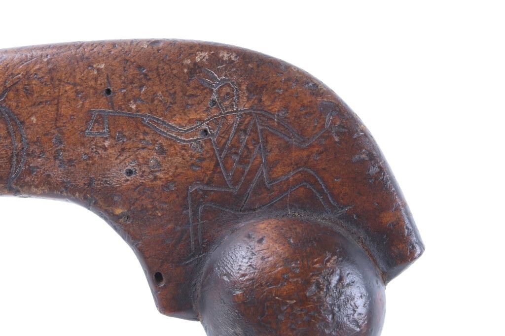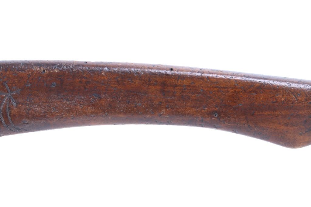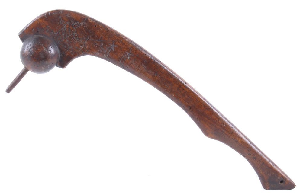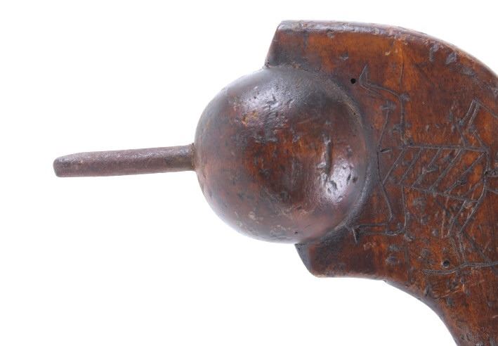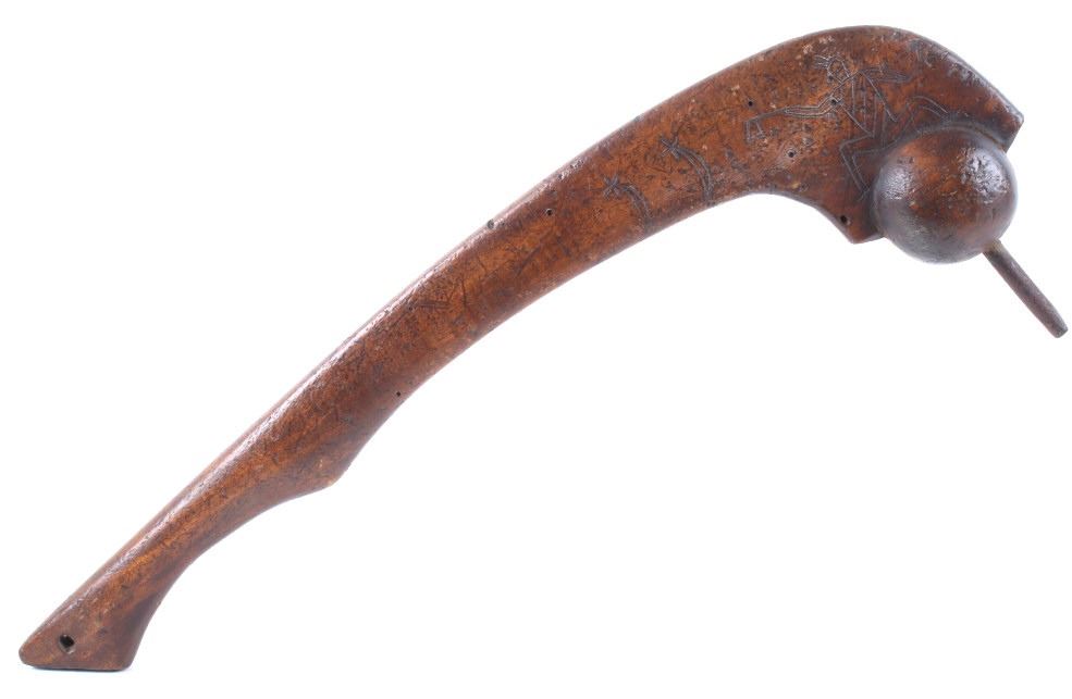 The lot features a spike ball head war club from the Plains Native American Indians of the 19th Century. The piece shows a one-piece carved wood construction with spherical ball head at the front which is secured with an iron spike held into place with poured led. The club itself shows a typical Plains Indian pattern with prominent ball being integral to the “U” like curved section of the haft being flat at the top and tapering to a rounded surface having a gripping area which is framed at the front and rear with a pointed drop at the base. The base of the haft triangular pointed pommel which is pierced and would have held a drop of feathers, beadwork, or wrist throng. The surface of the club is engraved / carved with a pictorial scene showing a similar Indian Warrior on each side both holding a quirt or arrow and one holding a bow and the other a war club tomahawk also showing a moon and stars scene. The piece has various small carvings, dents and dings which likely could hold a deeper meaning. The club has a nice medium to dark coloring from honest age and use. The club is very similar to the example documented in Harold L. Peterson’s 1965 book “American Indian Tomahawks” on page 86 figure / photograph 6; this example having the same general shape with low spherical ball sitting in a “U” cup with flat wood haft curving at the back and tapering to the gripping area showing a drop point above and below the gripping area finished by a triangular stepped pommel, attributed as being 19th Century collected in Iowa and typically Western. Provenance: From a historic Eastern Montana American Indian Collection, where the piece was found to be an authentic original, one of the finest collections of American Indian weaponry and antiquities in Montana. Measures 21 1/8”L by 6 7/8”W, the ball is 2 5/8” diameter with the spike being 2 1/8”L.