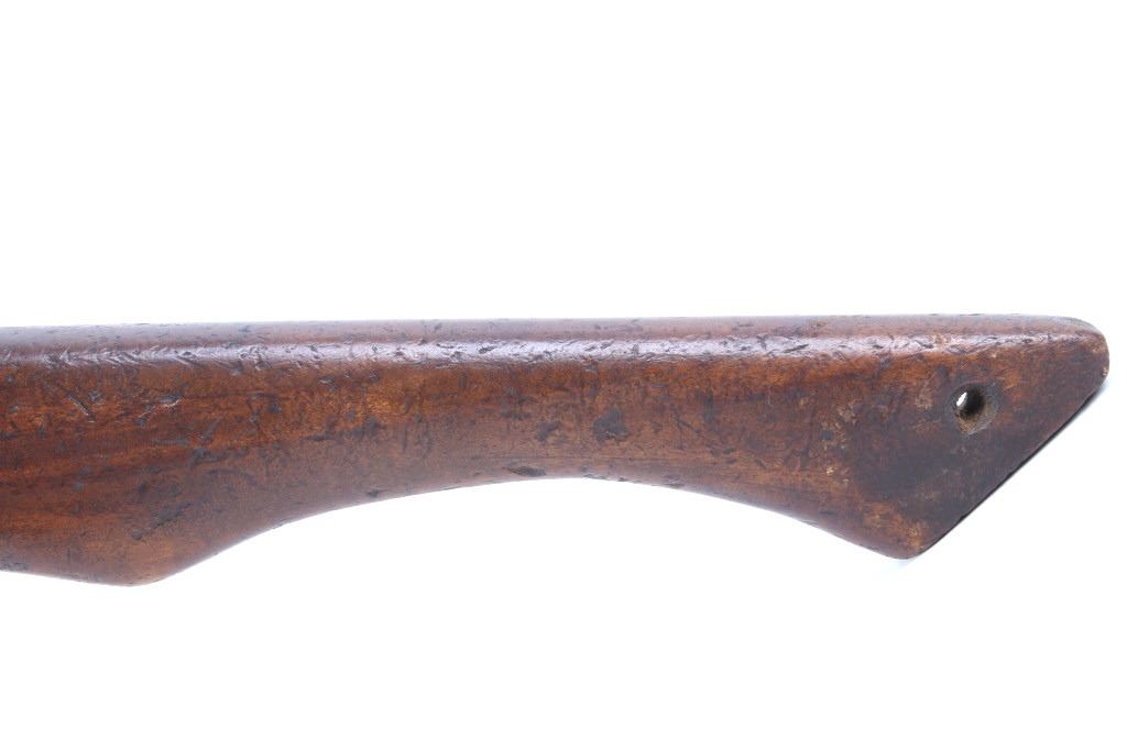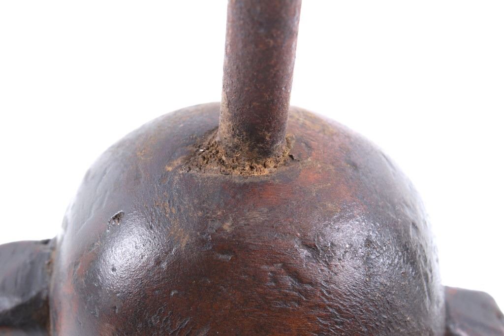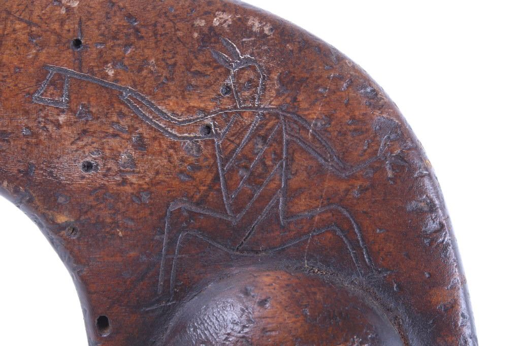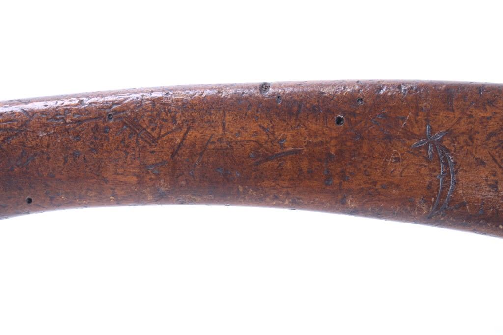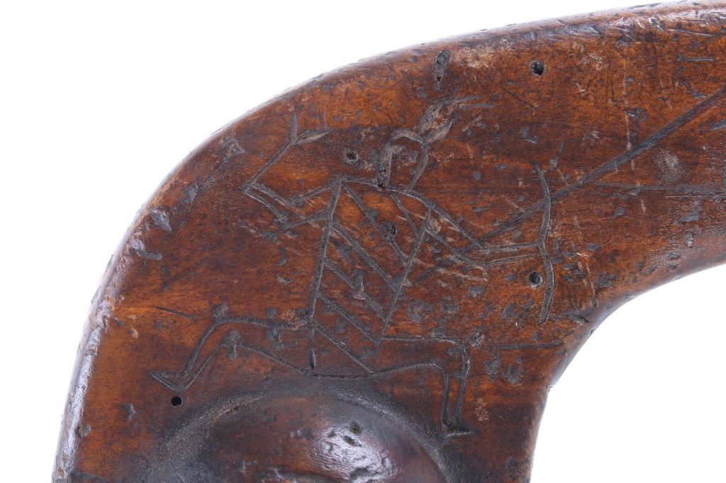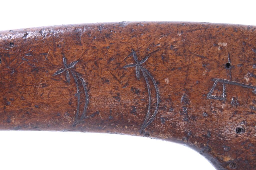The lot features a spike ball head war club from the Plains Native American Indians of the 19th Century. The piece shows a one-piece carved wood construction with spherical ball head at the front which is secured with an iron spike held into place with poured led. The club itself shows a typical Plains Indian pattern with prominent ball being integral to the “U” like curved section of the haft being flat at the top and tapering to a rounded surface having a gripping area which is framed at the front and rear with a pointed drop at the base. The base of the haft triangular pointed pommel which is pierced and would have held a drop of feathers, beadwork, or wrist throng. The surface of the club is engraved / carved with a pictorial scene showing a similar Indian Warrior on each side both holding a quirt or arrow and one holding a bow and the other a war club tomahawk also showing a moon and stars scene. The piece has various small carvings, dents and dings which likely could hold a deeper meaning. The club has a nice medium to dark coloring from honest age and use. The club is very similar to the example documented in Harold L. Peterson’s 1965 book “American Indian Tomahawks” on page 86 figure / photograph 6; this example having the same general shape with low spherical ball sitting in a “U” cup with flat wood haft curving at the back and tapering to the gripping area showing a drop point above and below the gripping area finished by a triangular stepped pommel, attributed as being 19th Century collected in Iowa and typically Western. Provenance: From a historic Eastern Montana American Indian Collection, where the piece was found to be an authentic original, one of the finest collections of American Indian weaponry and antiquities in Montana. Measures 21 1/8”L by 6 7/8”W, the ball is 2 5/8” diameter with the spike being 2 1/8”L.