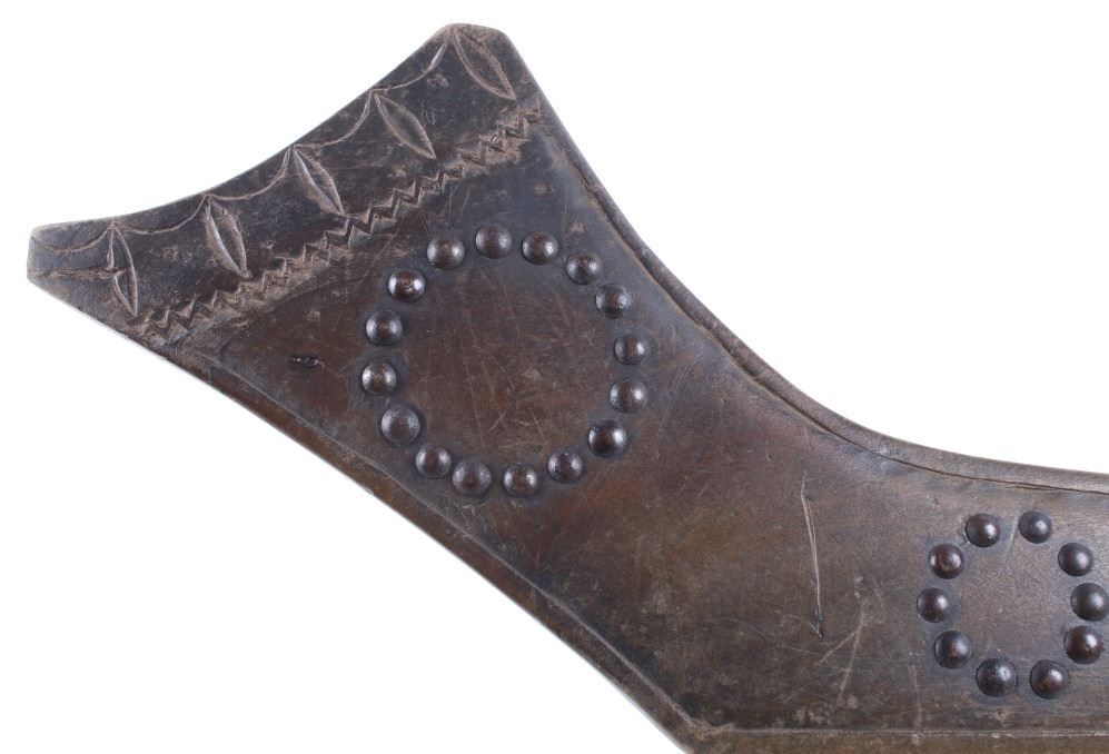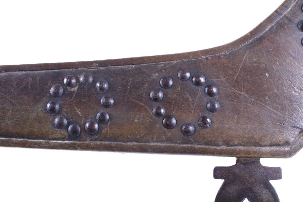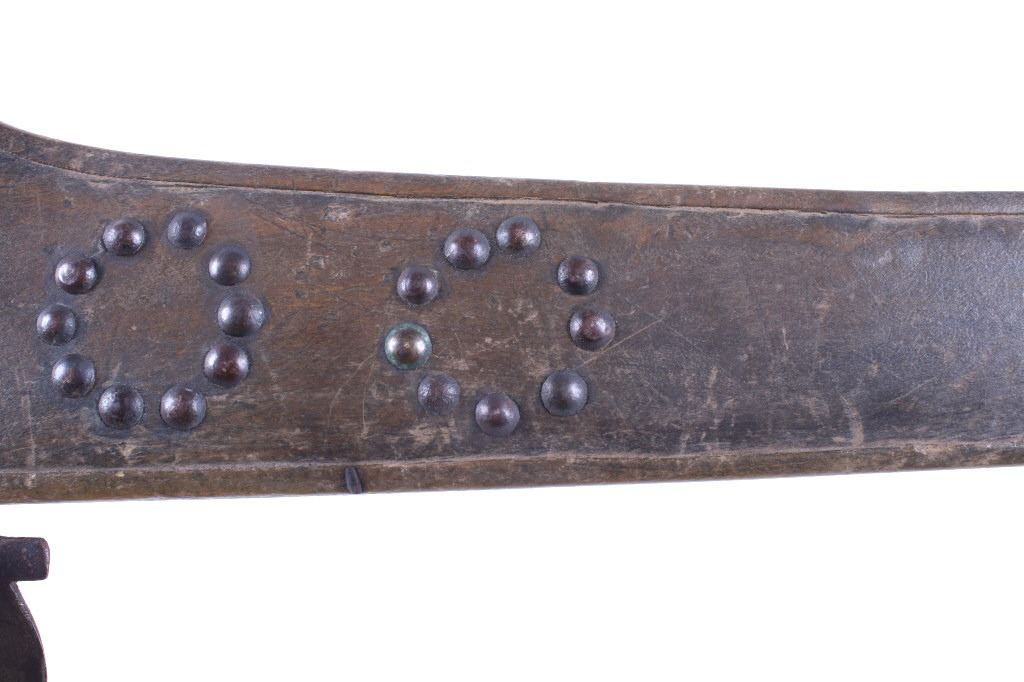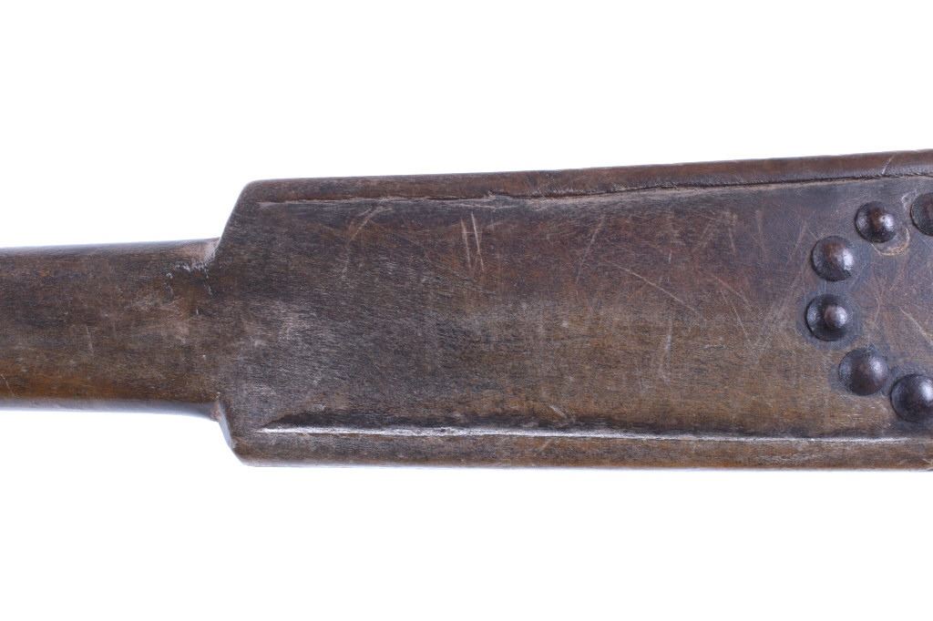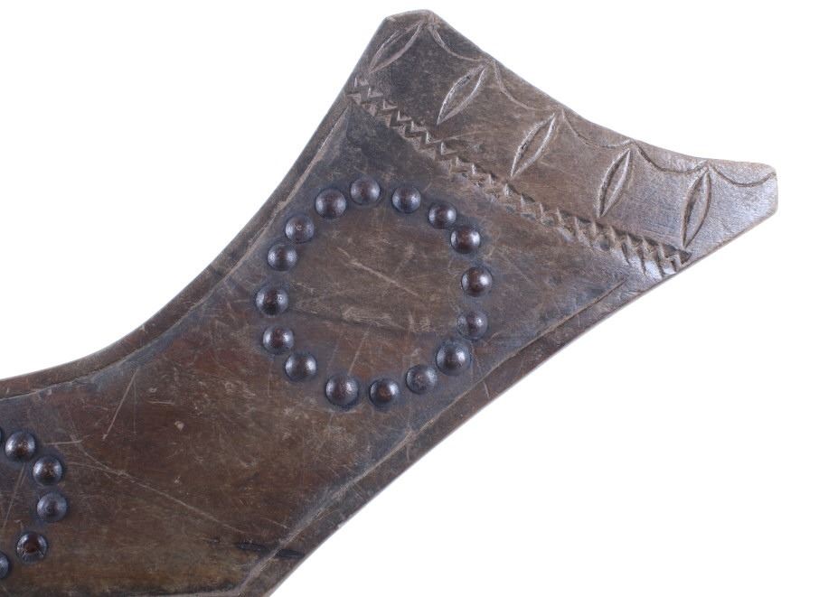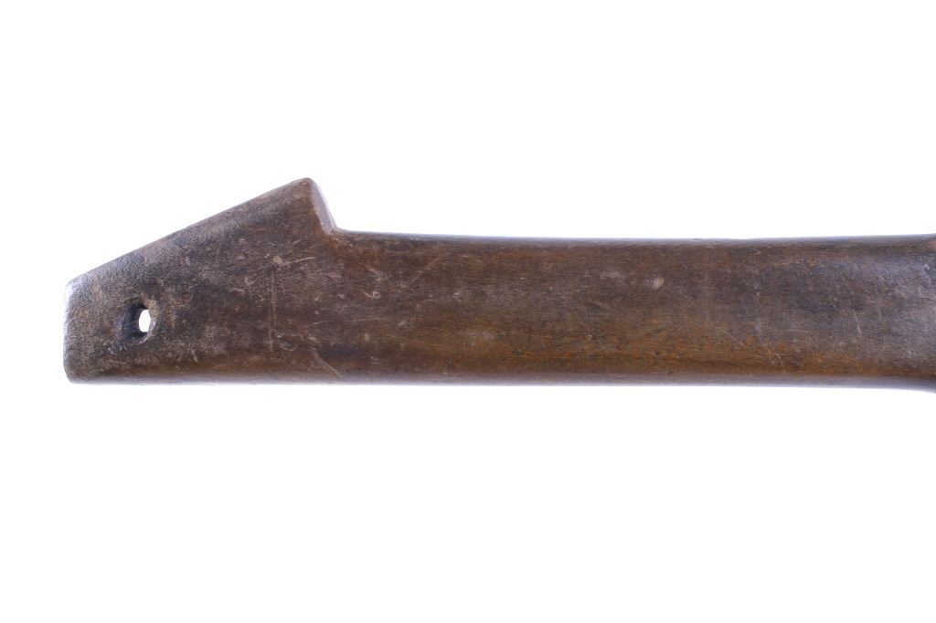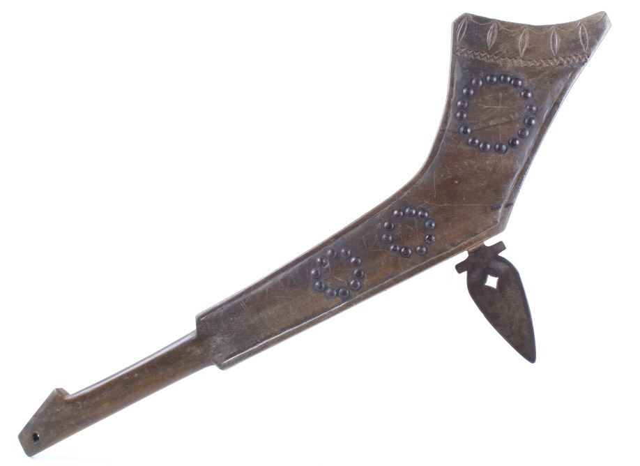 The lot features a 19th Century Plains Native American Indian gunstock spontoon war club tomahawk. The piece is very similar to the example documented in Harold L. Peterson’s 1965 book “American Indian Tomahawk” on page 88 figure / photograph 21 which shows a traditional gunstock haft, with rounded beveled gripping area, spontoon iron trade blade and brass tacked circle; attributed to the mid-19th Century from the Teton Sioux Indians. This specimen is likely from the Sioux as well showing a prominent large solid wood gunstock haft in traditional form with butt stock like end with crescent curved top which flows into a plat front and back being squared off tapering slightly and beveling towards the polished gripping area, ended by the rear sharp pointed triangular pommel which is blunt at the end and has a pierced hole which would have held a drop of feathers or bead work. At the angle towards the top third of the club shows an inset forged iron spoon spear point in typical diamond shape with worn curved double edge, slight thickness towards the center and straight squared off basal processes along with boasting a four-point morning star like diamond cut out. The spontoon blade is held into place with poured bullet lead or pewter and is secured. The surface of the wood on both sides shows an incised carved single border framing the outer edge with top crescent curved section being artfully carved / incised with a sawtooth triangular zig-zag pattern and oblong diamond like sections finished with crescent curves. The top crescent has a hewn like carved finish. The club itself has a slightly brown to green coloring and shows various small carvings, dings and dents which could hold a greater meaning. Each side shows one large and two medium circles which consist of brass trade tacks with a dark coloring. Provenance: From a historic Eastern Montana American Indian Collection where the piece was found to be an authentic original, one of the finest collections of American Indian weaponry and antiquities in Montana. Measures 27.5”L by 11.5”W with the blade being 4.75”L and 2”W.