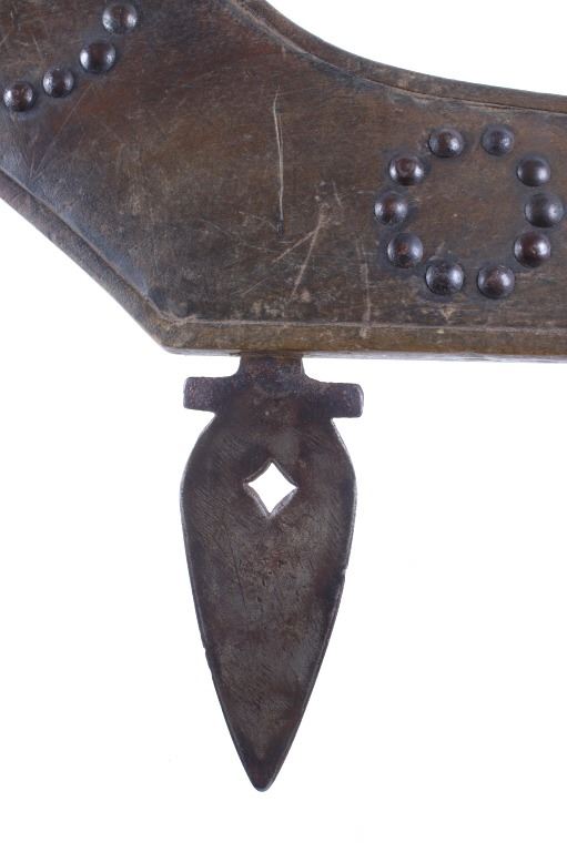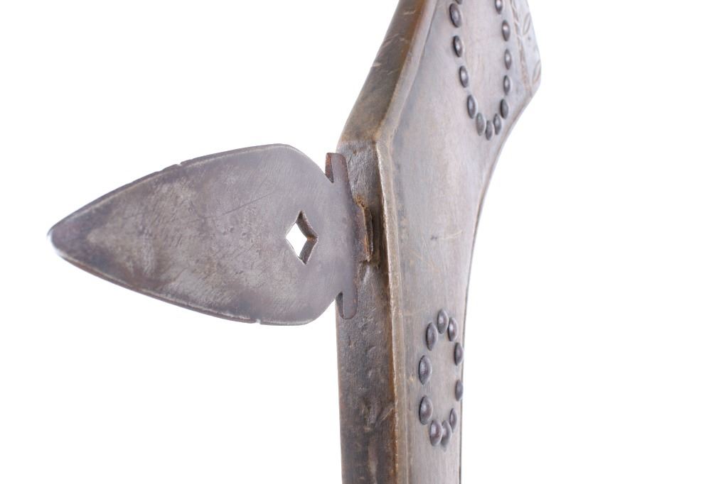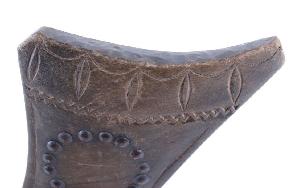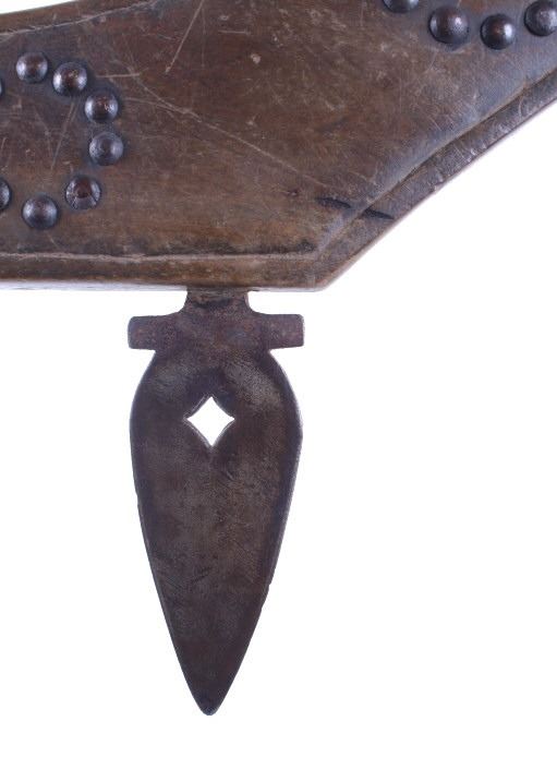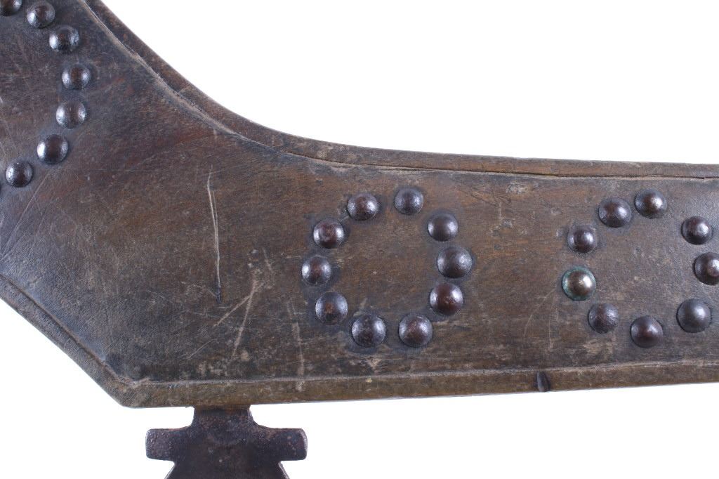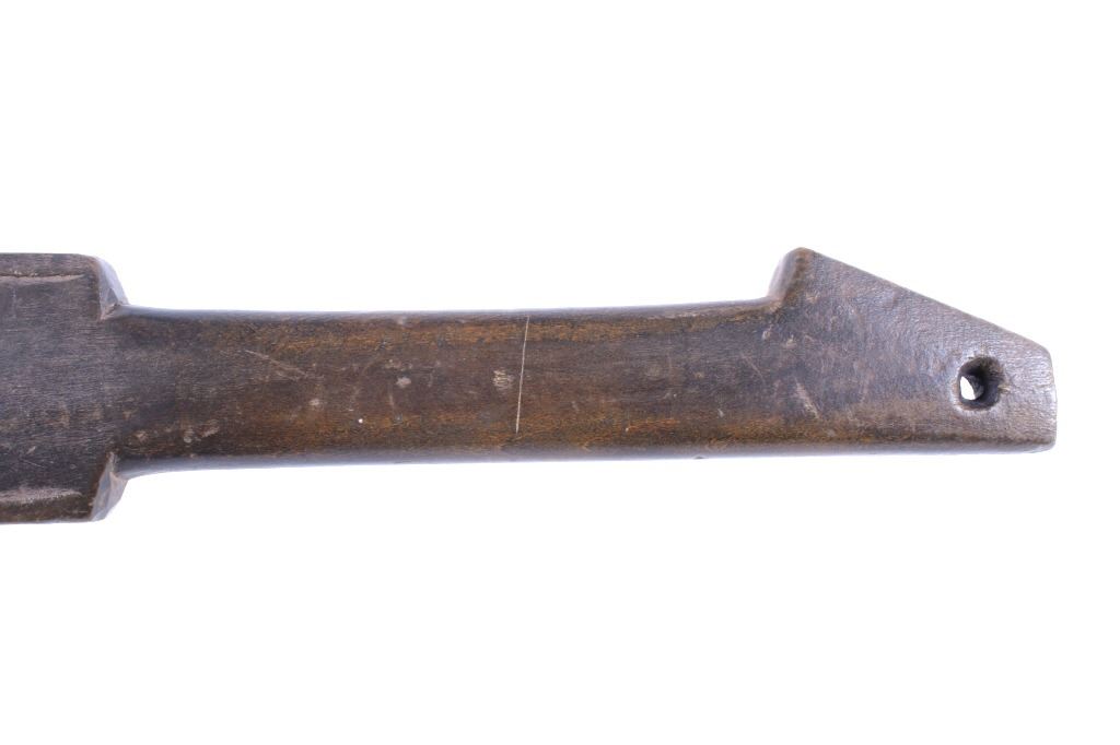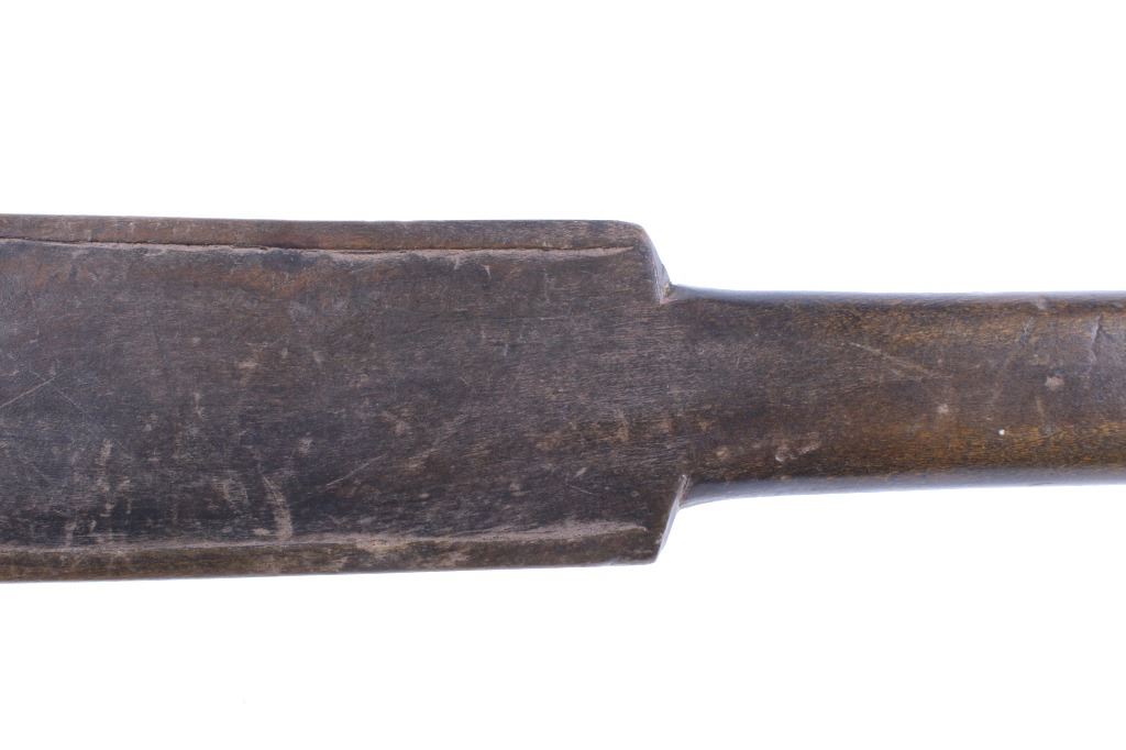 The lot features a 19th Century Plains Native American Indian gunstock spontoon war club tomahawk. The piece is very similar to the example documented in Harold L. Peterson’s 1965 book “American Indian Tomahawk” on page 88 figure / photograph 21 which shows a traditional gunstock haft, with rounded beveled gripping area, spontoon iron trade blade and brass tacked circle; attributed to the mid-19th Century from the Teton Sioux Indians. This specimen is likely from the Sioux as well showing a prominent large solid wood gunstock haft in traditional form with butt stock like end with crescent curved top which flows into a plat front and back being squared off tapering slightly and beveling towards the polished gripping area, ended by the rear sharp pointed triangular pommel which is blunt at the end and has a pierced hole which would have held a drop of feathers or bead work. At the angle towards the top third of the club shows an inset forged iron spoon spear point in typical diamond shape with worn curved double edge, slight thickness towards the center and straight squared off basal processes along with boasting a four-point morning star like diamond cut out. The spontoon blade is held into place with poured bullet lead or pewter and is secured. The surface of the wood on both sides shows an incised carved single border framing the outer edge with top crescent curved section being artfully carved / incised with a sawtooth triangular zig-zag pattern and oblong diamond like sections finished with crescent curves. The top crescent has a hewn like carved finish. The club itself has a slightly brown to green coloring and shows various small carvings, dings and dents which could hold a greater meaning. Each side shows one large and two medium circles which consist of brass trade tacks with a dark coloring. Provenance: From a historic Eastern Montana American Indian Collection where the piece was found to be an authentic original, one of the finest collections of American Indian weaponry and antiquities in Montana. Measures 27.5”L by 11.5”W with the blade being 4.75”L and 2”W.