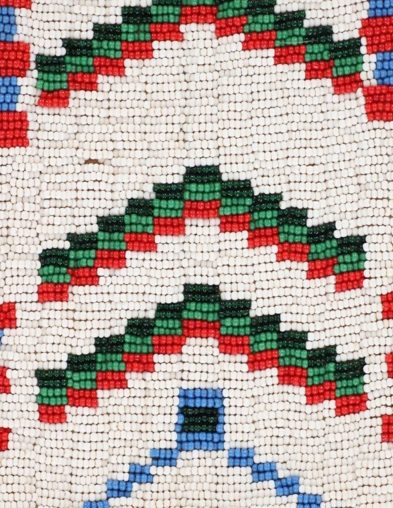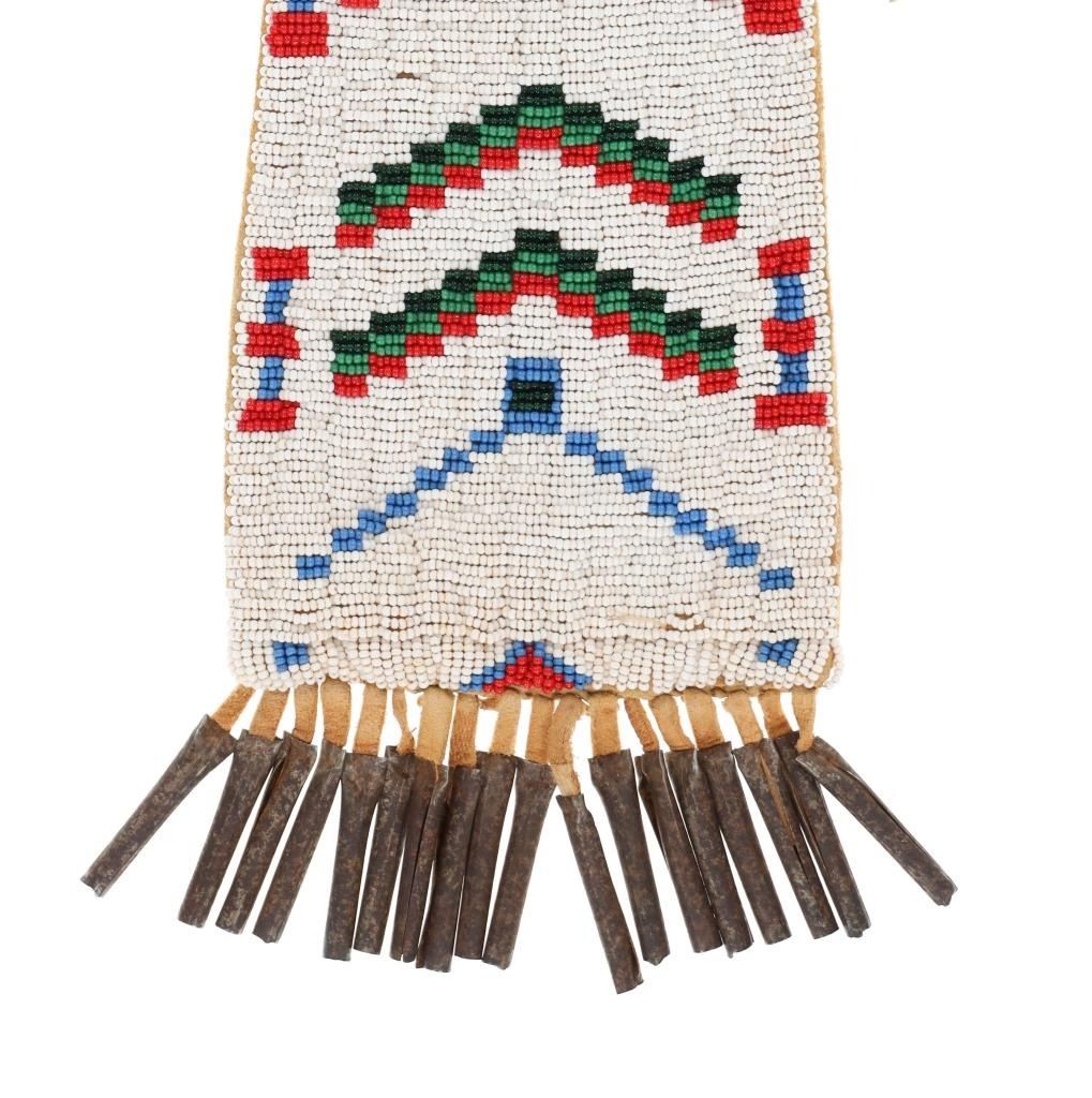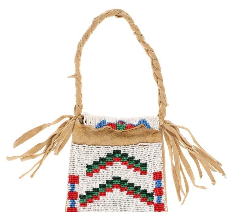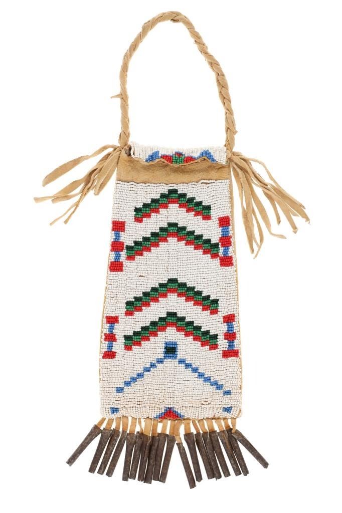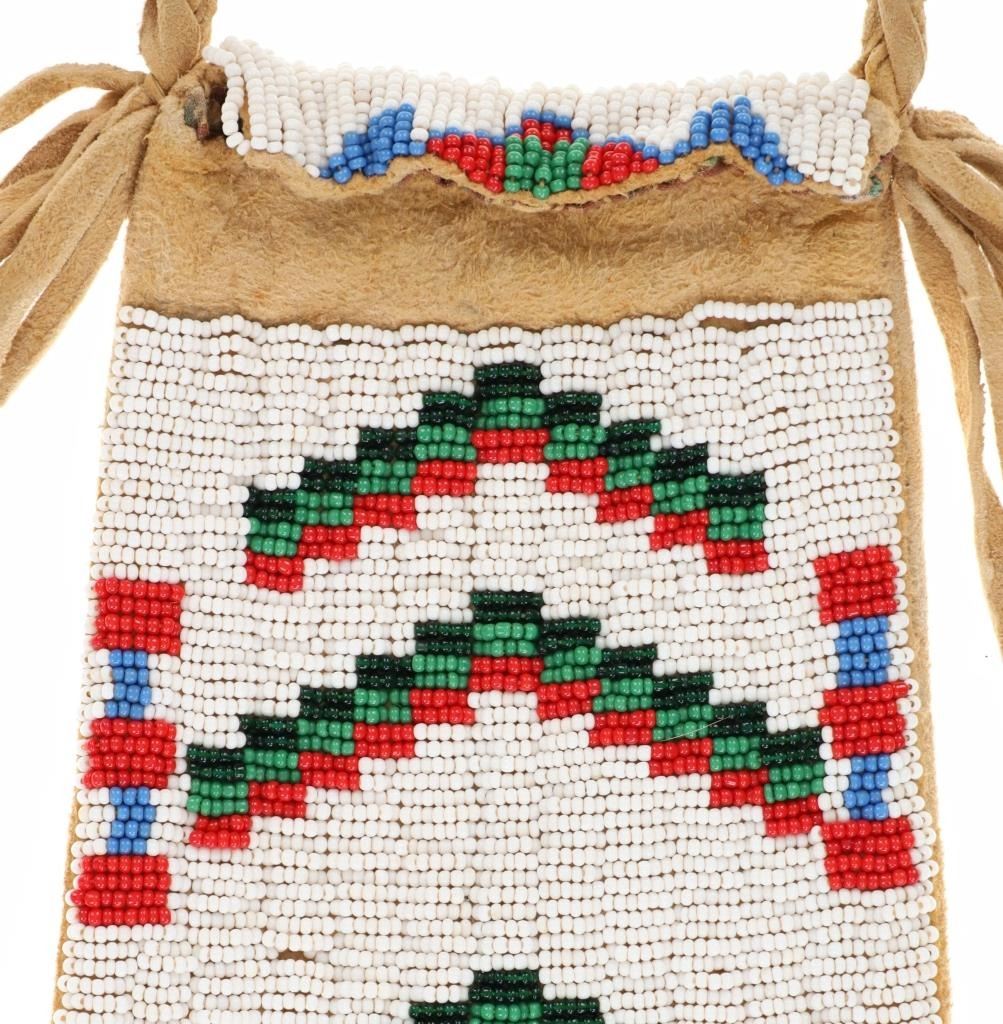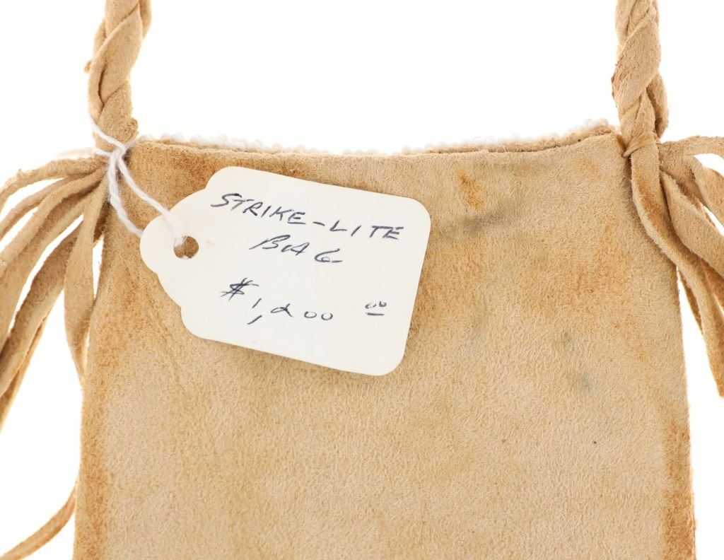 The lot features a beaded hide strike-a-lite bag from the Plains region dating to the late 20th Century. The piece exhibits a tanned hide elongated strike-a-lite bag with small flap, braided hide top strap, rolled tin jingle dangle cones at the bottom and the entire front with a geometric beaded design. The beadwork is all glass trade seed beads. Well kept with only a small bead loss on the bottom right. Th bag has a tag that is marked, "STRIKE-LITE BAG $1,200.00". Measures 14 7/8"L by 4.5"W.