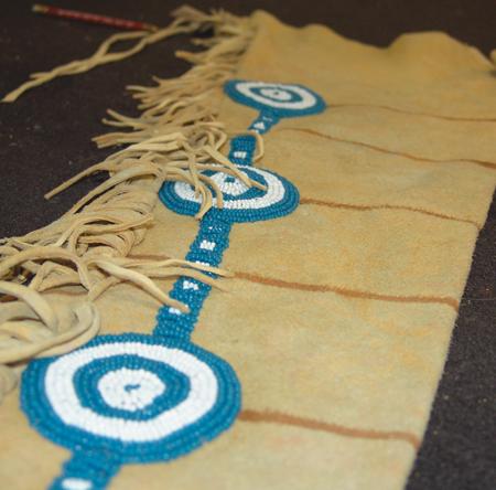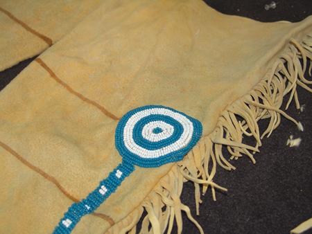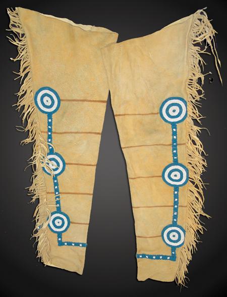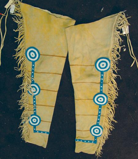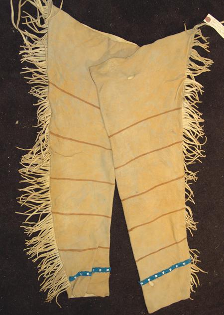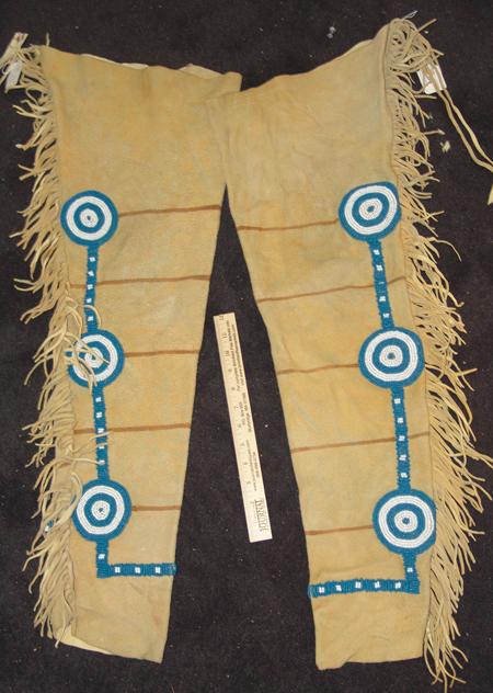 Beautiful traditional-style warrior's leggings with pony beaded rosettes and trim, fringed edges, and painted horizontal stripes. Condition: very good, usable. 34" x 11"