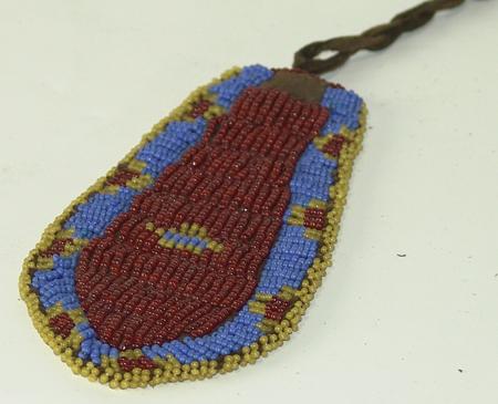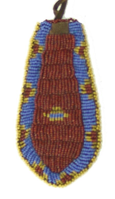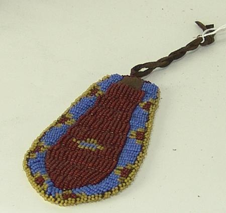 Circa Early 1900s, Excellent ladies buckskin tobacco bag with lazy stitch red, blue, and greasy yellow beaded front. Excellent condition. 6" x 3"