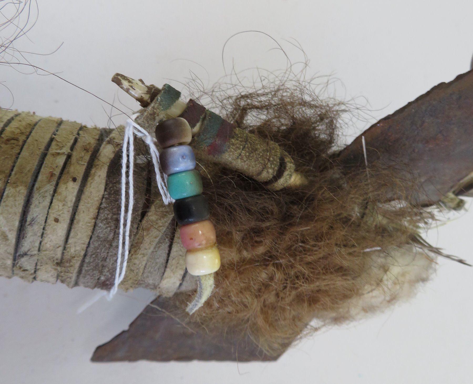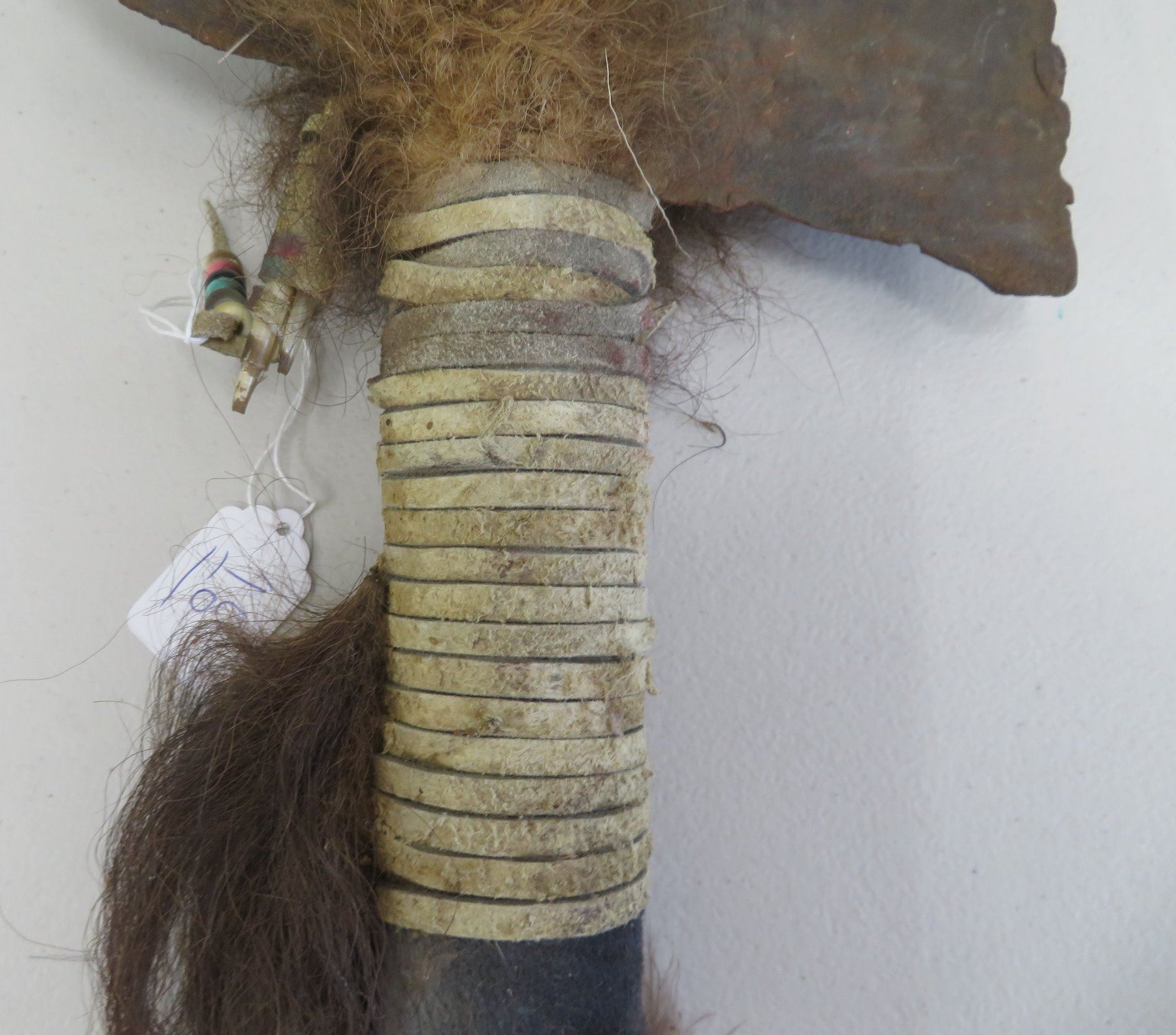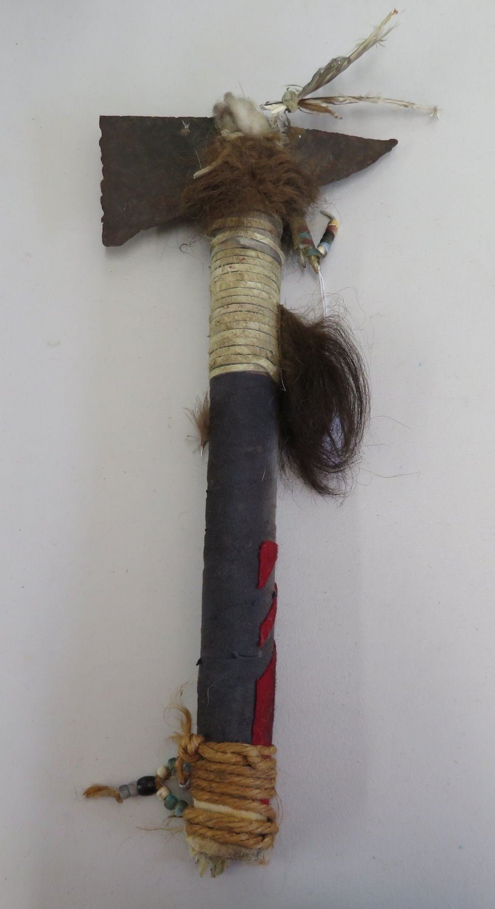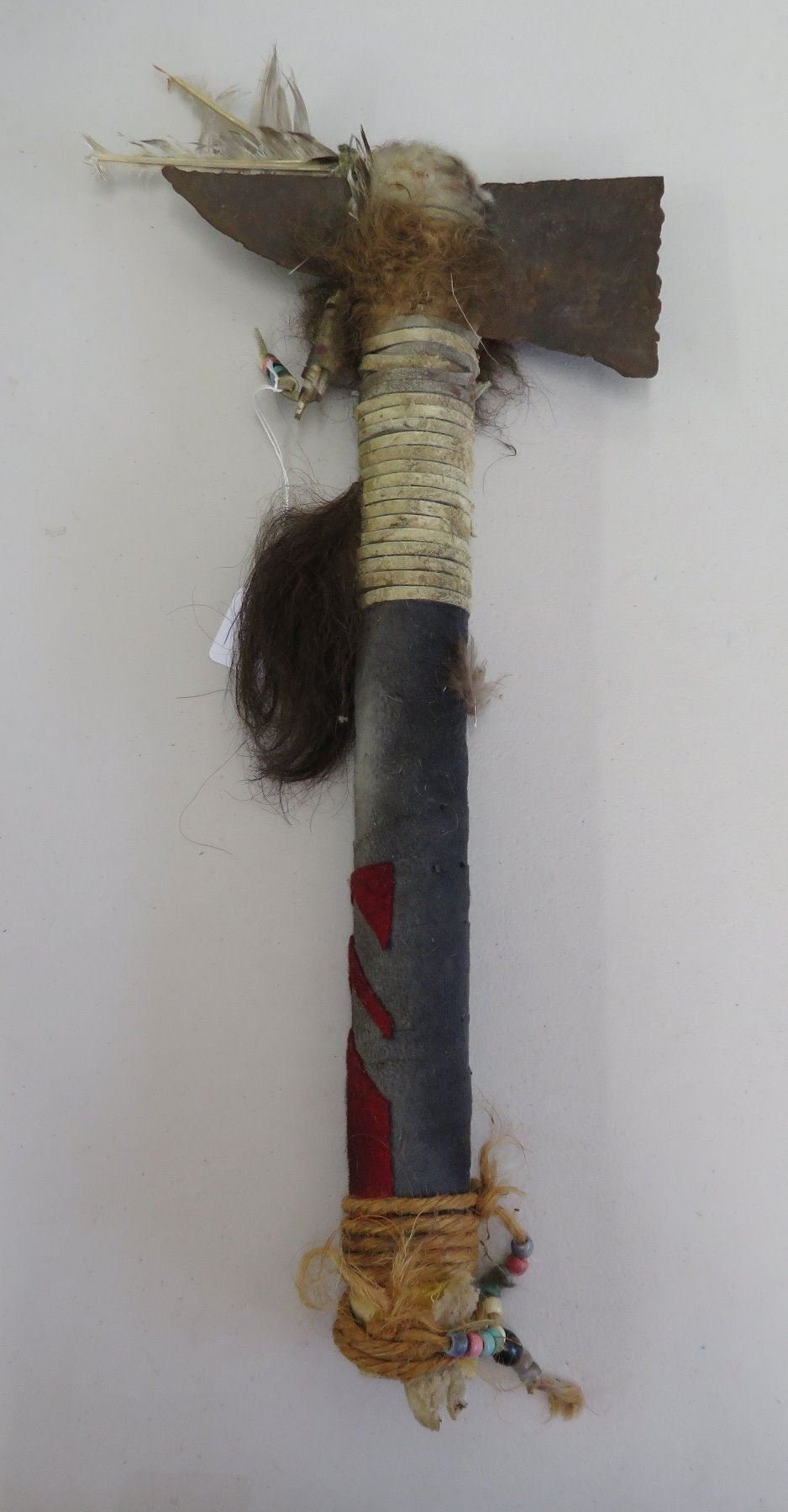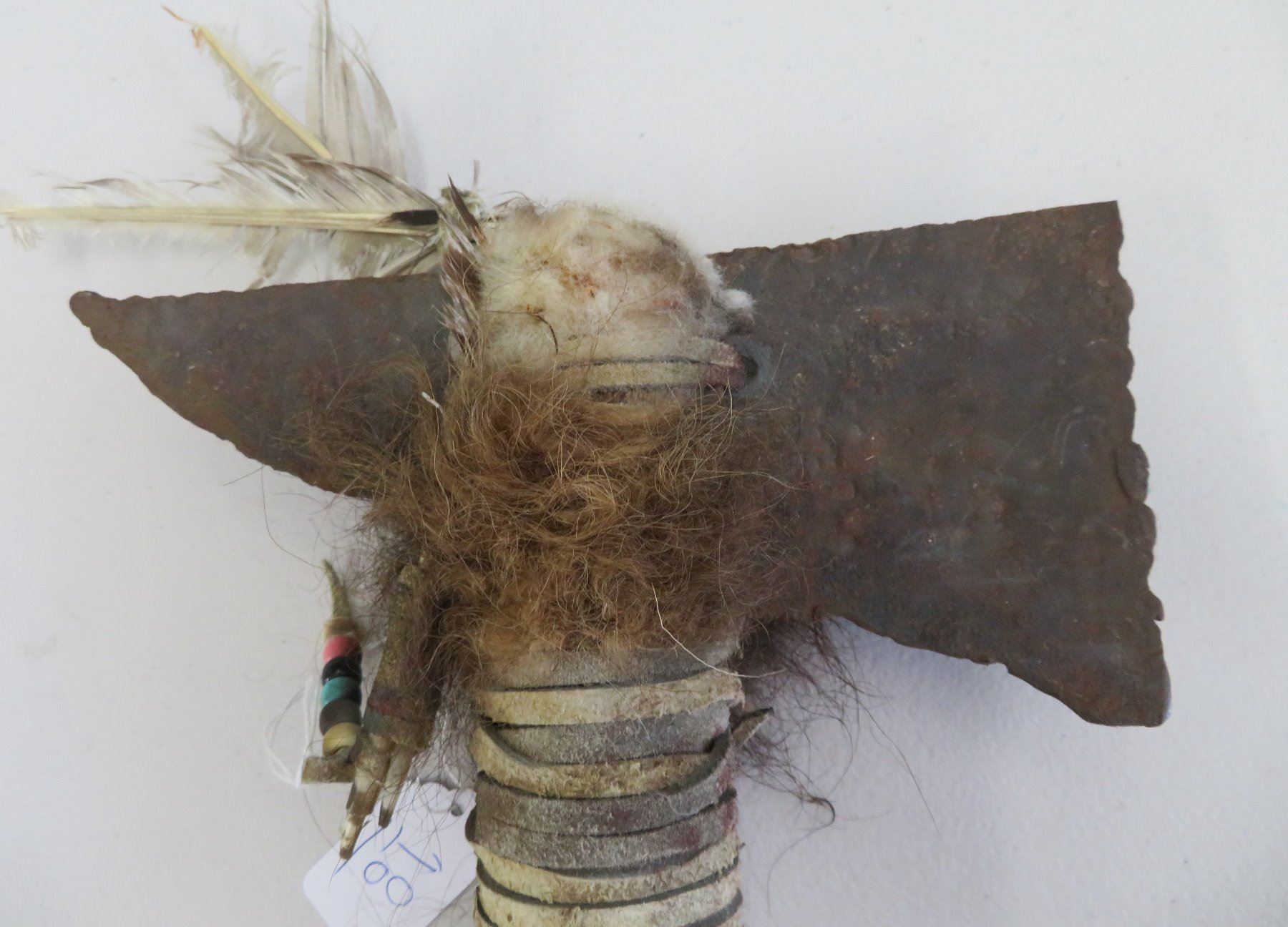 Plains Tomahawk, 20th century item. Made of iron blade, wrapped wood with feathers, buckskin thongs, buffalo fur, selvedge cloth, rope and trade beads, the item measures 20" overall with a 9" x 4 1/2" blade. Central Plains. Condition: Good, some signs of wear, see images. Shipping: $40.00 USA estimate only, due to size and weight, w/insurance and signature.