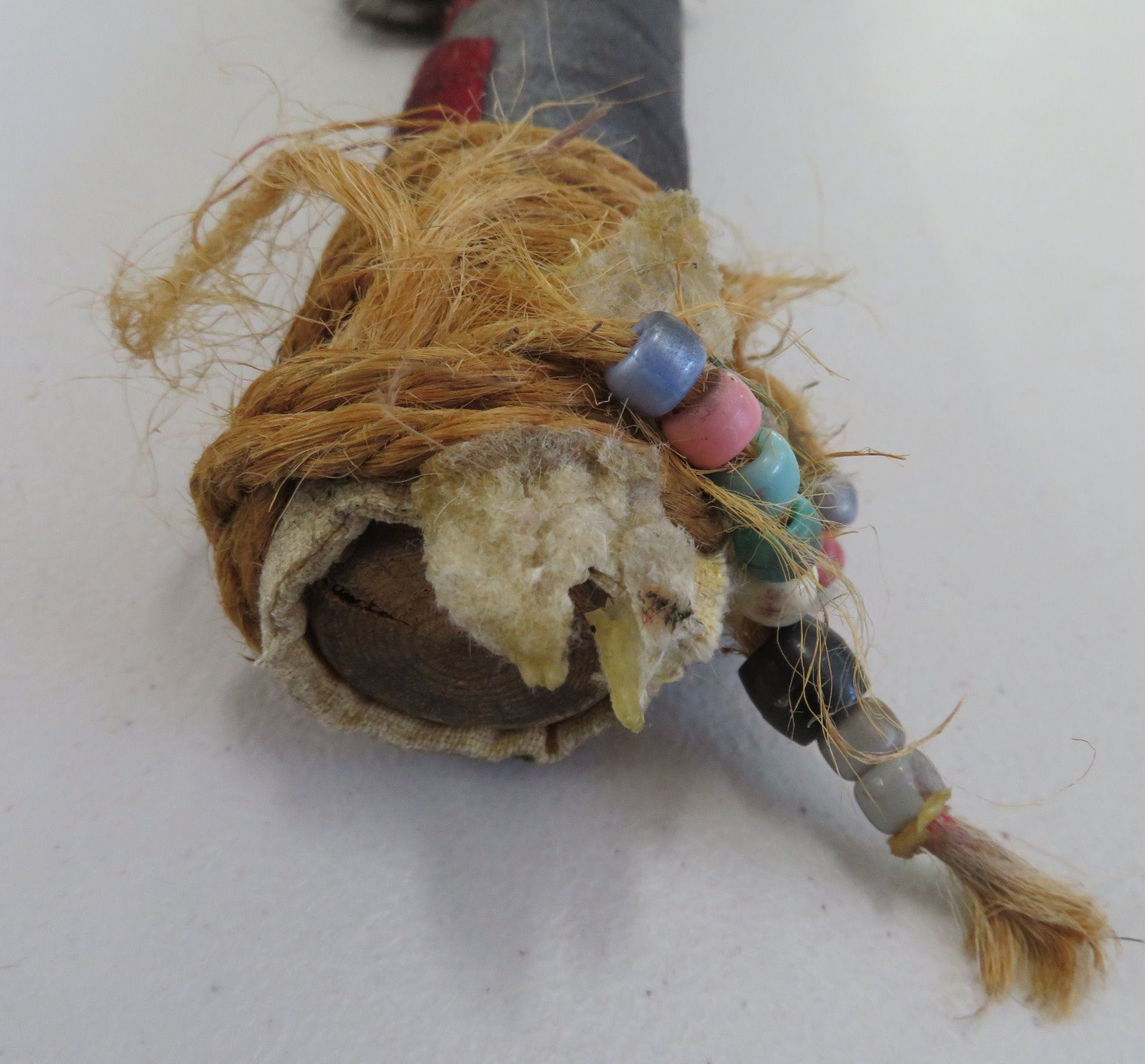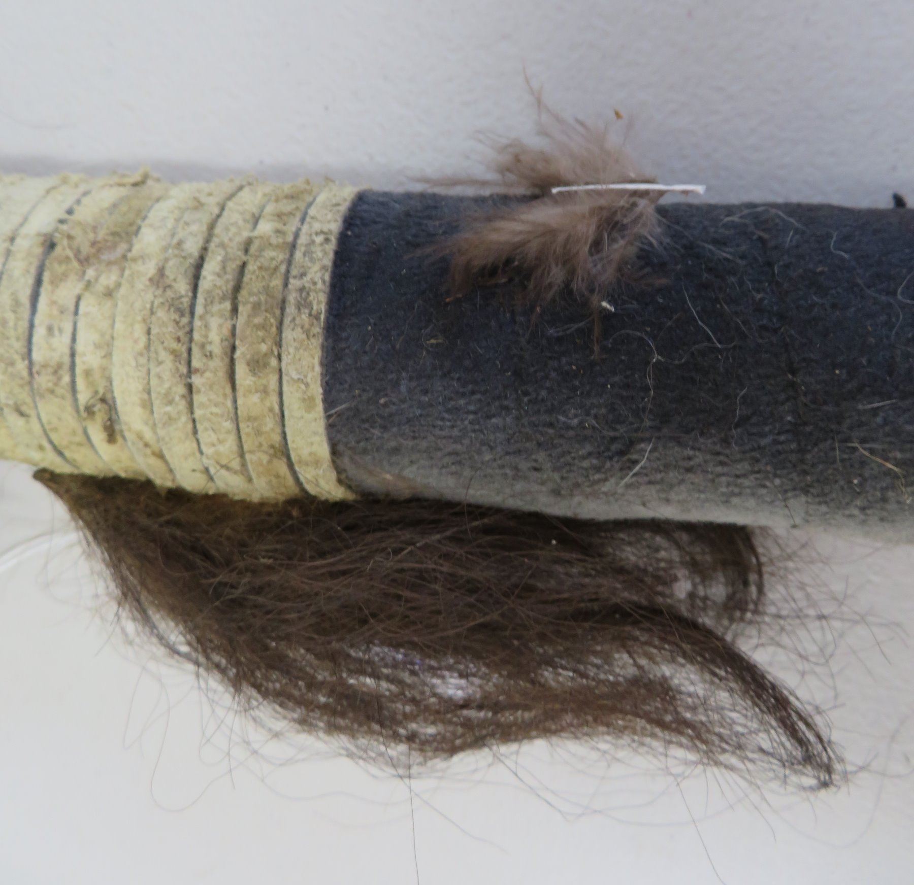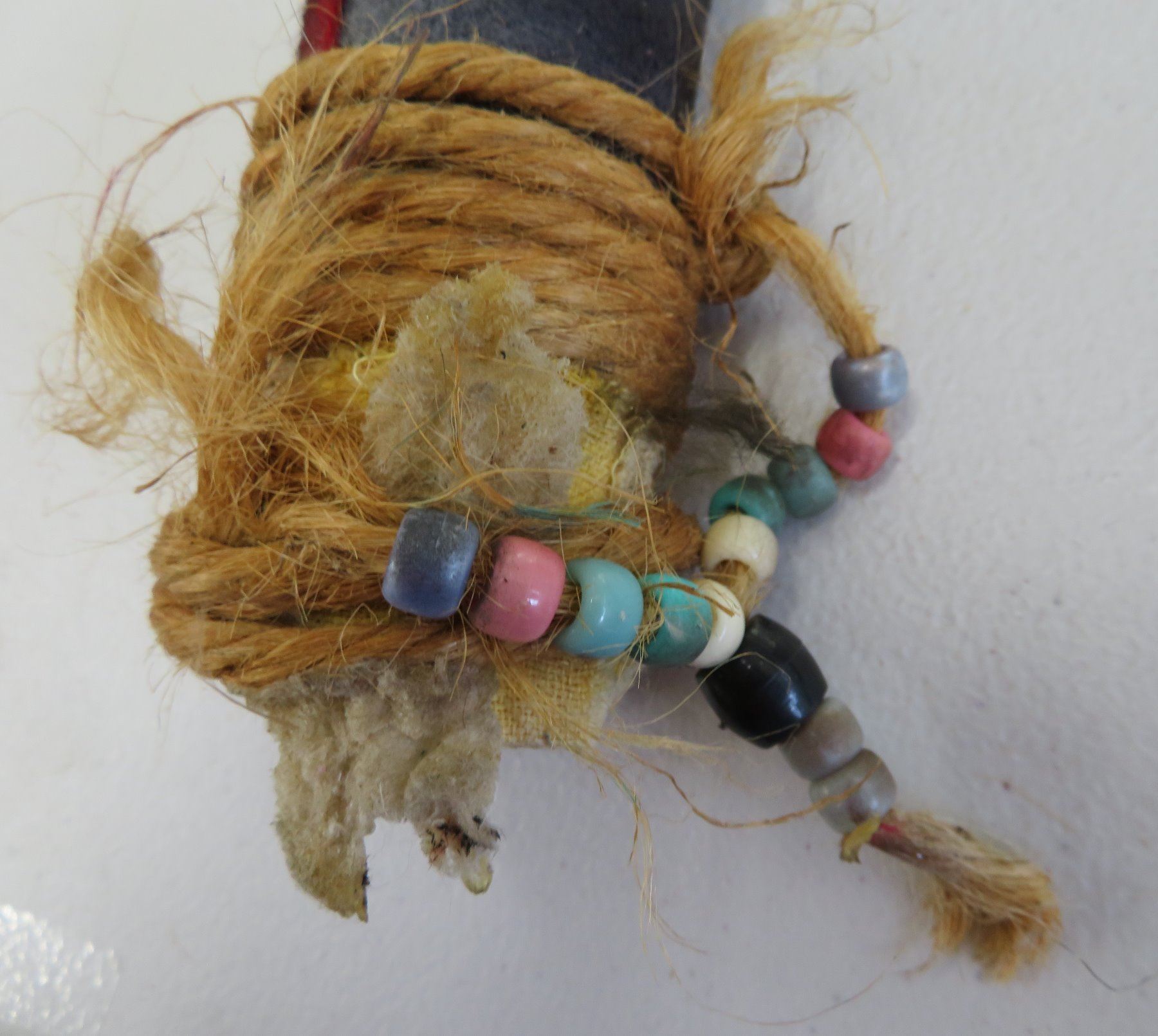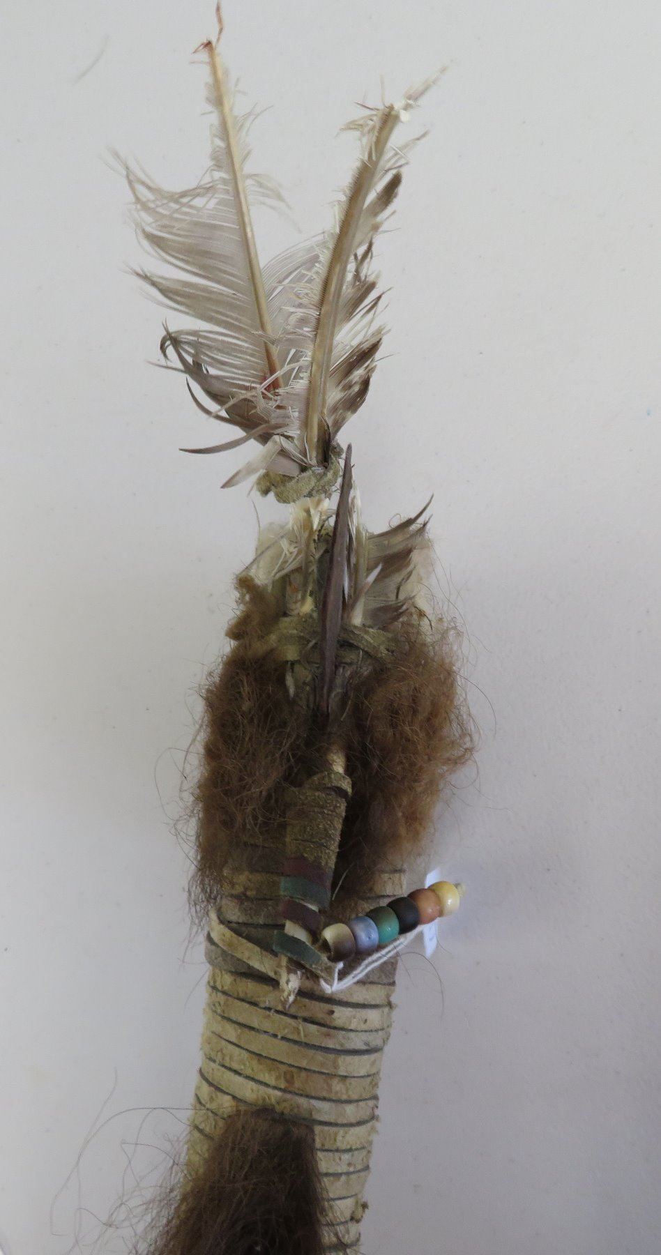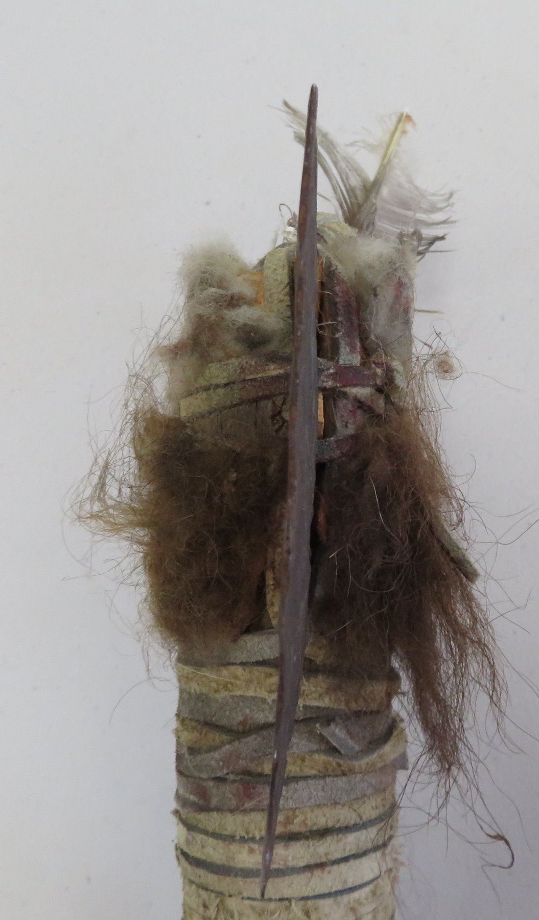 Plains Tomahawk, 20th century item. Made of iron blade, wrapped wood with feathers, buckskin thongs, buffalo fur, selvedge cloth, rope and trade beads, the item measures 20" overall with a 9" x 4 1/2" blade. Central Plains. Condition: Good, some signs of wear, see images. Shipping: $40.00 USA estimate only, due to size and weight, w/insurance and signature.