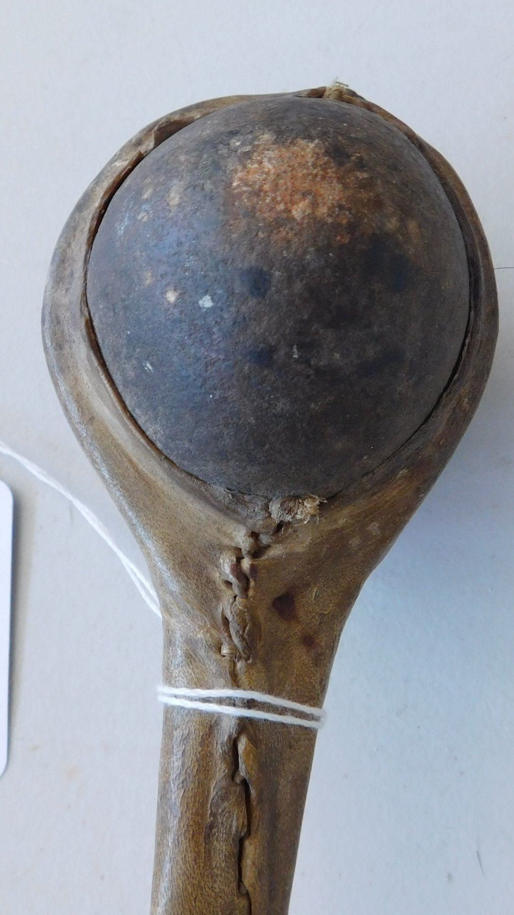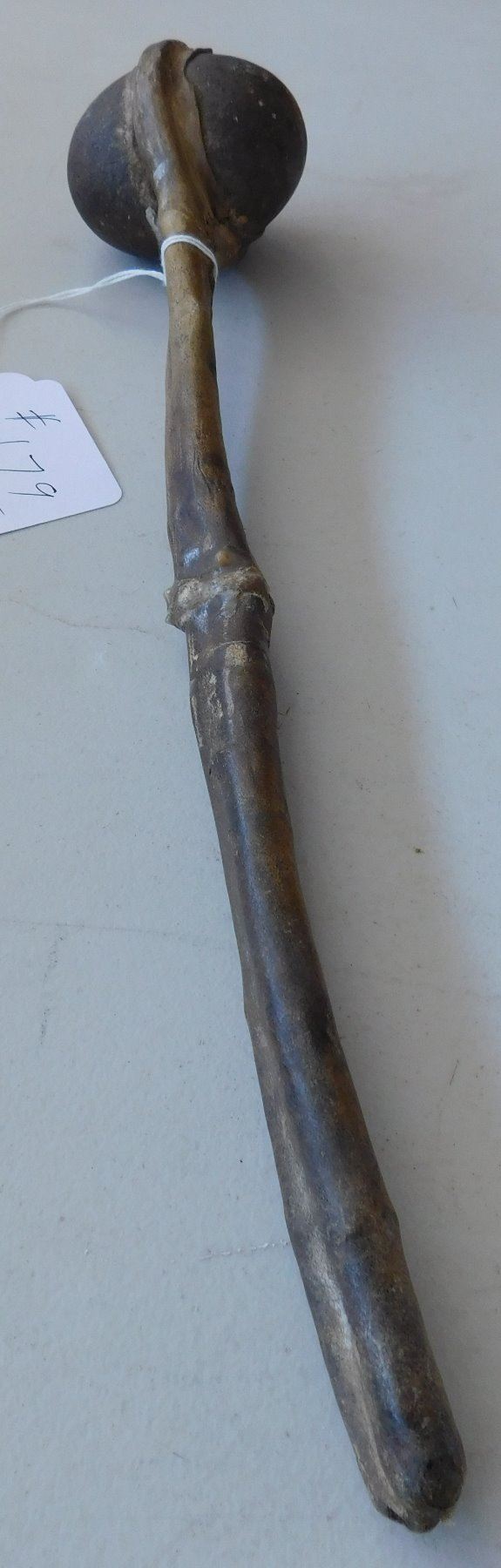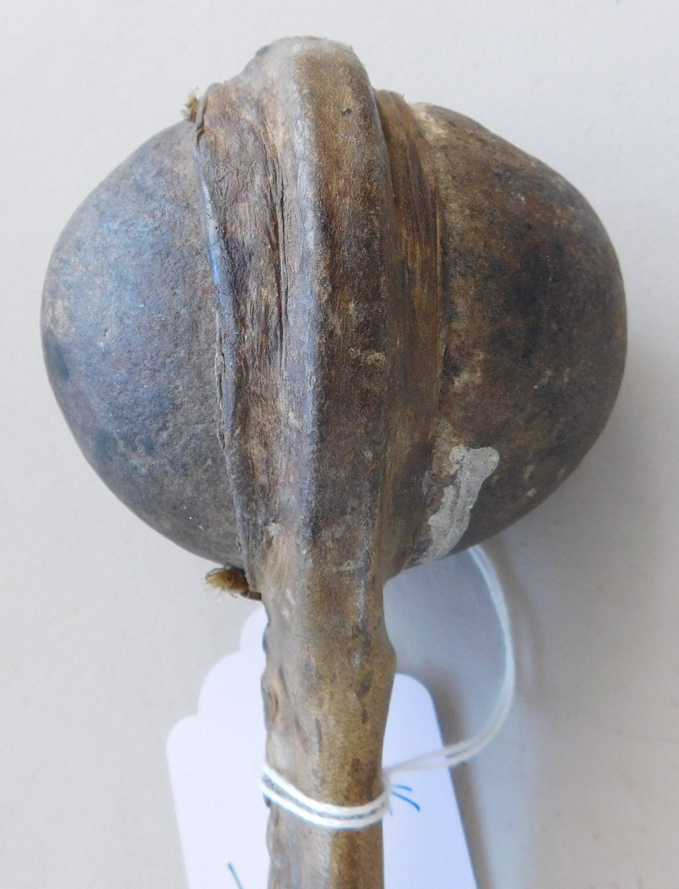 Plains War Club, circa 1870s. Made of stone, wood and rawhide, the item measures 3" x 2.75" x 15.75". Montana. Condition: As found except for minor repair on handle, see images. Shipping: $30.00 w/insurance and signature, due to length.