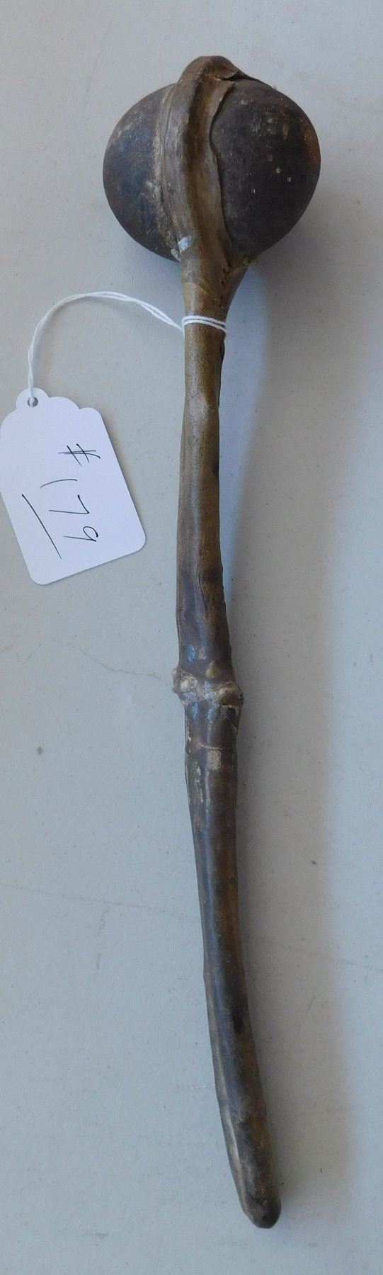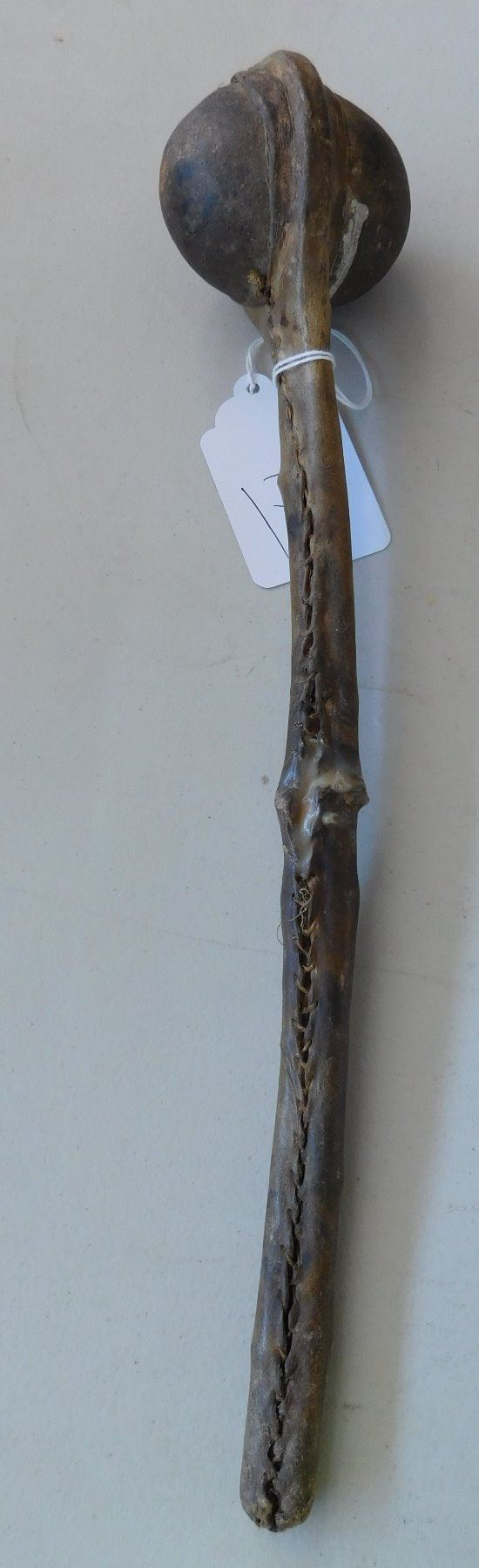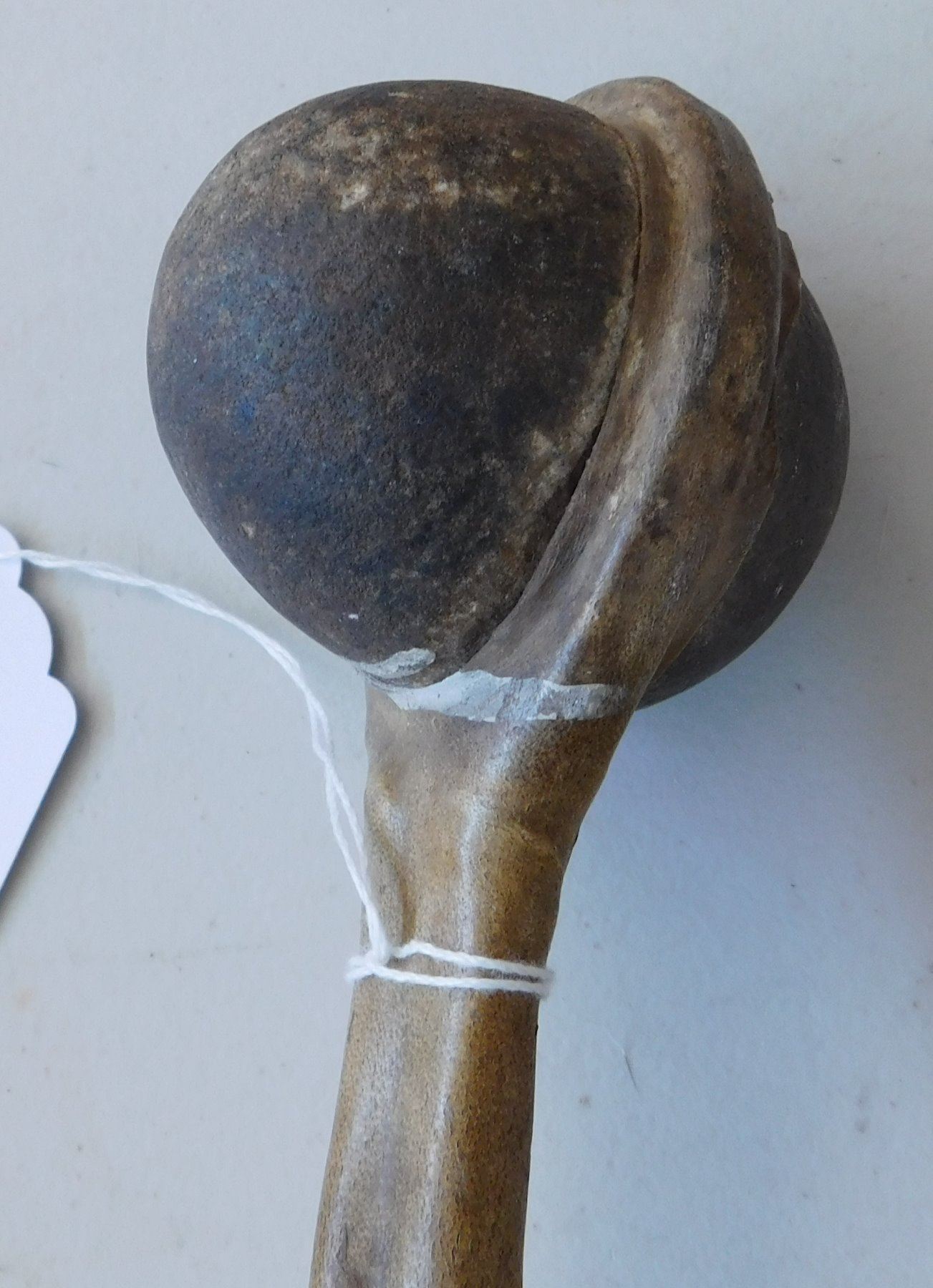 Plains War Club, circa 1870s. Made of stone, wood and rawhide, the item measures 3" x 2.75" x 15.75". Montana. Condition: As found except for minor repair on handle, see images. Shipping: $30.00 w/insurance and signature, due to length.