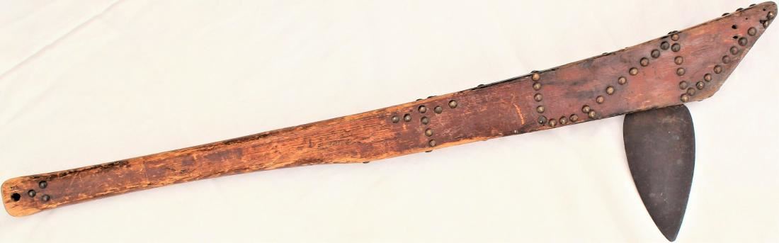 Turn of the Century non-typical Plains gun stock style club, showing extensive wear and use, with nice consistent patina thoughout, hand forged blade, haft decorated with large number of square shanked tacks, with a few missing here and there. Measuring 30" in length.