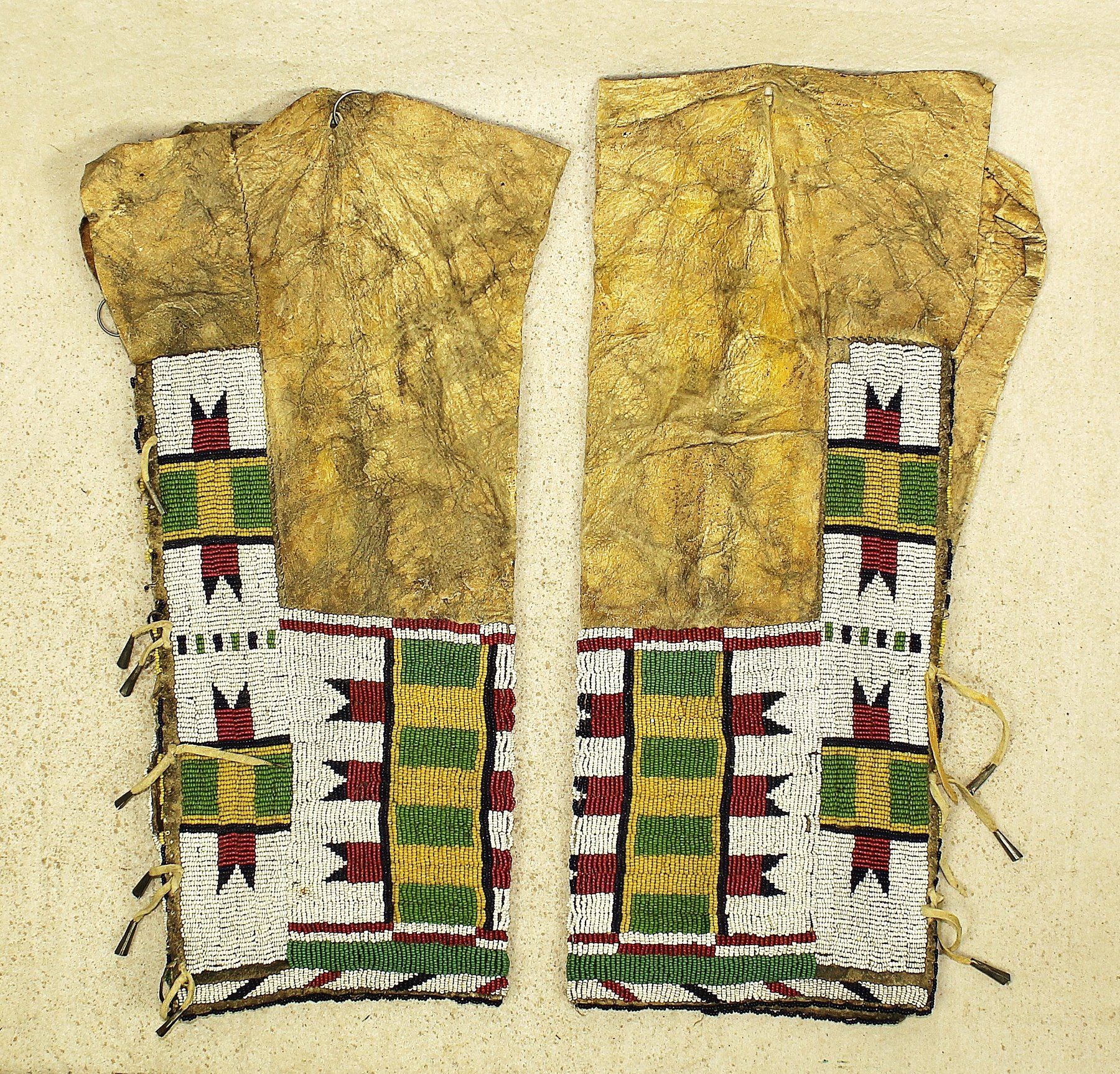 Desirable early brain tanned leggings sewn with sinew, showing yellow ochre, and wonderfully beaded with red white hearts, greasy yellows and cobalt blues. Measuring 17".