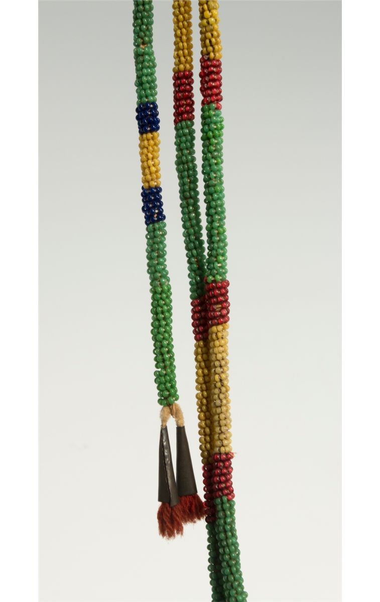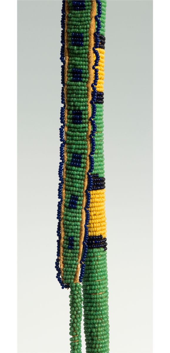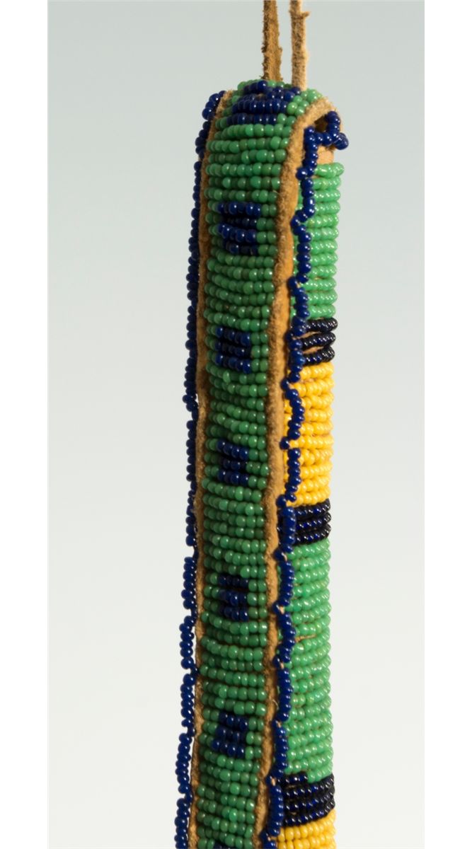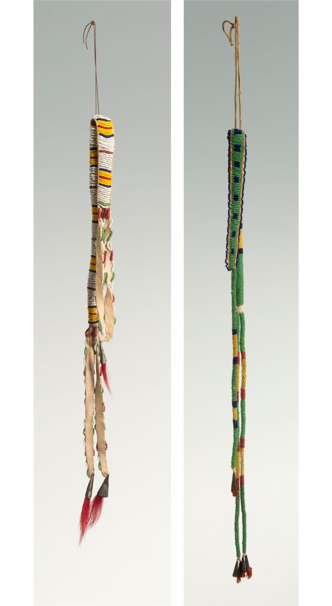 Two Awl Cases. 1. Plains. 16" long (including drops). Finely beaded in a banded design of many colors. Drops and flap are trimmed in fine beadwork and end in feather stuffed tin cones. Circa 1950s. 2. Blackfoot. 21" long (including drops). Finely beaded in green, yellow, cobalt and white-heart red. Drops are finished off by yarn stuffed tin cones. Circa 1890s. Provenance: Estate of Jim Nicholls.