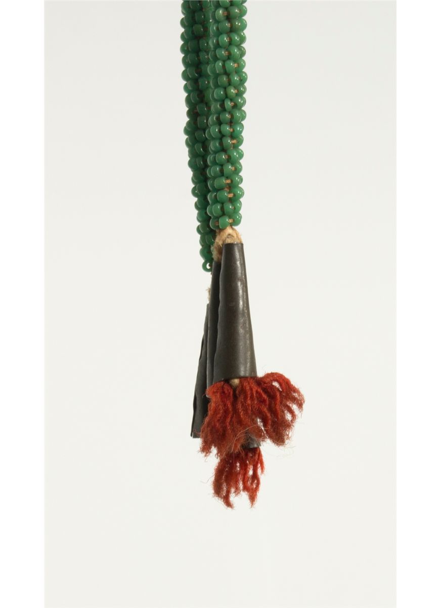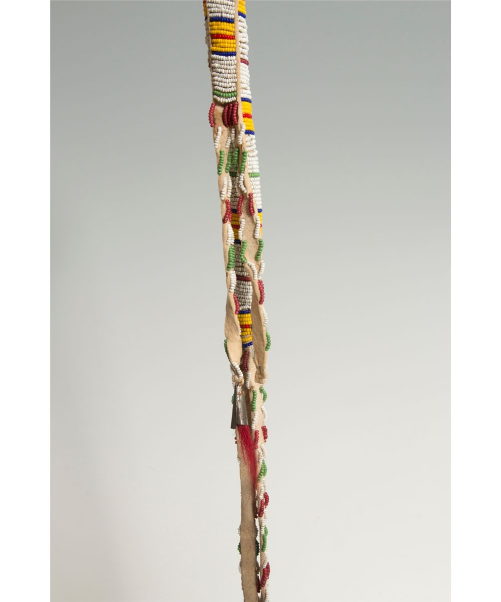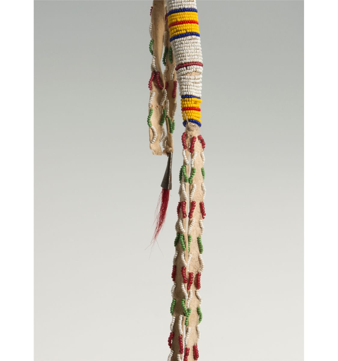Two Awl Cases. 1. Plains. 16" long (including drops). Finely beaded in a banded design of many colors. Drops and flap are trimmed in fine beadwork and end in feather stuffed tin cones. Circa 1950s. 2. Blackfoot. 21" long (including drops). Finely beaded in green, yellow, cobalt and white-heart red. Drops are finished off by yarn stuffed tin cones. Circa 1890s. Provenance: Estate of Jim Nicholls.