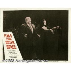 <B>Plan 9 From Outer Space (DCA, 1959)</B></I> Lobby Card (11" X 14"). "Can your heart stand the shocking facts about Graverobbers From Space?" Universally beloved as the absolutely worst film ever made, "Plan 9" is the magnum opus of Ed Wood, Jr. A silly mishmash of flying saucers, resurrected zombies and the idiotic soldiers and cops who confront them, this is a masterpiece of bad filmmaking. This scene card shows Tor Johnson and Vampira as the zombies who wander the graveyard, looking for victims. Edge tears, light wrinkles and a few stains. Otherwise, a very clean card. "My friend, you have seen this incident, based on sworn testimony. Can you prove that it didn't happen?" Fine.