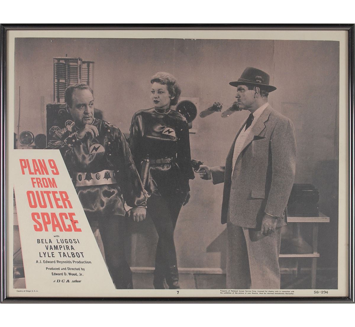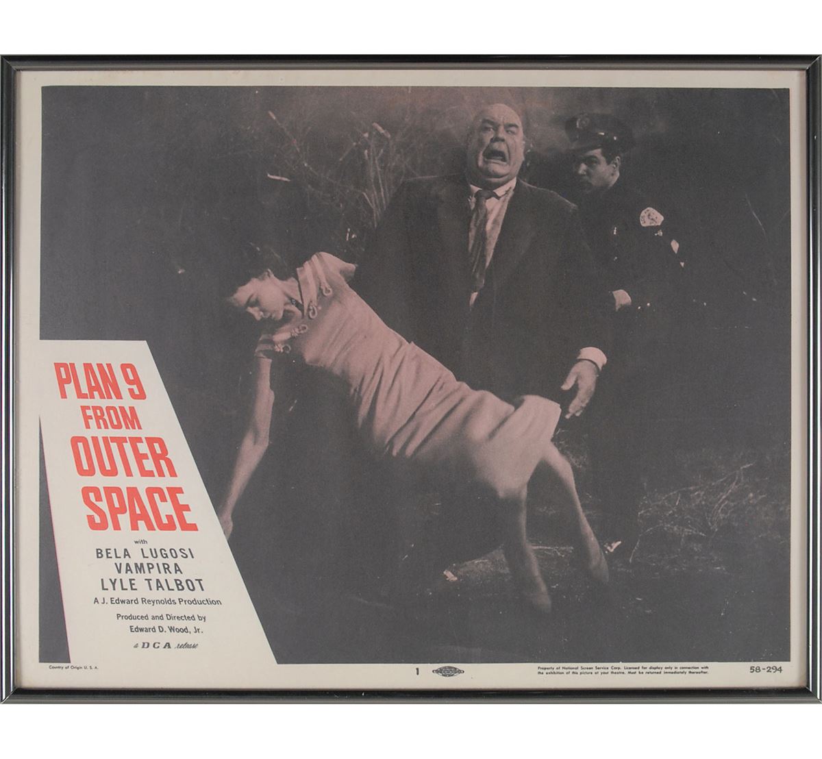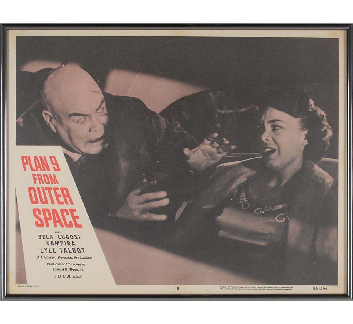 Plan 9 from Outer Space (DCA, 1958). Complete set of eight lobby cards (14 x 11). Classic science-fiction thriller starring Gregory Walcott, Mona McKinnon, Tor Johnson, Vampira, and Bela Lugosi in what has been famously called the ‘worst movie ever made.’ Each is framed to an overall size of 14.25 x 11.25. In overall fine condition, with light scattered creases and soiling. Seldom offered as a full set, this is a spectacular assemblage of lobby cards from the iconic sci-fi cult classic. Each is professionally framed for an attractive display.
