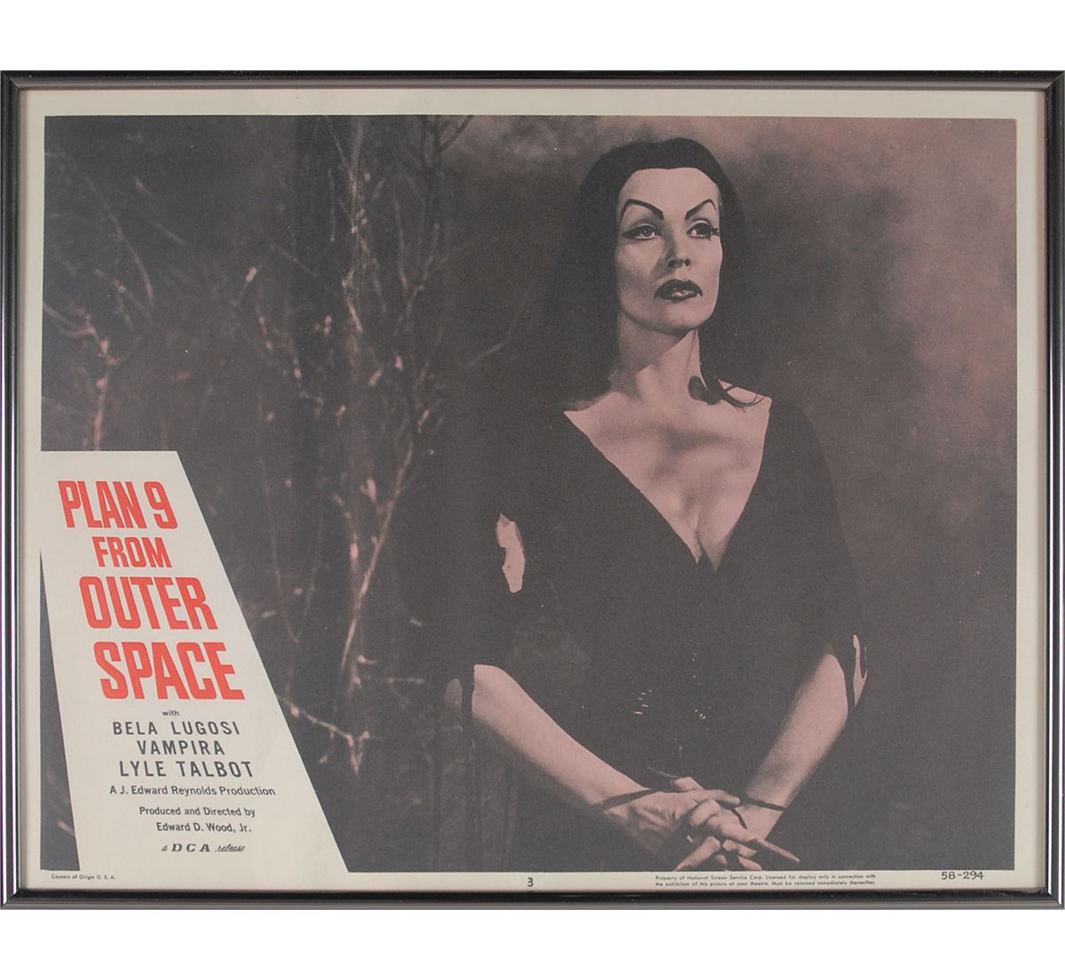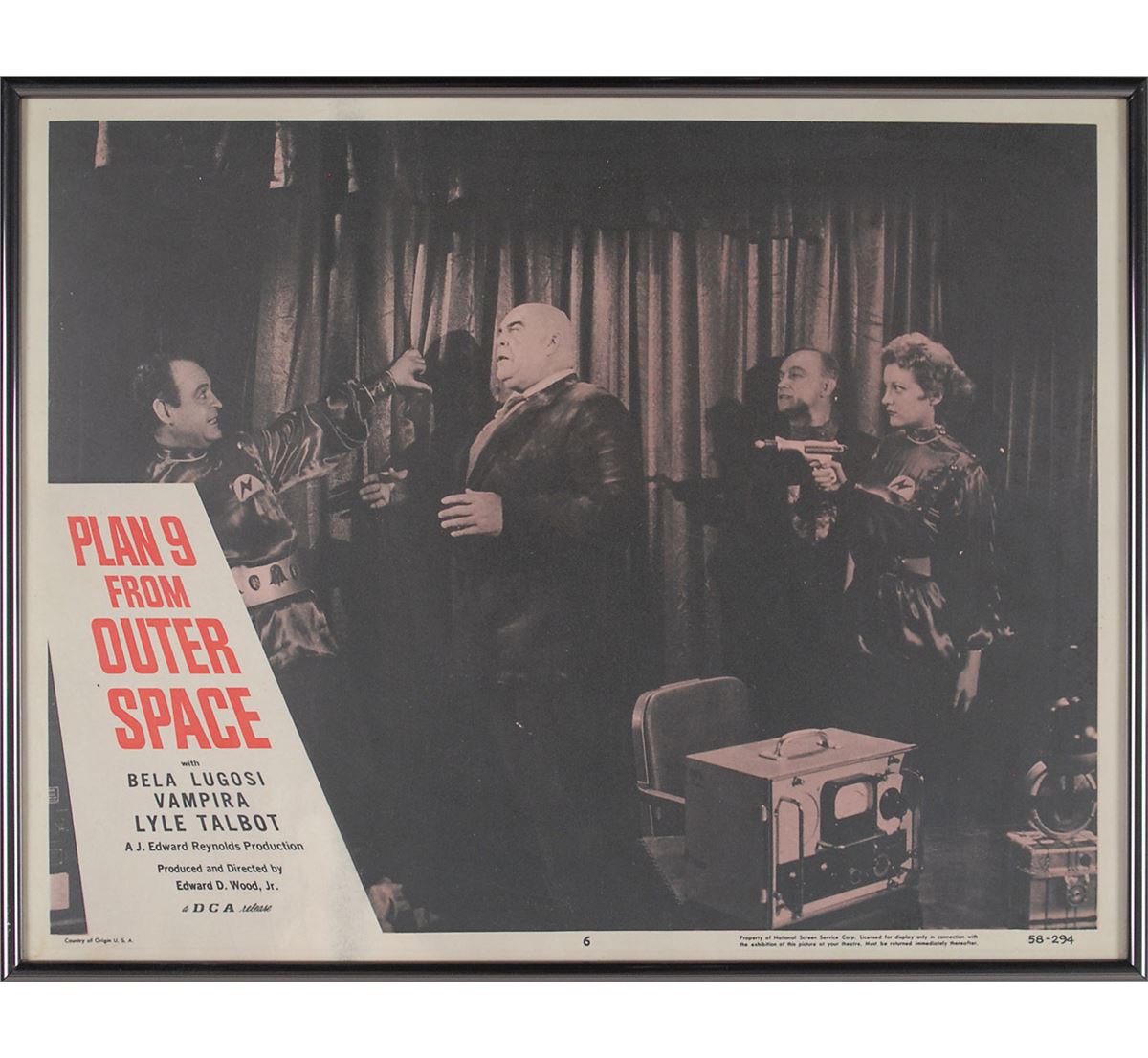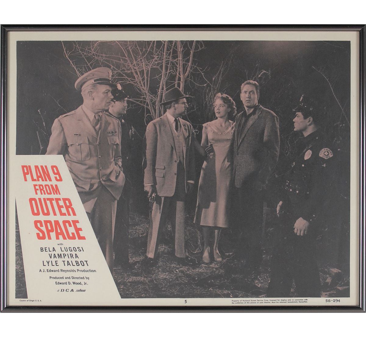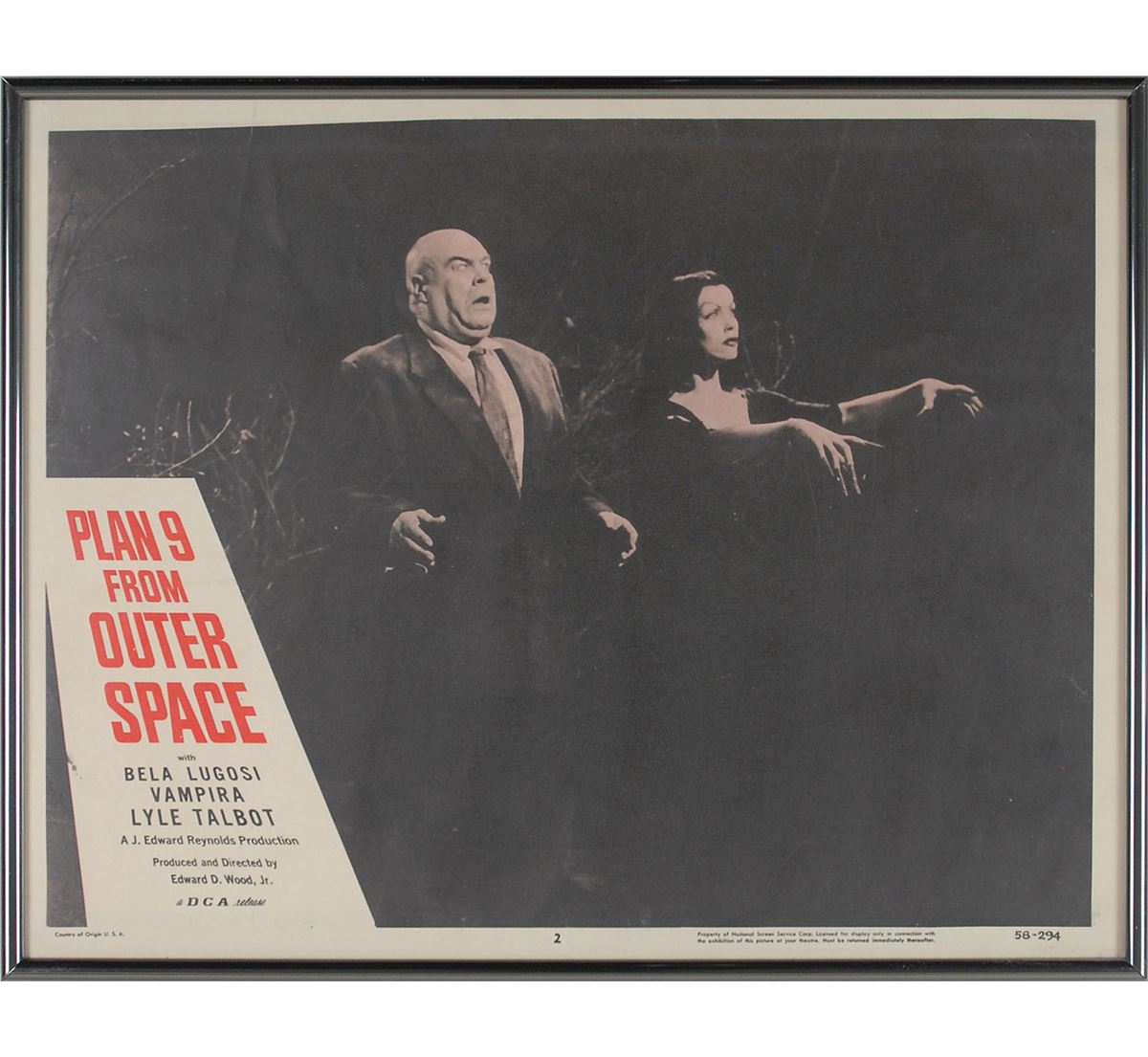 Plan 9 from Outer Space (DCA, 1958). Complete set of eight lobby cards (14 x 11). Classic science-fiction thriller starring Gregory Walcott, Mona McKinnon, Tor Johnson, Vampira, and Bela Lugosi in what has been famously called the ‘worst movie ever made.’ Each is framed to an overall size of 14.25 x 11.25. In overall fine condition, with light scattered creases and soiling. Seldom offered as a full set, this is a spectacular assemblage of lobby cards from the iconic sci-fi cult classic. Each is professionally framed for an attractive display.