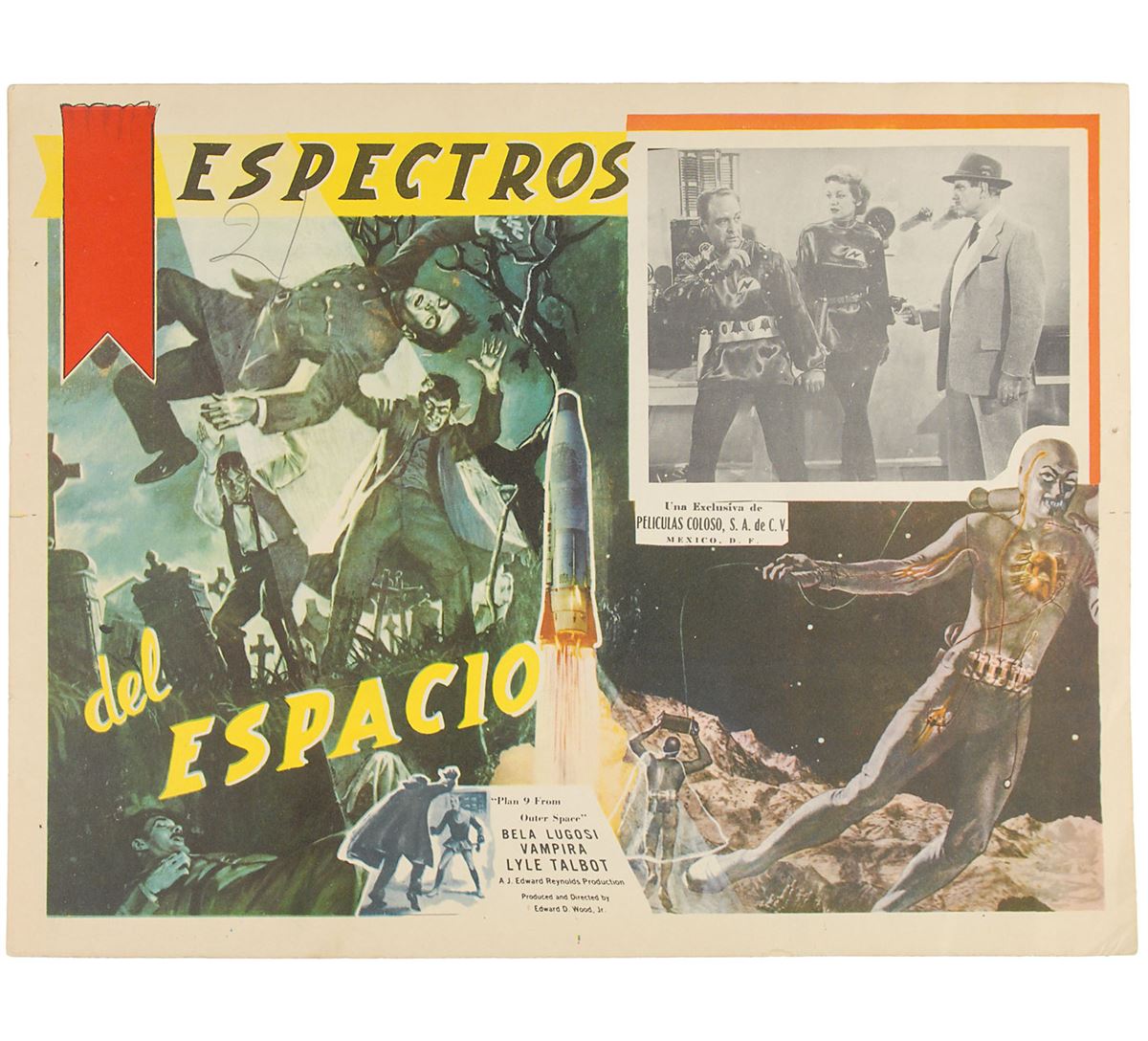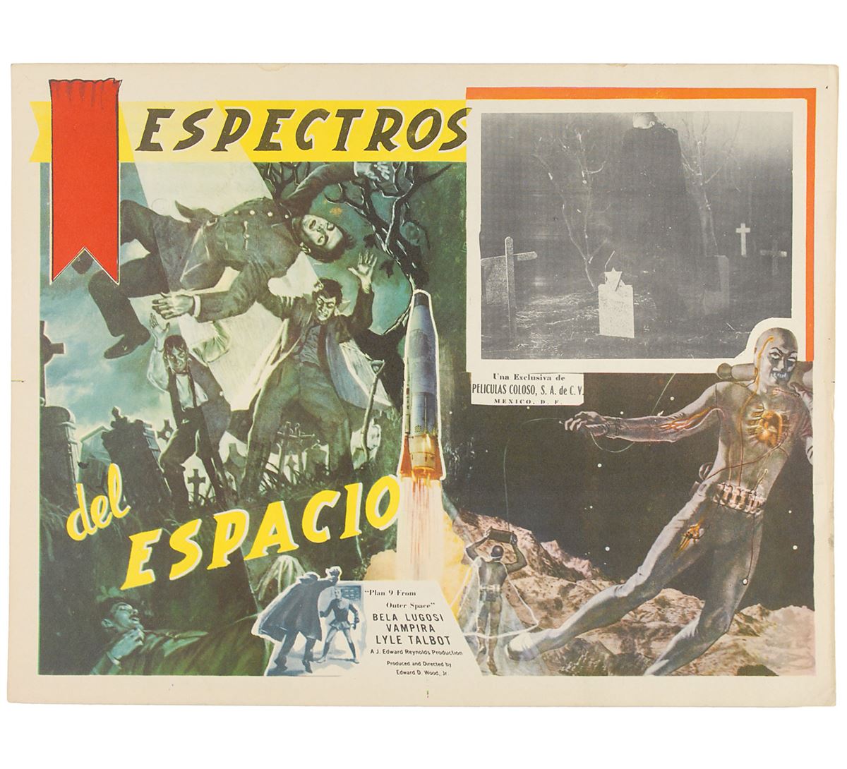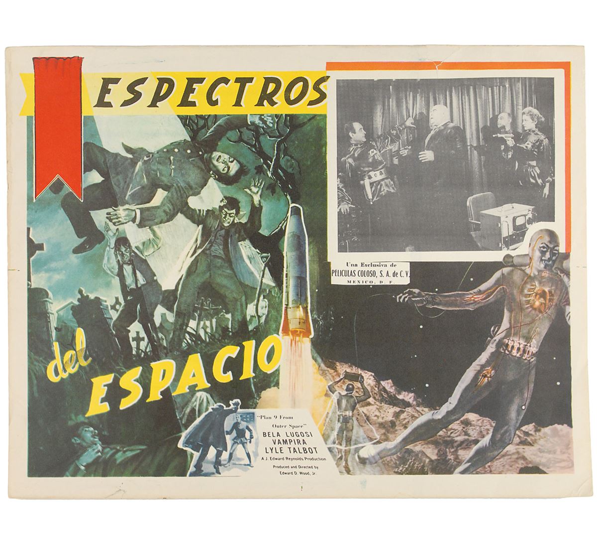 Plan 9 from Outer Space/Espectros del Espacio (Peliculas Coloso, Mexico). Set of eight lobby cards (16.25 x 12.5). Classic science-fiction thriller starring Gregory Walcott, Mona McKinnon, Tor Johnson, Vampira, and Bela Lugosi in what has been famously called the ‘worst movie ever made.’ The eight lobby cards feature the same main color image and have different scenes from the film in the upper right. Light scattered creases, various small tack and staple holes, and ballpoint and pencil notations to two cards, otherwise overall fine condition. The James Collings Collection.