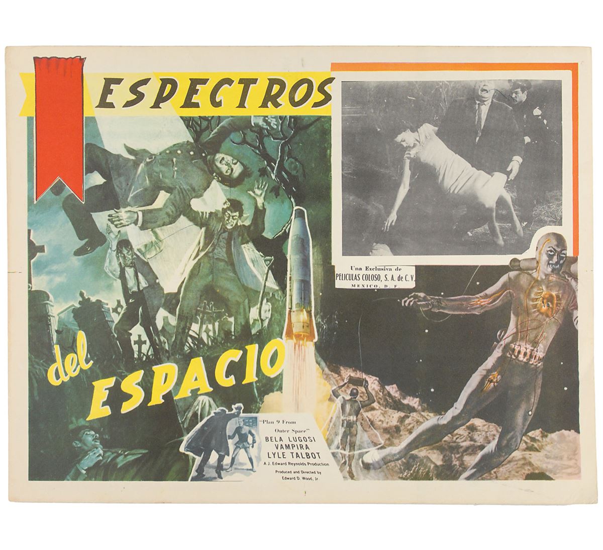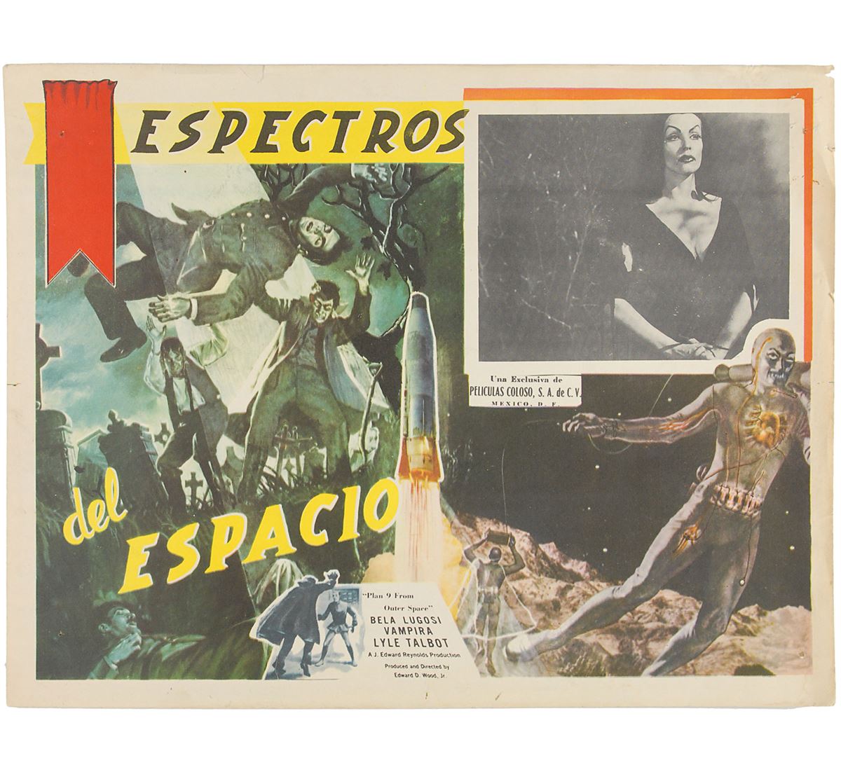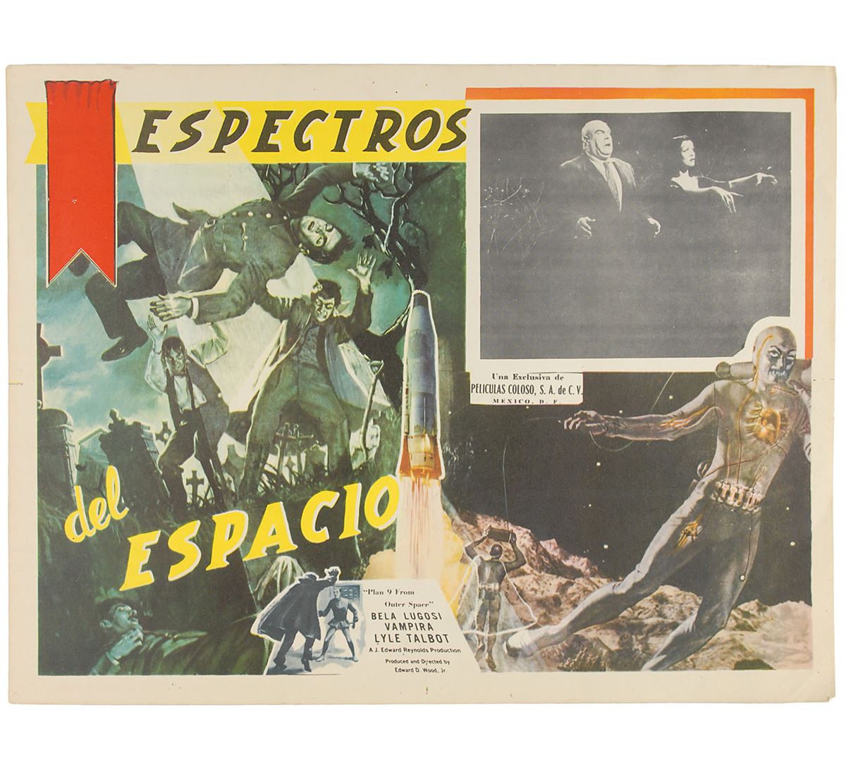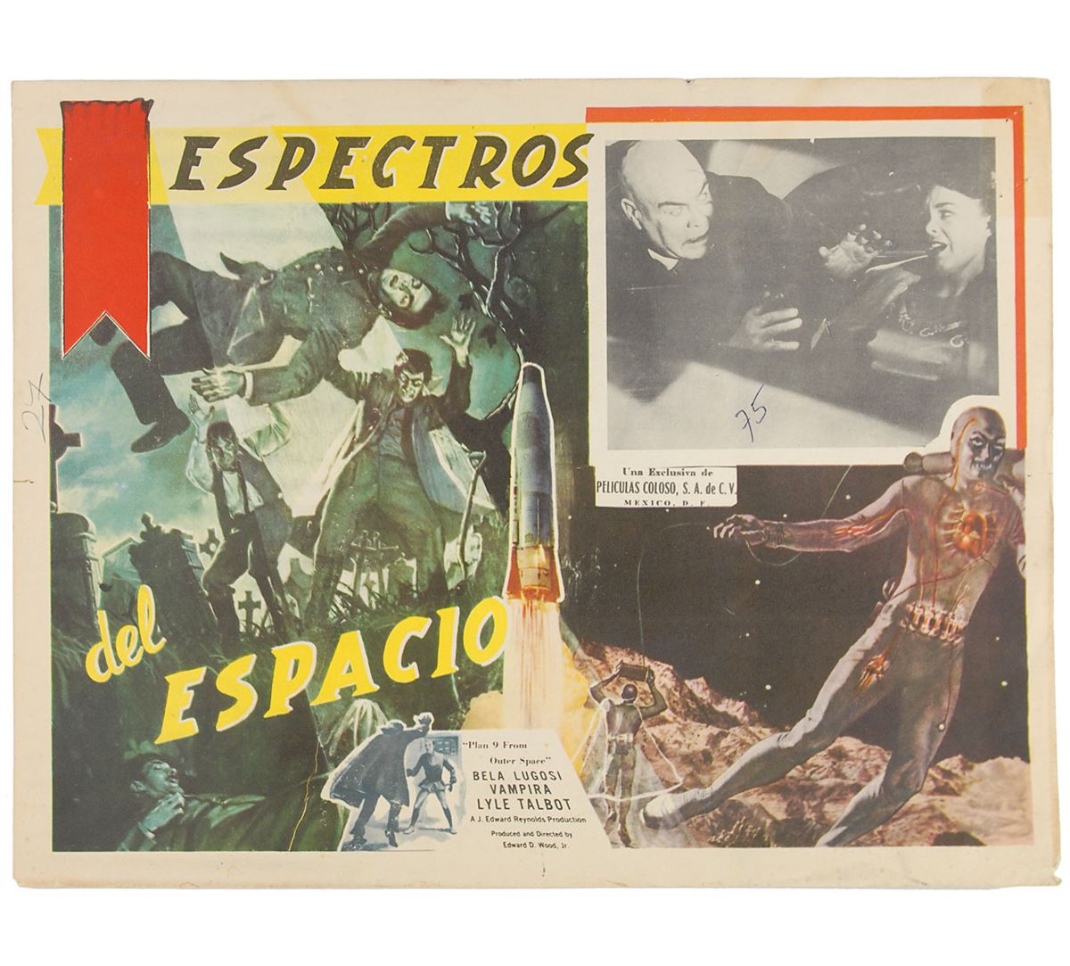 Plan 9 from Outer Space/Espectros del Espacio (Peliculas Coloso, Mexico). Set of eight lobby cards (16.25 x 12.5). Classic science-fiction thriller starring Gregory Walcott, Mona McKinnon, Tor Johnson, Vampira, and Bela Lugosi in what has been famously called the ‘worst movie ever made.’ The eight lobby cards feature the same main color image and have different scenes from the film in the upper right. Light scattered creases, various small tack and staple holes, and ballpoint and pencil notations to two cards, otherwise overall fine condition. The James Collings Collection.
