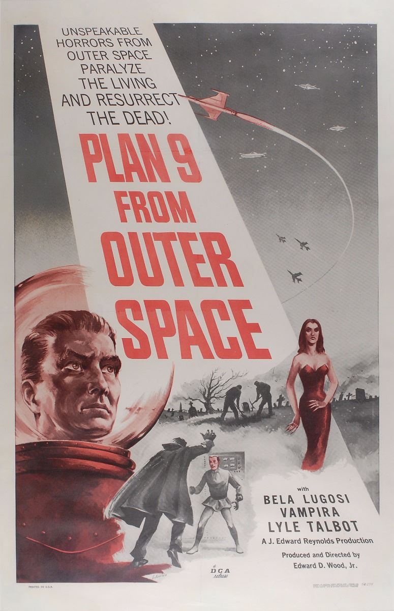 Plan 9 from Outer Space (DCA, 1958). One sheet movie poster (27 x 41). Classic science-fiction thriller starring Gregory Walcott, Mona McKinnon, Tor Johnson, Vampira, and Bela Lugosi in what has been famously called the ‘worst movie ever made,’ telling the story of extraterrestrial beings who are seeking to stop humanity from creating a doomsday weapon that would destroy the universe. Matted and framed to an overall size of 28.5 x 43.5. Oversized. Professionally restored to fine condition. Written, produced, directed, and edited by Ed Wood, the enduring classic posthumously features Bela Lugosi, using footage he had shot for a different film prior to Lugosi’s death in 1956. Dramatically designed and eminently displayable, this is an exceptionally desirable science-fiction piece.