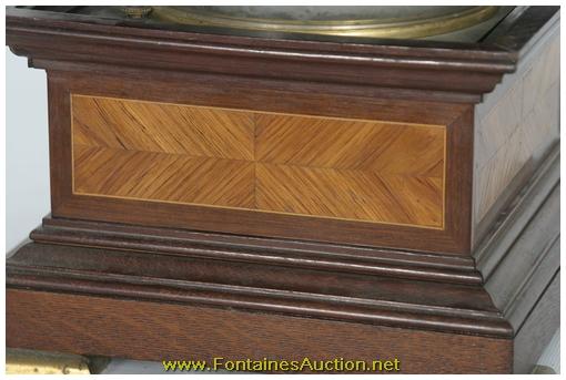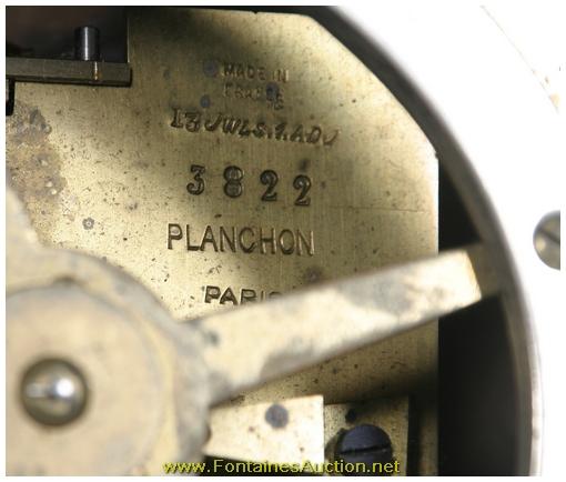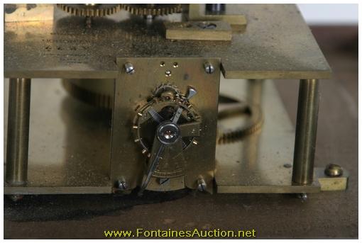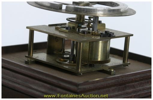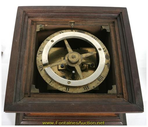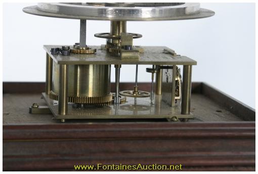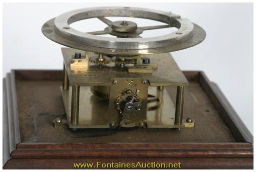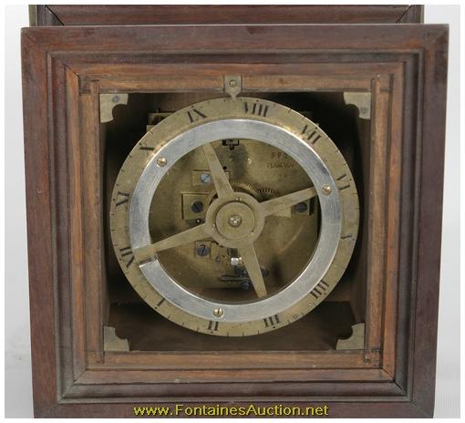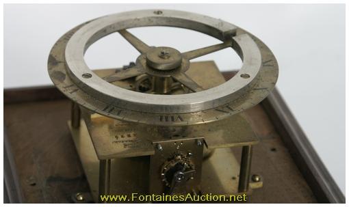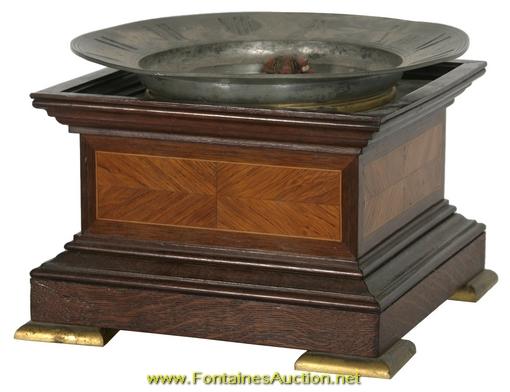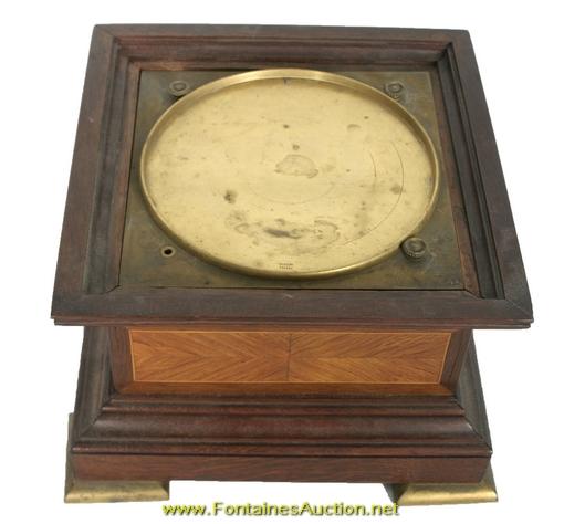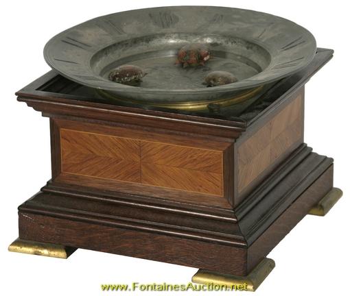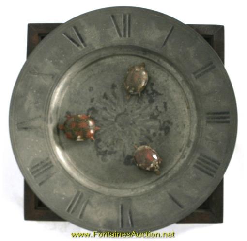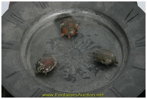 Planchon Floating Turtle Mystery Clock. Circa 1859, Paris. The removable 9 1/4" pewter tray has incised black roman numerals on the chapter ring with decorated half hour markers, a small painted wood turtle floats in the tray indicating the time. The movement is set in a walnut square case w/ gilt bronze feet and under-tray. 13 jewel adjusted movement w/ silvered lever platform escapement, balance shows good brisk motion. Signed and numbered "3822". This clock runs with one turtle, the image shows that this lot includes 2 extra turtles, each is in overall good condition with some minor plaint loss. 7"H x 9.25"D. Estimated Value$1,000 - 1,500.
