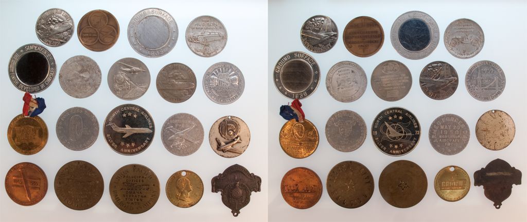 (Lot of 19) 1.) Northrop Armed Forces Day 1950 // F-89 SCORPIAN (aluminium) 2.) WINDSOR LOCKS CONN. 100th Anv. 3.) NORTH CENTRAL AIRLINES / SILVER ANV. 1973 4.) WORLD'S FAIR N. Y. 1940 (holed) 5.) Dayton, Ohio Aircraft Show / Northrop F-89D 1954 6.) TWA 1929 40TH Anv. (trans-continental rail-air service) 7.) Two United Airline Tokens - 25th Anv. 1951 8.) Group of 6 Train Tokens- Union Pacific R/R- Golden Spike Centennial (copper) / Silver City Saloon (brass) holed / R/R with Star on reverse (brass) holed / S. F. Expo 1939 (aluminium) / TRANS-MISSISSIPPI COMMERCIAL CONGRESS ( unique shape token) holed / Rock Island R/R 1922 (holed w ribbon 9.) 4 Automotive Tokens- General Dual 8 Tire (aluminium) / HUDSON 40YRS 1909-1949 (aluminium) / CHRYSLER SUPERFINISH 1939 (two tokens) / Crown Gasolines-Motor Oils (holed)