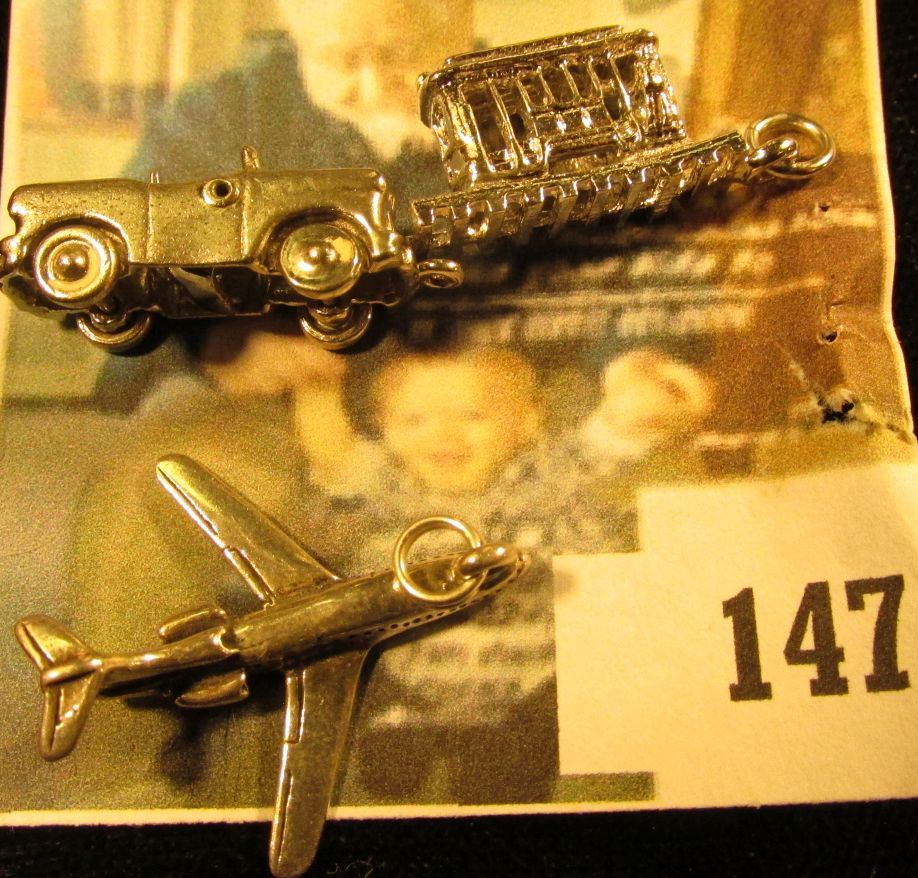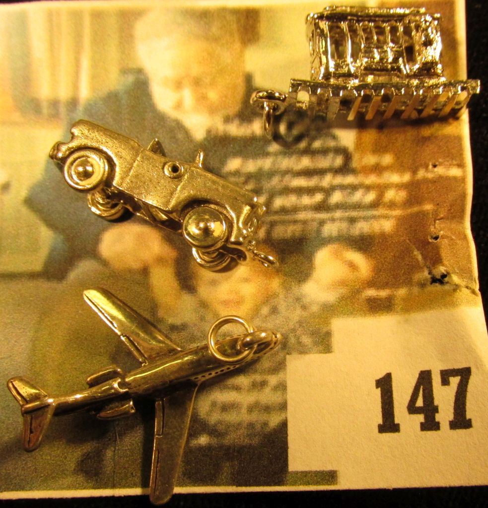 Planes, Trains and Automobiles! 3 sterling charms – a jet, a trolley car, and a convertible car (the top actually goes up and down), 9.7 g / 6.3 dwt