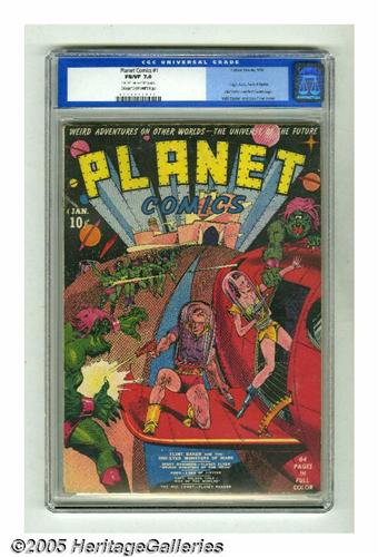 <B>Planet Comics #1 (Fiction House, 1940) CGC FN/VF 7.0 Cream to off-white pages.</B></I> Two of the all-time great Golden Age artists, Will Eisner and Lou Fine, combine talents on the cover of the premiere issue of this legendary title. Beautiful colors on the cover, and the grade looks even better when you check CGC's census for the issue. Only two unrestored copies have earned grades higher than VF 8.0 to date. Auro, Lord of Jupiter, begins with this issue, along with Flint Baker and the Red Comet. CGC notes, "1 1/2 inch tear on 1st seven pages." Overstreet 2005 FN 6.0 value = $3,264; VF 8.0 value = $8,160. CGC census 3/05: 2 in 7.0, 5 higher.