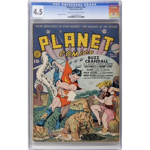 <B>Planet Comics #14 (Fiction House, 1941) CGC VG+ 4.5 Cream to off-white pages.</B></I> Dan Zolnerowich's covers coaxed countless dimes from young boys -- men, too, for that matter! Interior artists included Don Rico and George Appel. Super-tough issue to find -- we've offered a copy on only two previous occasions. And a copy better than FN 6.0 may be one-of-a-kind! Overstreet 2006 VG 4.0 value = $308. CGC census 3/07: 1 in 4.5, 2 higher. <I> From the Cary and Cheryl Porter Collection.</B></I><BR><BR><b>Shipping:</b> Comics - Slabbed (certified) (<a target="_blank" href="http://www.heritageauctions.com/common/shipping.php">view shipping information</a>)