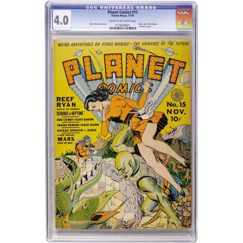 <B>Planet Comics #15 (Fiction House, 1941) CGC VG 4.0 Cream to off-white pages.</B></I> This is the scarcest issue of the series according to <B>Overstreet's Comic Book Quarterly</B></I>, and the <B>Photo-Journal</B></I> and the Overstreet price guide both call the issue "scarce" as well. Indeed, this is just the fourth unrestored copy to be certified by CGC. More importantly, it trails only one 5.0 specimen as the highest-graded unrestored copy, and in fact, we'd say this book looks awfully nice for the assigned VG grade. Dan Zolnerowich is the cover artist. Overstreet 2006 VG 4.0 value = $638. CGC census 3/07: 1 in 4.0, 1 higher.<BR><BR><b>Shipping:</b> Comics - Slabbed (certified) (<a target="_blank" href="http://www.heritageauctions.com/common/shipping.php">view shipping information</a>)