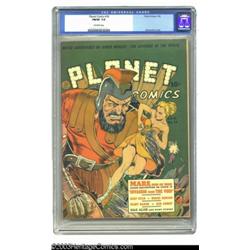 Planet Comics #16 (Fiction House, 1942) CGC FN/VF 7.0 Off-white pages. Dan Zolnerowich delivers another irresistible cover featuring Mars, God of War, loosing destruction on Earth in a story entitled "Invasion from the Void." One look at this cover and you can't help but give up your dime; that is, if you're living in 1942. The price has gone up, especially for such a nice specimen. But, doggone it -- it's worth it! There are currently only two copies of this issue that have been graded higher by CGC. Overstreet 2003 FN 6.0 value = $395; VF 8.0 value = $825. Important notice: Heritage usually auctions material at the rate of 200-250 lots per hour. On some occasions eBay Live bid software or the Internet may not be able to keep up with the pace of the auction. We recommend placing a realistic absentee bid now as insurance to avoid disappointment. Occasionally the auctioneer may eliminate or reject an eBay Live bid, and the auctioneer may also reopen a lot after the close of the eBay live bidding (usually because we missed an audience bid), and may reject your bid even if it shows you as the winning bidder. By bidding via eBay Live, you agree that Heritage may award the lot to another bidder at its sole discretion under the circumstances described above or any other reasonable circumstances. Also please note that all Heritage lots purchased through eBay Live carry a 20% Buyer's Premium. Please make sure you read the Terms and Conditions before you bid.