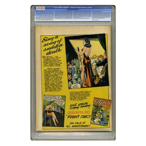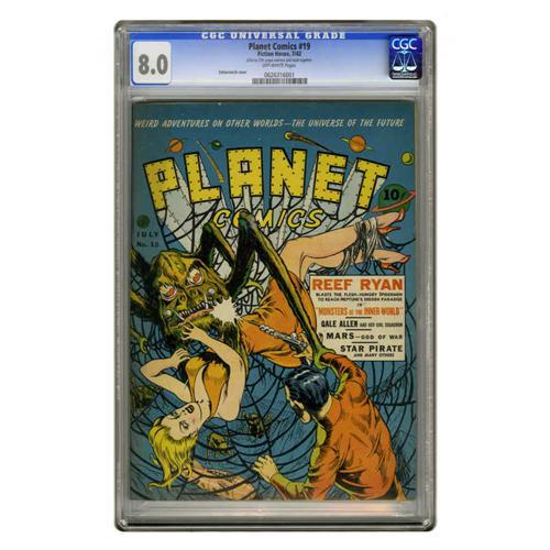 <B>Planet Comics #19 (Fiction House, 1942) CGC VF 8.0 Off-white pages.</B></I> If spiders give you the creepy-crawlies, you might not want to look at this wild Dan Zolnerowich cover! But if "good girl" art in a strange bondage situation appeals to you, check this one out! This copy is quite attractive, with wonderfully flat surfaces and a smooth spine. CGC notes, "22nd to 27th pages siamese and stuck together." Overstreet 2005 VF 8.0 value = $856. CGC census 12/05: 2 in 8.0, 2 higher.