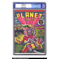 Planet Comics #2 (Fiction House, 1940) CGC FN/VF 7.0 Cream to off-white pages. Scarce in any grade, this issue of Planet Comics has the well-deserved reputation of being the most difficult to find of the entire run. No one drew finer than Lou Fine, as you will clearly see when you look at this spectacular cover. This is the second-highest graded copy certified to date by CGC, so don't miss the opportunity to add this choice piece to your collection. Overstreet 2002 FN 6.0 value = $1,250; VF 8.0 value = $2,604. Important notice: We expect to be auctioning lots at the rate of 200-250 per hour. Sometimes eBay Premier live bid software cannot keep up with that pace, so we strongly recommend that you place a realistic proxy bid now as insurance to avoid disappointment. Also please note that all Heritage/CAA lots purchased through eBay Premier carry a 20% Buyer's Premium. Please make sure you read the Terms and Conditions.