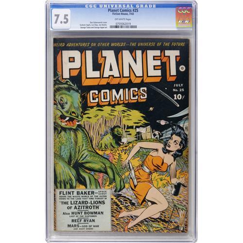 <B>Planet Comics #25 (Fiction House, 1943) CGC VF- 7.5 Off-white pages.</B></I> Dan Zolnerowich's sci-fi/babe cover was supported by equally finely-rendered story art in this issue by Graham Ingels, Lee Elias, Joe Doolin, George Tuska, and George Appel. Overstreet 2006 VF 8.0 value = $819. CGC census 3/07: 1 in 7.5, 4 higher. <I> From the Cary and Cheryl Porter Collection.</B></I><BR><BR><b>Shipping:</b> Comics - Slabbed (certified) (<a target="_blank" href="http://www.heritageauctions.com/common/shipping.php">view shipping information</a>)