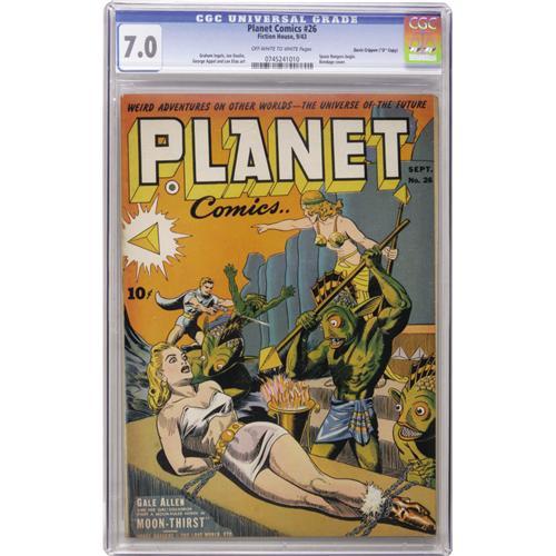 <B>Planet Comics #26 Davis Crippen ("D" Copy) pedigree (Fiction House, 1943) CGC FN/VF 7.0 Off-white to white pages.</B></I> Joe Doolin succeeded Dan Zolnerowich as the main cover artist with this issue, and was responsible for some of the more memorable interplanetary "good girl" covers of the Golden Age, not the least of which is this bondage scene featuring Gale Allen. Also in this issue, Flint Baker who had been around since #1 merged with the Reef Ryan feature to form the Space Rangers, who would appear in almost the entire remaining run of the series. Overstreet 2006 FN 6.0 value = $393; VF 8.0 value = $819. CGC census 9/06: 1 in 7.0, 5 higher. <I>From the Crippen Collection.</B></I><BR><BR><b>Shipping:</b> Slabbed Comic (<a target="_blank" href="http://www.heritageauctions.com/common/shipping.php">view shipping information</a>)