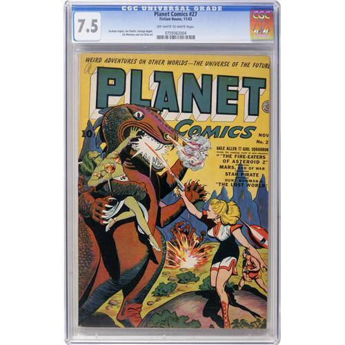 <B>Planet Comics #27 (Fiction House, 1943) CGC VF- 7.5 Off-white to white pages.</B></I> Joe Doolin's second cover for the title showed he was a worthy successor to Dan Zolnerowich. Doolin also provided interior art, as did Graham Ingels, Jim Mooney, Lee Elias, and George Appel. Overstreet 2006 VF 8.0 value = $650. CGC census 3/07: 2 in 7.5, 4 higher. <I> From the Cary and Cheryl Porter Collection.</B></I><BR><BR><b>Shipping:</b> Comics - Slabbed (certified) (<a target="_blank" href="http://www.heritageauctions.com/common/shipping.php">view shipping information</a>)