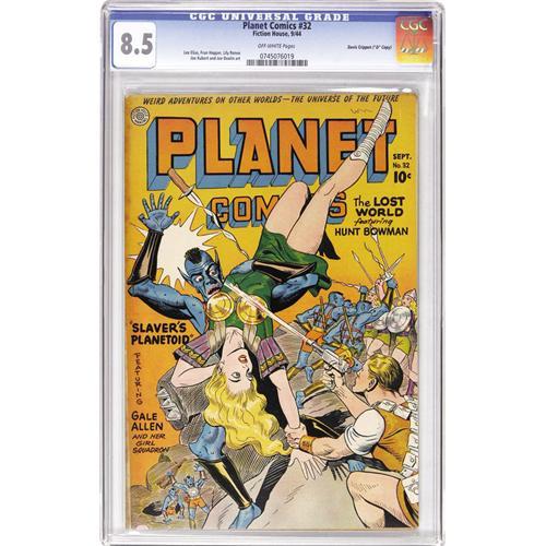 <B>Planet Comics #32 Davis Crippen ("D" Copy) pedigree (Fiction House, 1944) CGC VF+ 8.5 Off-white pages.</B></I> Scintillating cover art from a relatively unsung Golden Age master, Joe Doolin. Like the more famous Alex Schomburg, Doolin became a specialist, his covers becoming the "look" of most of the Fiction House titles for years. The interior artwork was provided by Doolin, Lee Elias, Fran Hopper, Lily Renee, and Joe Kubert. Lots of color on this nice copy - CGC has only certified two copies nicer than VF/NM 9.0 to date. Overstreet 2006 VF 8.0 value = $544; VF/NM 9.0 value = $860. CGC census 7/06: 1 in 8.5, 5 higher. <I>From the Crippen Collection</B></I>. <BR><BR><B>Important notice:</B> Heritage usually auctions material at the rate of 200-250 lots per hour. On some occasions eBay Live bid software or the Internet may not be able to keep up with the pace of the auction. We recommend placing a realistic absentee bid now as insurance to avoid disappointment. Occasionally the auctioneer may eliminate or reject an eBay Live bid, and the auctioneer may also reopen a lot after the close of the eBay live bidding (usually because we missed an audience bid), and may reject your bid even if it shows you as the winning bidder. By bidding via eBay Live, you agree that Heritage may award the lot to another bidder at its sole discretion under the circumstances described above or any other reasonable circumstances. Since eBay bids are not shown to us until we open the lot on the floor, we treat those bids just like floor bids. In most cases the floor responds before the eBay bid is presented to us, due to Internet lag time, so for consistency we have made it a policy that floor bids are always considered first over tie eBay live bids. Also please note that all Heritage lots purchased through eBay Live carry a 22.5% Buyer's Premium. Please make sure you read the Terms and Conditions before you bid. This lot is being auctioned in conjunction with a live floor auction by Heritage Auction Galleries. All final auction and invoice information will be supplied by Heritage Auction Galleries, and all other information should be considered preliminary. Lot:41001 <BR><BR><B>Winning Notification and Billing:</B> After the FINAL session in this auction is complete, Heritage will send e-mail and snail mail invoices. This process normally takes several days. All final auction and invoice information will be supplied by Heritage Auction Galleries, and all other information should be considered preliminary. <BR><BR>This auction will be conducted on a live auction floor and over the Internet through eBay Live. If you choose to place an absentee bid, please take a moment to <font color='#0000ff'><u><a href='http://pages.ebay.com/liveauctions/help/before/laabsentee.html'>learn how eBay Live absentee bidding works</a></u></font><font color='#000000'>