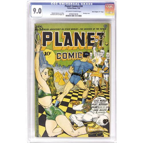 <B>Planet Comics #34 Davis Crippen ("D" Copy) pedigree (Fiction House, 1945) CGC VF/NM 9.0 Off-white to white pages.</B></I> There's no shortage of exposed skin on this bondage cover... as if you didn't notice! The good guy on this cover scene (by an unknown artist) is Space Ranger Flint Baker. Overstreet 2006 VF/NM 9.0 value = $860; NM- 9.2 value = $1,175. CGC census 6/06: 2 in 9.0, none higher. <I>From the Crippen Collection.</B></I> <BR><BR><B>Important notice:</B> Heritage usually auctions material at the rate of 200-250 lots per hour. On some occasions eBay Live bid software or the Internet may not be able to keep up with the pace of the auction. We recommend placing a realistic absentee bid now as insurance to avoid disappointment. Occasionally the auctioneer may eliminate or reject an eBay Live bid, and the auctioneer may also reopen a lot after the close of the eBay live bidding (usually because we missed an audience bid), and may reject your bid even if it shows you as the winning bidder. By bidding via eBay Live, you agree that Heritage may award the lot to another bidder at its sole discretion under the circumstances described above or any other reasonable circumstances. Since eBay bids are not shown to us until we open the lot on the floor, we treat those bids just like floor bids. In most cases the floor responds before the eBay bid is presented to us, due to Internet lag time, so for consistency we have made it a policy that floor bids are always considered first over tie eBay live bids. Also please note that all Heritage lots purchased through eBay Live carry a 22.5% Buyer's Premium. Please make sure you read the Terms and Conditions before you bid. This lot is being auctioned in conjunction with a live floor auction by Heritage Auction Galleries. All final auction and invoice information will be supplied by Heritage Auction Galleries, and all other information should be considered preliminary. Lot:41001 <BR><BR><B>Winning Notification and Billing:</B> After the FINAL session in this auction is complete, Heritage will send e-mail and snail mail invoices. This process normally takes several days. All final auction and invoice information will be supplied by Heritage Auction Galleries, and all other information should be considered preliminary. <BR><BR>This auction will be conducted on a live auction floor and over the Internet through eBay Live. If you choose to place an absentee bid, please take a moment to <font color='#0000ff'><u><a href='http://pages.ebay.com/liveauctions/help/before/laabsentee.html'>learn how eBay Live absentee bidding works</a></u></font><font color='#000000'>