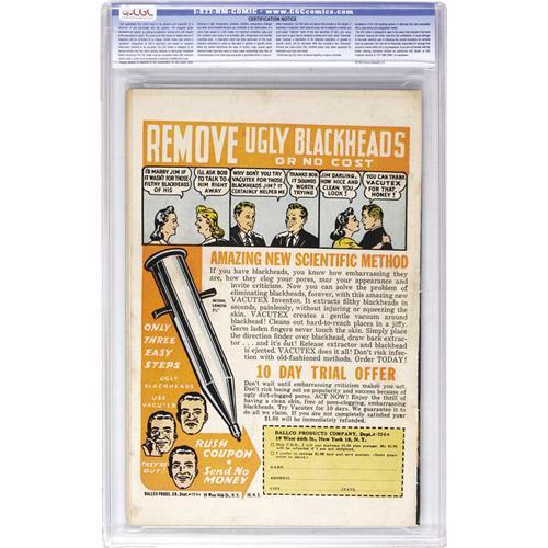 <B>Planet Comics #36 (Fiction House, 1945) CGC VF+ 8.5 Off-white to white pages.</B></I> Joe Doolin's jolly green space giant cover reminds us to eat our veggies and to bid on this great black cover issue. Only a few books have been graded higher in the current CGC census than our copy. Stories feature Gale Allen, Star Pirate, and Mars, God of War. Interior art contributers are Doolin, Murphy Anderson, Fran Hopper, Lily Renee, and Lee Elias. Overstreet 2006 VF 8.0 value = $500; VF/NM 9.0 value = $788. CGC census 7/06: 1 in 8.5, 3 higher. <BR><BR><B>Important notice:</B> Heritage usually auctions material at the rate of 200-250 lots per hour. On some occasions eBay Live bid software or the Internet may not be able to keep up with the pace of the auction. We recommend placing a realistic absentee bid now as insurance to avoid disappointment. Occasionally the auctioneer may eliminate or reject an eBay Live bid, and the auctioneer may also reopen a lot after the close of the eBay live bidding (usually because we missed an audience bid), and may reject your bid even if it shows you as the winning bidder. By bidding via eBay Live, you agree that Heritage may award the lot to another bidder at its sole discretion under the circumstances described above or any other reasonable circumstances. Since eBay bids are not shown to us until we open the lot on the floor, we treat those bids just like floor bids. In most cases the floor responds before the eBay bid is presented to us, due to Internet lag time, so for consistency we have made it a policy that floor bids are always considered first over tie eBay live bids. Also please note that all Heritage lots purchased through eBay Live carry a 22.5% Buyer's Premium. Please make sure you read the Terms and Conditions before you bid. This lot is being auctioned in conjunction with a live floor auction by Heritage Auction Galleries. All final auction and invoice information will be supplied by Heritage Auction Galleries, and all other information should be considered preliminary. Lot:41001 <BR><BR><B>Winning Notification and Billing:</B> After the FINAL session in this auction is complete, Heritage will send e-mail and snail mail invoices. This process normally takes several days. All final auction and invoice information will be supplied by Heritage Auction Galleries, and all other information should be considered preliminary. <BR><BR>This auction will be conducted on a live auction floor and over the Internet through eBay Live. If you choose to place an absentee bid, please take a moment to <font color='#0000ff'><u><a href='http://pages.ebay.com/liveauctions/help/before/laabsentee.html'>learn how eBay Live absentee bidding works</a></u></font><font color='#000000'>
