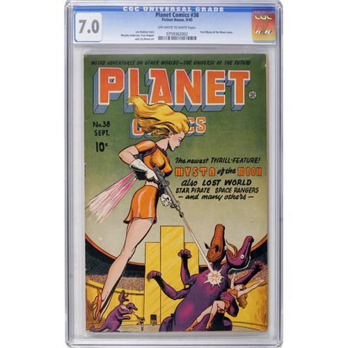 <B>Planet Comics #38 (Fiction House, 1945) CGC FN/VF 7.0 Off-white to white pages.</B></I> Mysta of the Moon makes her first cover appearance here, courtesy of artist Joe Doolin. Murphy Anderson, Fran Hopper, and Lily Renee provide story art. Overstreet 2006 FN 6.0 value = $261; VF 8.0 value = $544. CGC census 3/07: 1 in 7.0, 7 higher. <I> From the Cary and Cheryl Porter Collection.</B></I><BR><BR><b>Shipping:</b> Comics - Slabbed (certified) (<a target="_blank" href="http://www.heritageauctions.com/common/shipping.php">view shipping information</a>)
