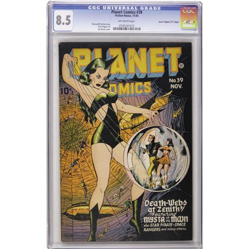 <B>Planet Comics #39 Davis Crippen ("D" Copy) pedigree (Fiction House, 1945) CGC VF+ 8.5 Off-white pages.</B></I> This is the nicest copy we've ever offered of this issue. Mysta of the Moon made her second cover appearance here, though all eyes are on her plus-size adversary! Lily Renee's signature graces the cover art. Meanwhile, the series' earlier cover heroes like Gale Allen, Flint Baker, and Hunt Bowman continue their adventuring inside the issue. Overstreet 2006 VF 8.0 value = $500; VF/NM 9.0 value = $788. CGC census 9/06: 2 in 8.5, 2 higher. <I>From the Crippen Collection.</B></I><BR><BR><b>Shipping:</b> Slabbed Comic (<a target="_blank" href="http://www.heritageauctions.com/common/shipping.php">view shipping information</a>)