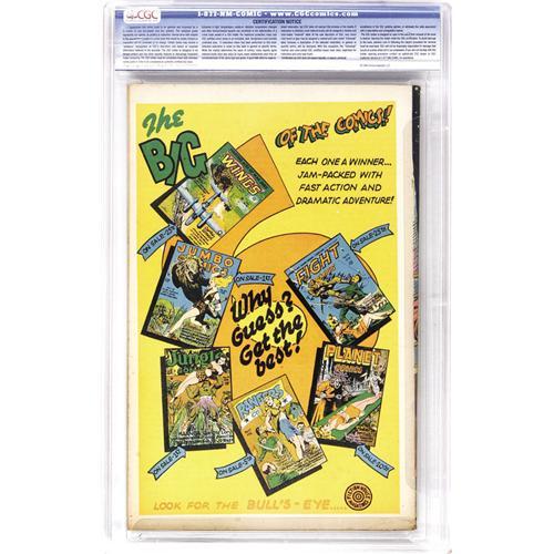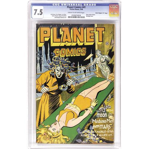 <B>Planet Comics #41 Davis Crippen ("D" Copy) pedigree (Fiction House, 1946) CGC VF- 7.5 Cream to off-white pages.</B></I> There are some awfully creepy goings-on on this bondage cover! Lily Renee and Murphy Anderson contributed interior art. Inside, Auro, Lord of Jupiter, returned to the title after a two-year absence. Overstreet 2006 VF 8.0 value = $500. CGC census 6/06: 3 in 7.5, 7 higher. <I>From the Crippen Collection.</B></I> <BR><BR><B>Important notice:</B> Heritage usually auctions material at the rate of 200-250 lots per hour. On some occasions eBay Live bid software or the Internet may not be able to keep up with the pace of the auction. We recommend placing a realistic absentee bid now as insurance to avoid disappointment. Occasionally the auctioneer may eliminate or reject an eBay Live bid, and the auctioneer may also reopen a lot after the close of the eBay live bidding (usually because we missed an audience bid), and may reject your bid even if it shows you as the winning bidder. By bidding via eBay Live, you agree that Heritage may award the lot to another bidder at its sole discretion under the circumstances described above or any other reasonable circumstances. Since eBay bids are not shown to us until we open the lot on the floor, we treat those bids just like floor bids. In most cases the floor responds before the eBay bid is presented to us, due to Internet lag time, so for consistency we have made it a policy that floor bids are always considered first over tie eBay live bids. Also please note that all Heritage lots purchased through eBay Live carry a 22.5% Buyer's Premium. Please make sure you read the Terms and Conditions before you bid. This lot is being auctioned in conjunction with a live floor auction by Heritage Auction Galleries. All final auction and invoice information will be supplied by Heritage Auction Galleries, and all other information should be considered preliminary. Lot:41001 <BR><BR><B>Winning Notification and Billing:</B> After the FINAL session in this auction is complete, Heritage will send e-mail and snail mail invoices. This process normally takes several days. All final auction and invoice information will be supplied by Heritage Auction Galleries, and all other information should be considered preliminary. <BR><BR>This auction will be conducted on a live auction floor and over the Internet through eBay Live. If you choose to place an absentee bid, please take a moment to <font color='#0000ff'><u><a href='http://pages.ebay.com/liveauctions/help/before/laabsentee.html'>learn how eBay Live absentee bidding works</a></u></font><font color='#000000'>